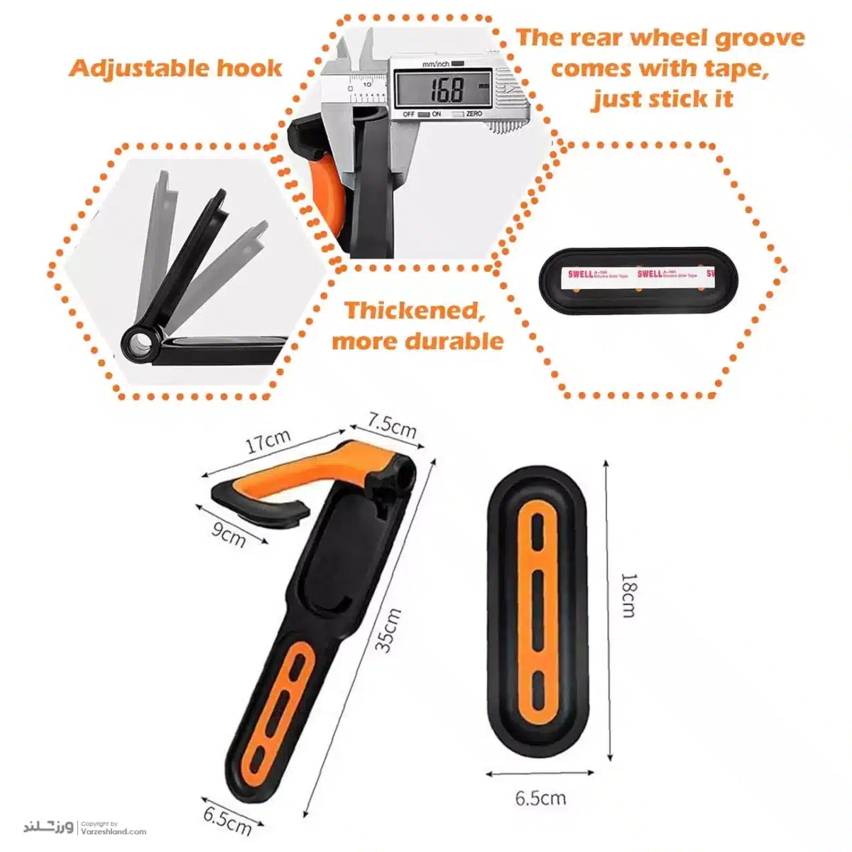 طراحی هوشمندانه و نصب آسان، همراه با صفحهی محافظ زیرین برای جلوگیری از تماس چرخ با دیوار، آن را مناسب آپارتمانها، پارکینگها و فروشگاهها کرده است. ترکیب رنگ مشکی و نارنجی جلوهای مدرن به این استند میبخشد.