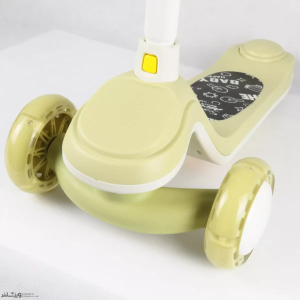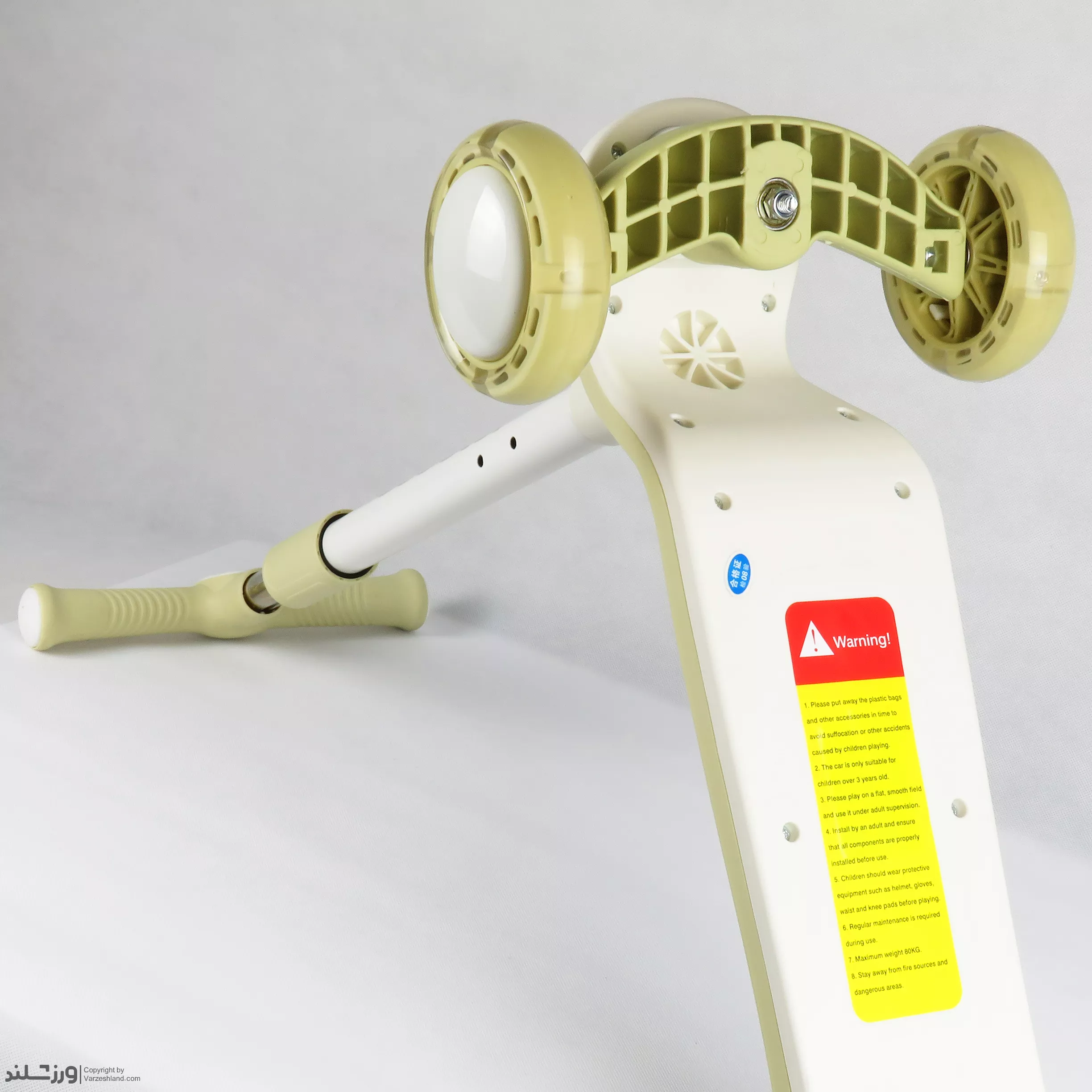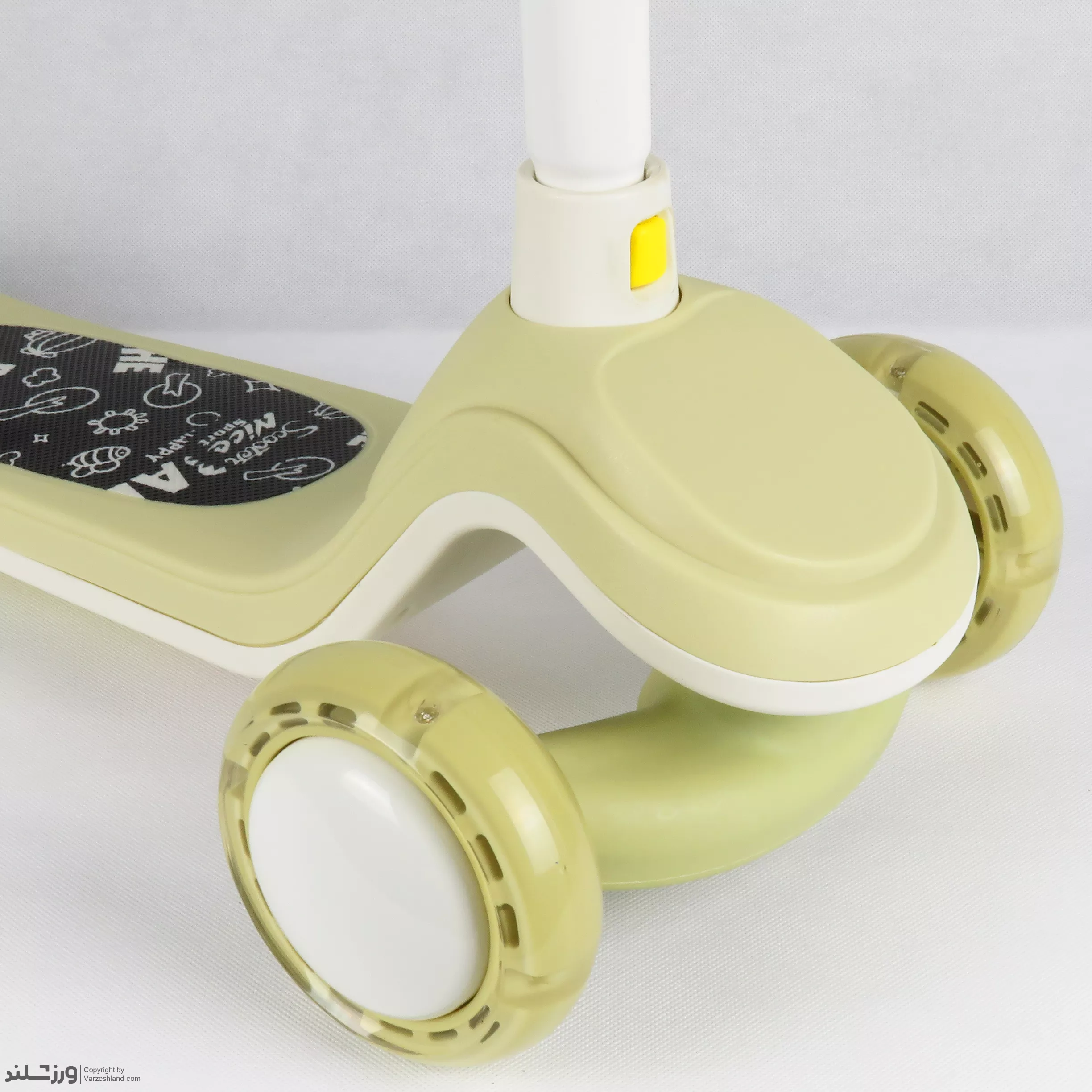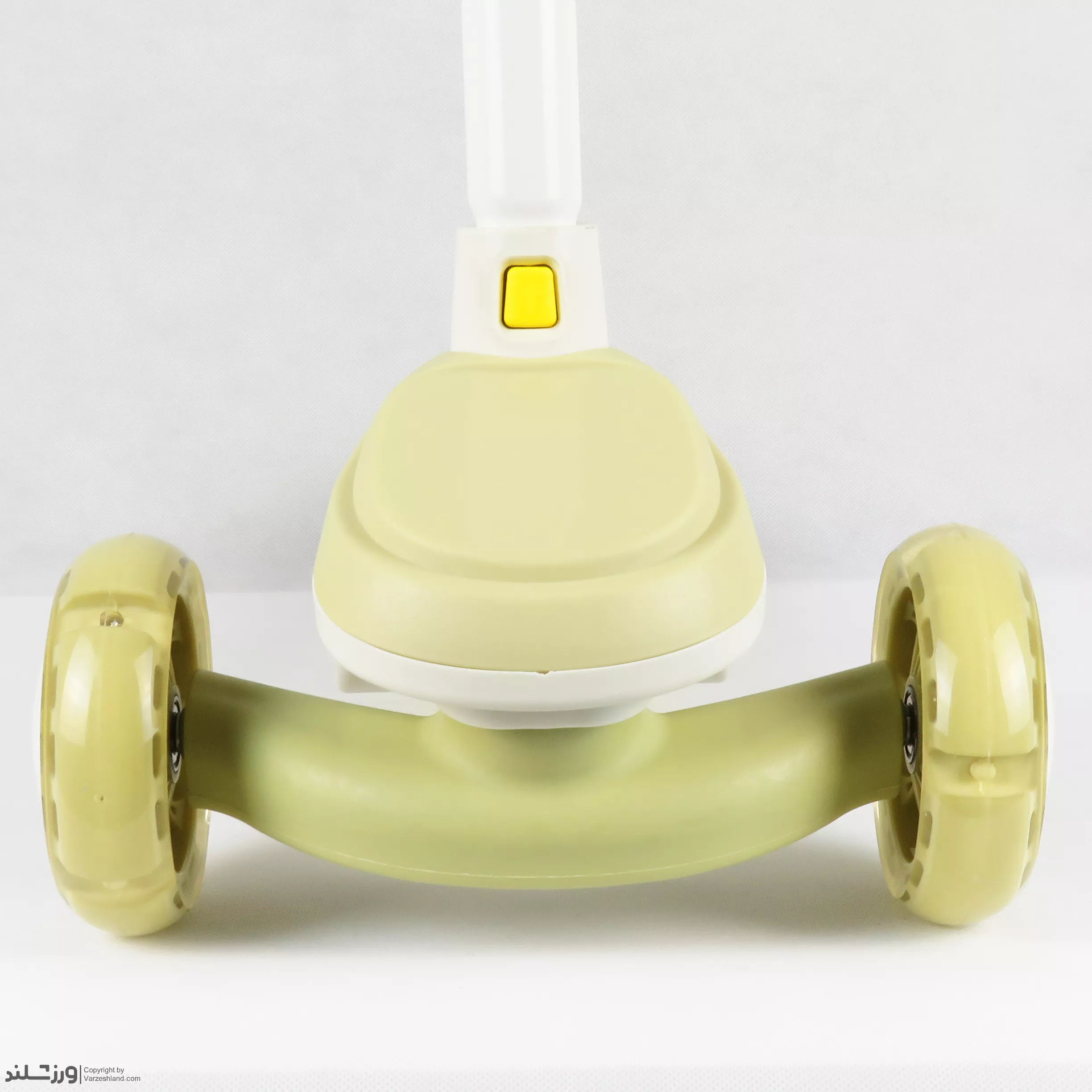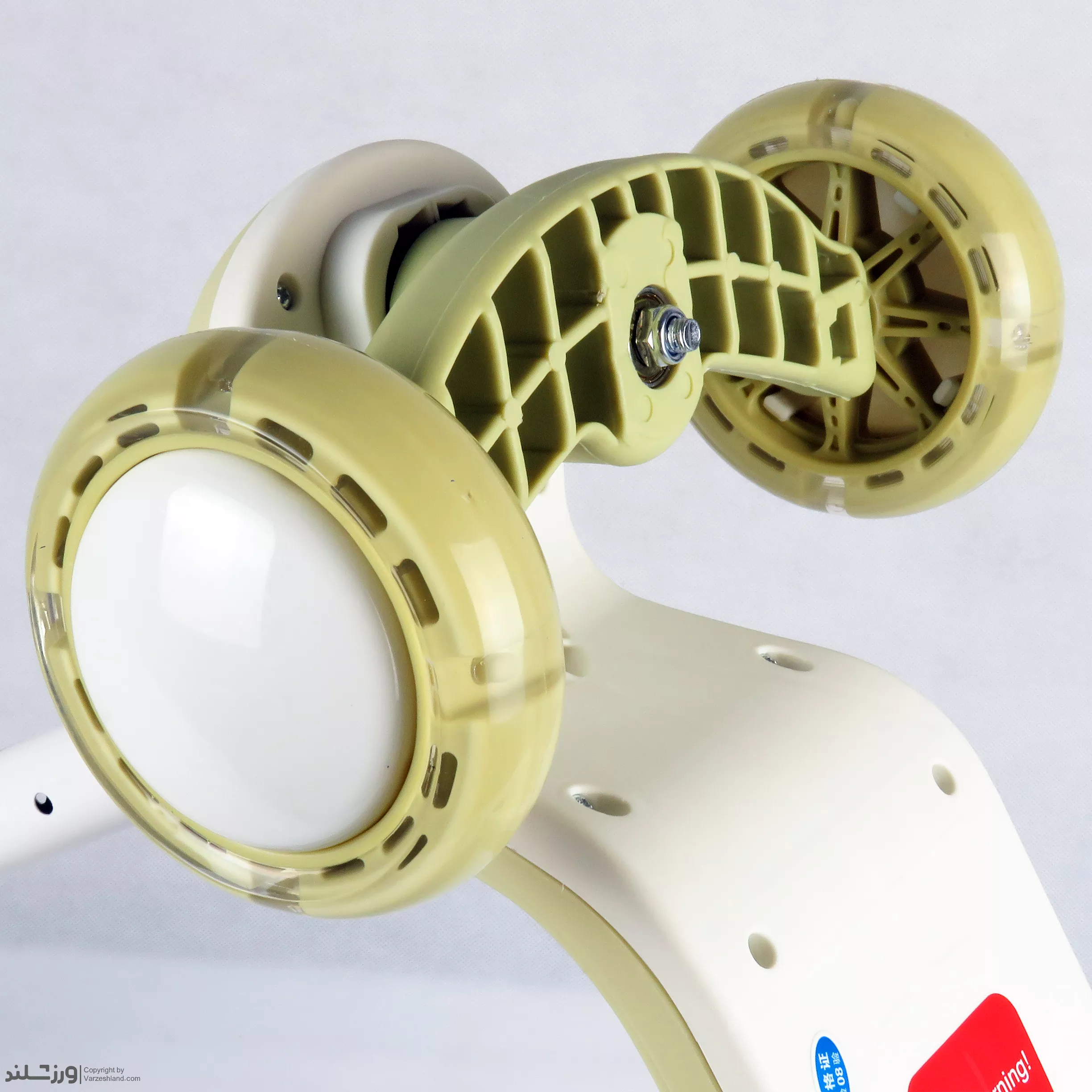 چرخ های جلویی از نوع PU چراغ دار هستند که هنگام حرکت روشن می شوند و نورهای رنگی زیبایی از خود منتشر میکنند. این ویژگی باعث میشود کودک حتی در هنگام غروب یا شب از بازی با اسکوتر لذت بیشتری ببرد.