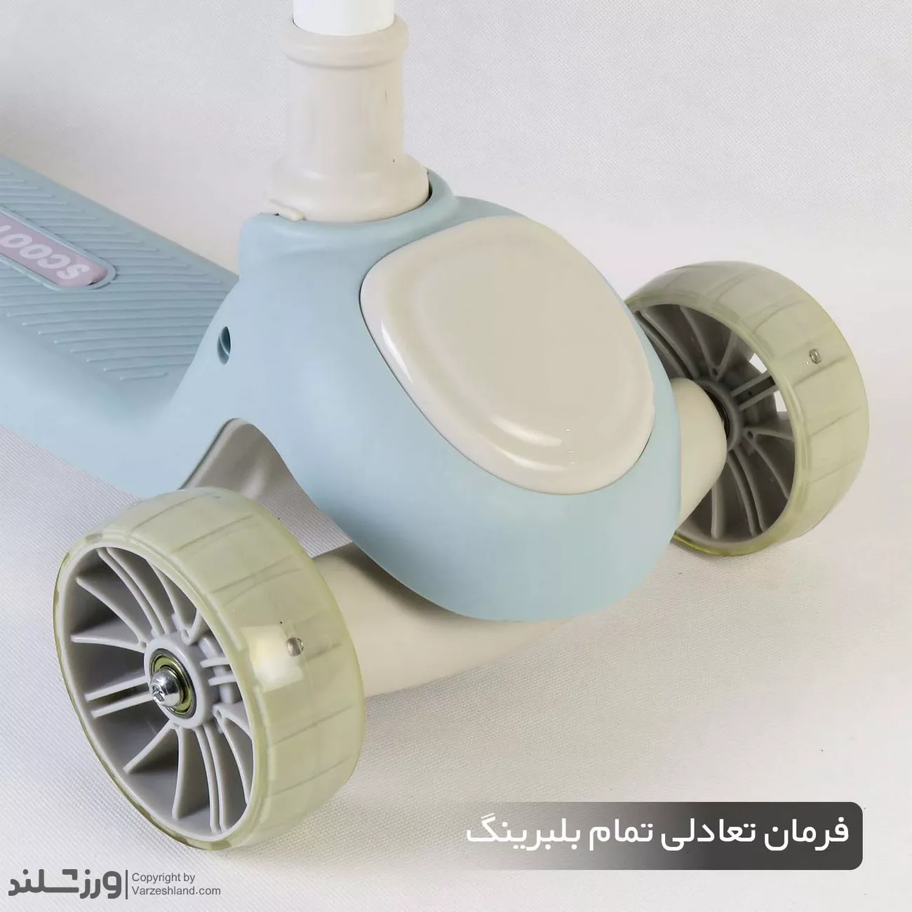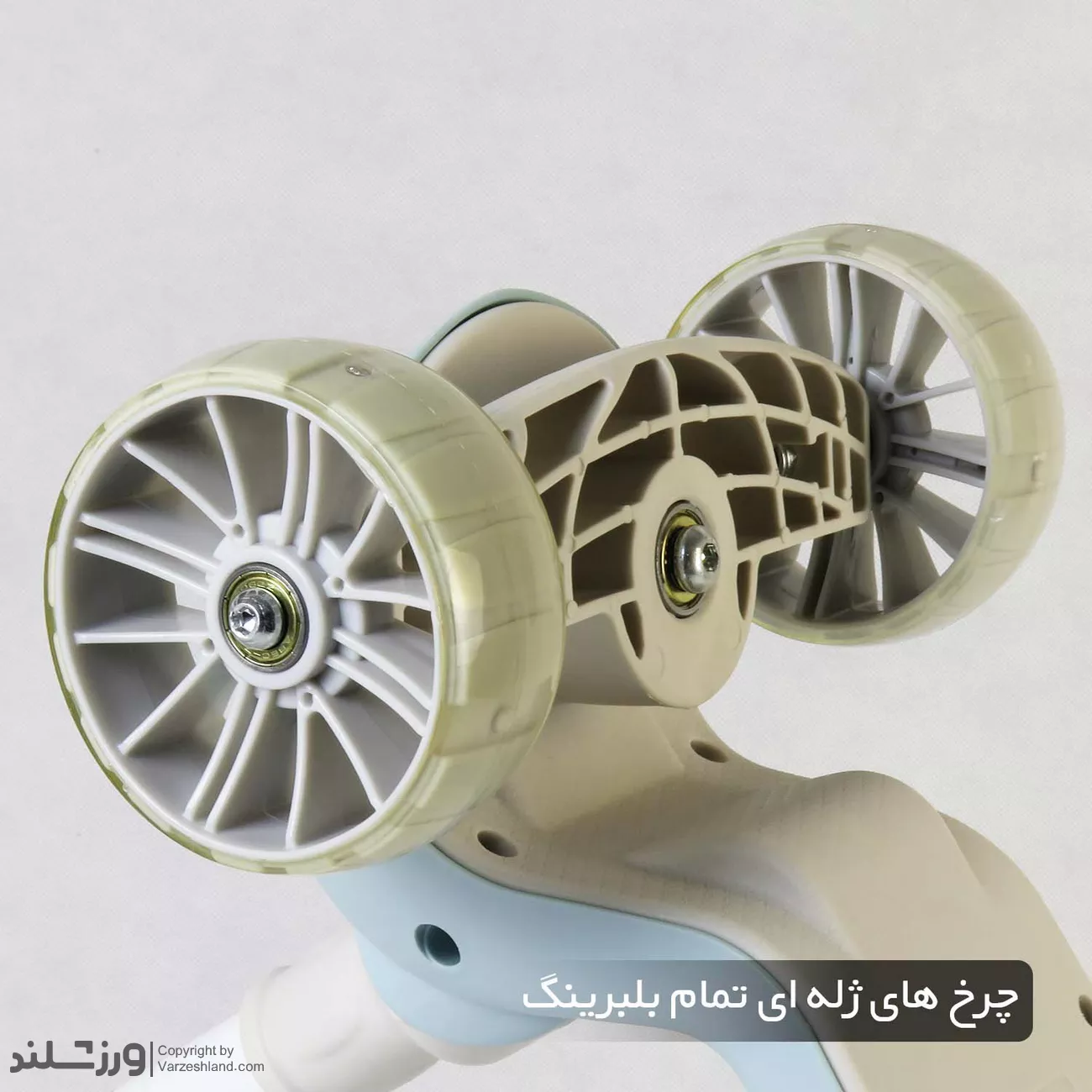 سه چرخ ژلهای و چراغدار، یکی از برجستهترین ویژگیهای این مدل است. چرخها نهتنها هنگام حرکت نورهای رنگی زیبایی پخش میکنند، بلکه با فناوری بلبرینگی، حرکت بسیار روان و بدون صدا را ارائه میدهند. این ویژگی برای خانواده هایی که در آپارتمان زندگی میکنند اهمیت زیادی دارد. فرمان تعادلی تمام بلبرینگ نیز تجربهی هدایت اسکوتر را بسیار ساده میکند و کودک تنها با کمی خم کردن بدن خود میتواند جهت اسکوتر را تغییر دهد؛ این ویژگی باعث تقویت تعادل، هماهنگی حرکتی و اعتمادبه نفس کودک میشود.