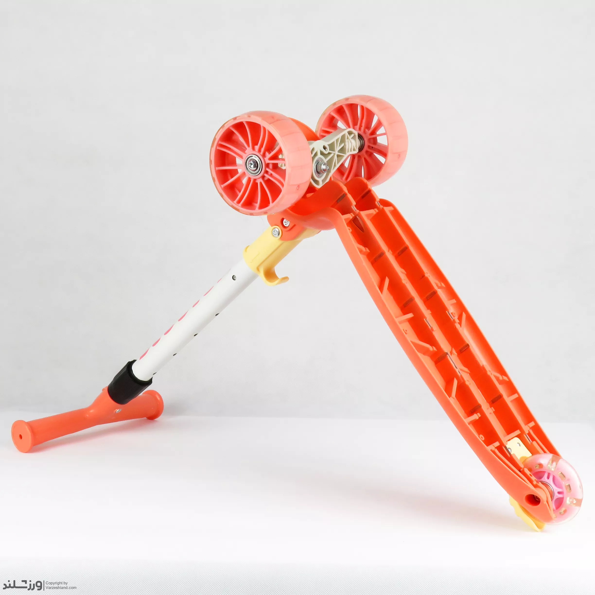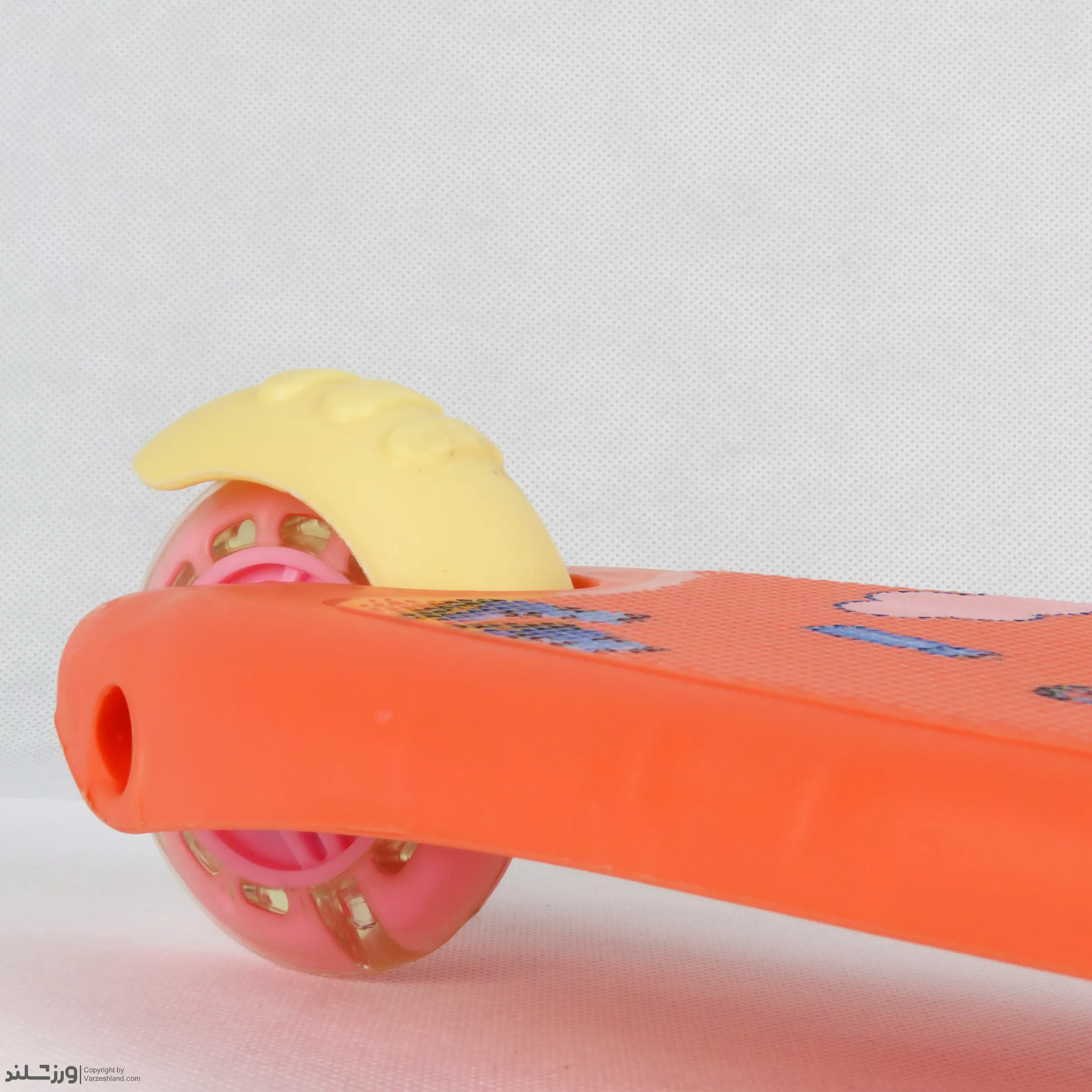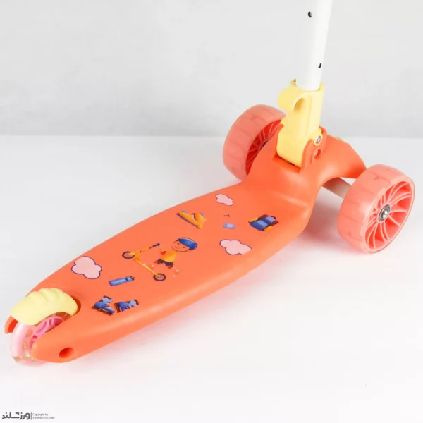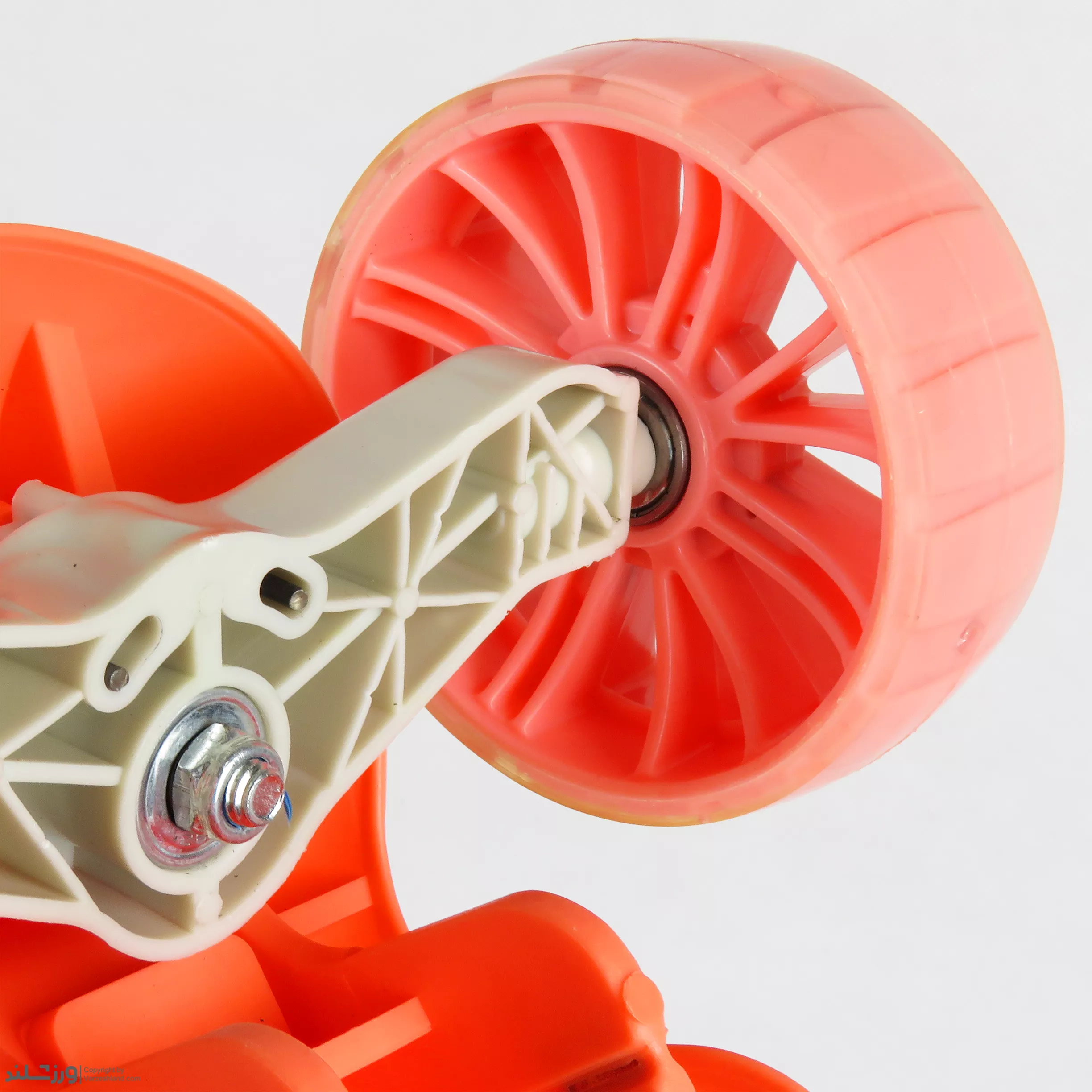 طراحی این اسکوتر فانتزی به صورت سه چرخ انجام شده است؛ یعنی دارای دو چرخ مقاوم و بزرگ در جلو و یک چرخ در عقب است که تعادل بسیار خوبی را برای کودک فراهم میکند. این ویژگی باعث می شود کودکان با کمترین سطح مهارت حرکتی بتوانند بدون نگرانی از افتادن از اسکوتر استفاده کنند. همچنین چرخ های جلویی مجهز به چراغ LED هستند که با حرکت فعال شده و نور رنگی و جذاب ایجاد می کنند. این نور علاوه بر زیبایی و هیجان، باعث افزایش ایمنی در محیط های کم نور نیز میشود.