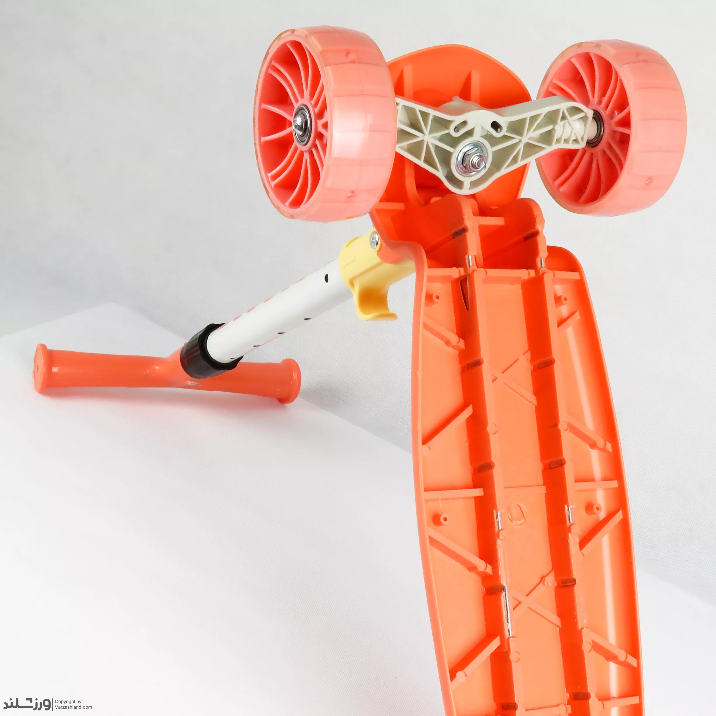فرمان اسکوتر از نوع T شکل با دسته های ضد لغزش است که به خوبی در دست کودک قرار میگیرد و کنترل راحتی را حین حرکت فراهم میکند. همچنین این مدل دارای قابلیت تنظیم ارتفاع فرمان در چهار سطح است و میتوان آن را متناسب با قد کودک تنظیم کرد. این ویژگی باعث شده اسکوتر برای چندین سال همراه قابلاعتماد کودک باشد و با رشد او هماهنگ بماند.