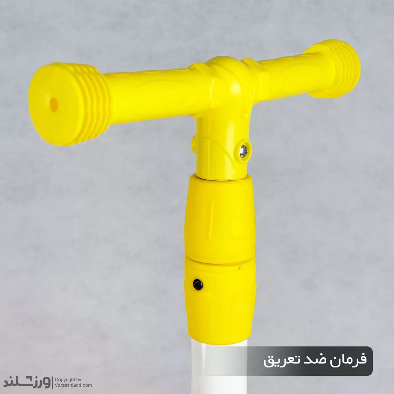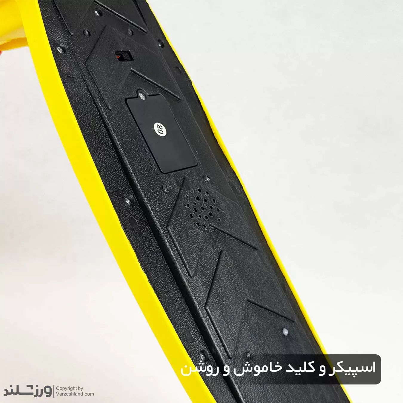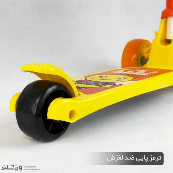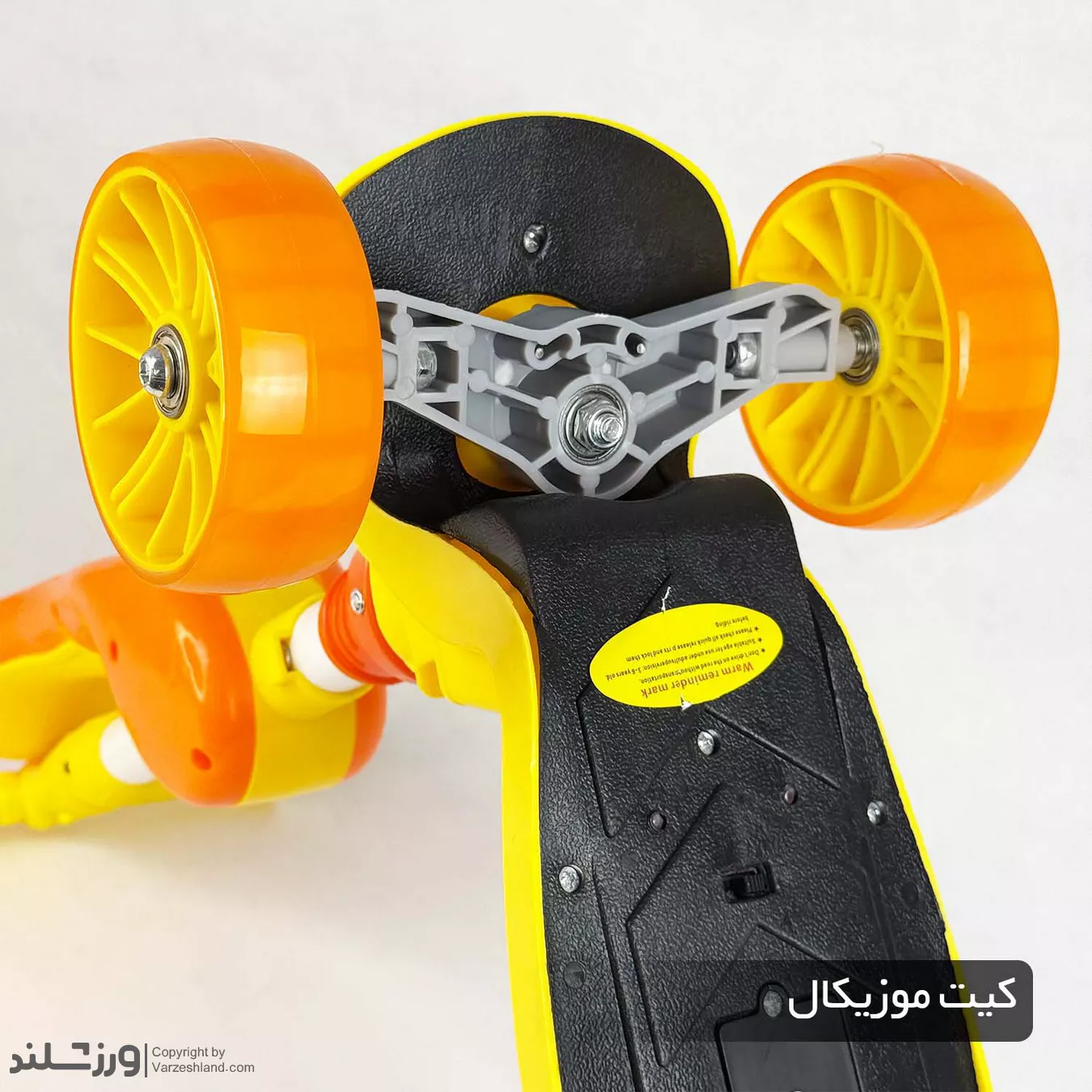 کفپایی این مدل از جنس ضدسایش و ضدلغزش بوده و باعث میشود کودک هنگام ایستادن احساس ثبات بیشتری داشته باشد. چرخهای جلو علاوه بر کیفیت بالا، دارای چراغ LED هستند که هنگام حرکت روشن شده و جلوهای بسیار هیجانانگیز ایجاد میکنند. وجود سیستم موزیکال نیز این اسکوتر را تبدیل به یک وسیله سرگرمی کامل کرده است.
