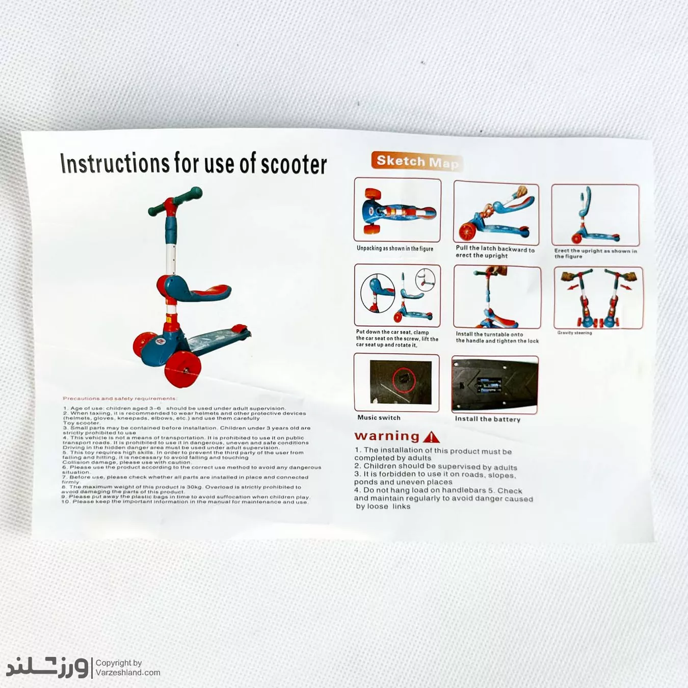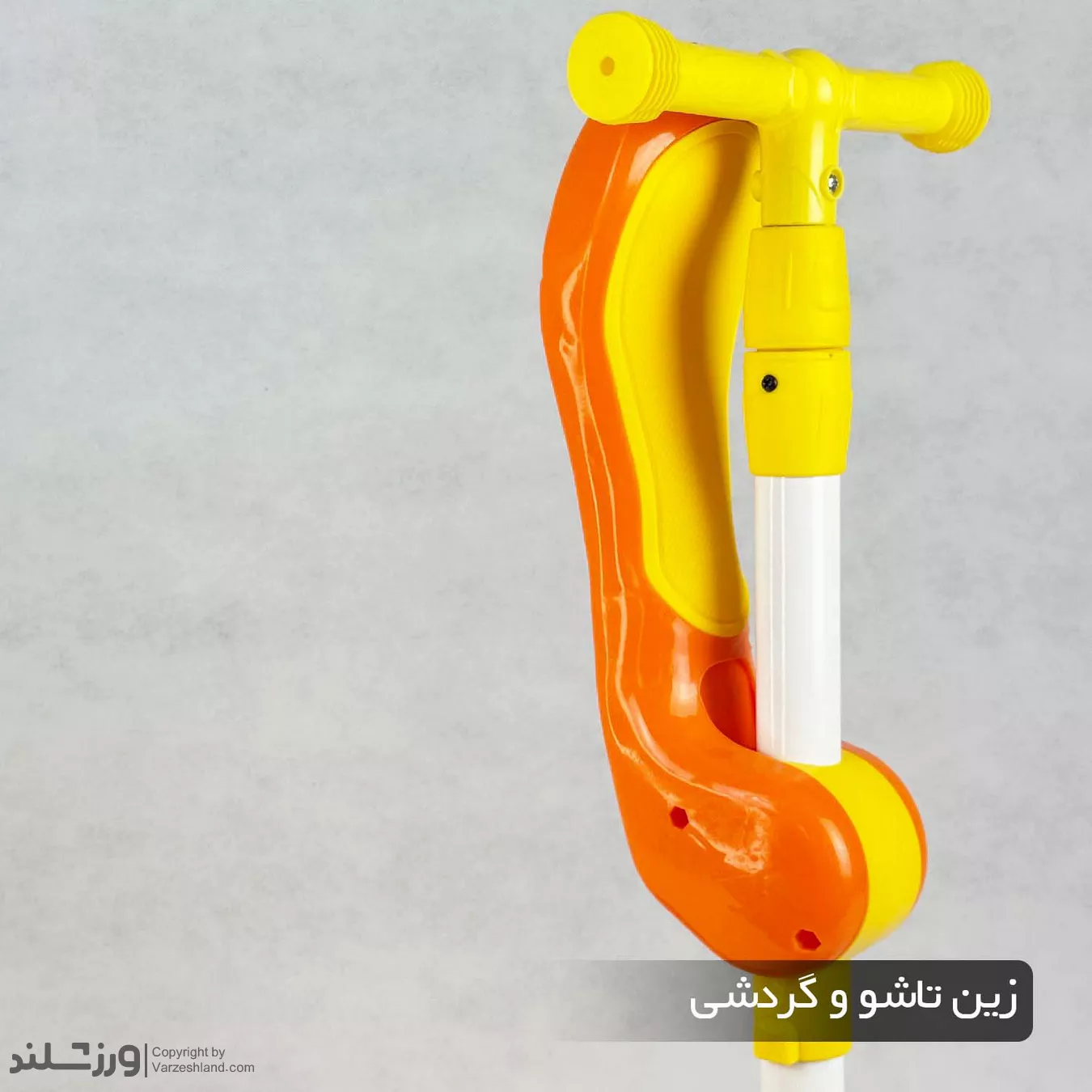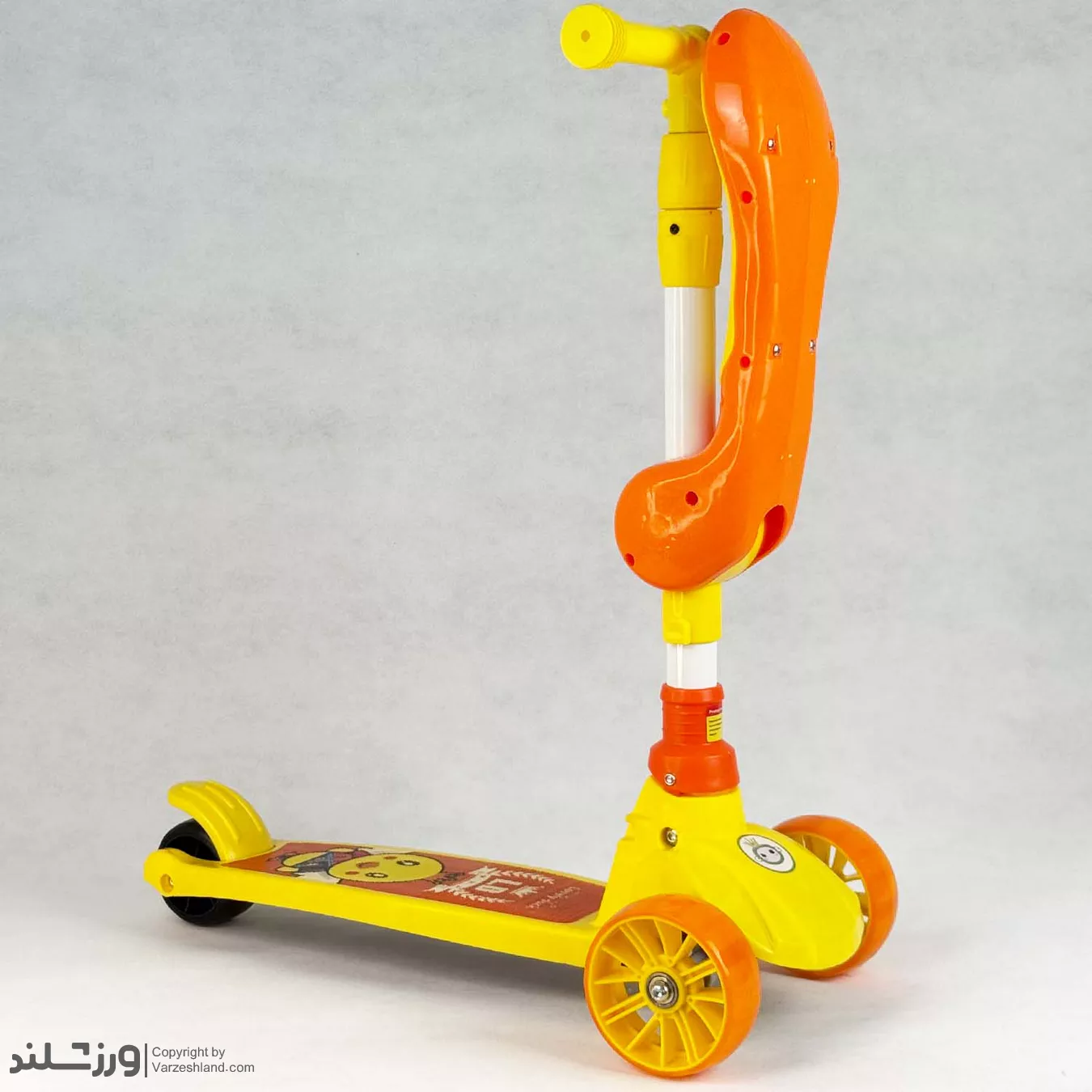 یکی از مهمترین ویژگیهای این اسکوتر موزیکال ، صندلی تاشو و گردشی آن است که امکان استفاده در دو حالت نشسته و ایستاده را فراهم میکند. صندلی در حالت نشسته یکنواخت و راحت بوده و تا ۲۵ کیلوگرم تحمل وزن دارد. همچنین با جمع کردن صندلی، اسکوتر به یک مدل ایستاده تبدیل میشود که تا سال ها همراه کودک رشد کرده و مناسب استفاده طولانی مدت است.