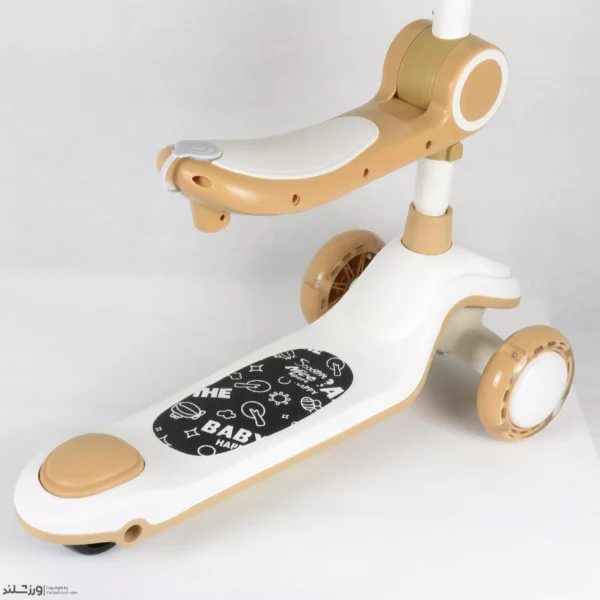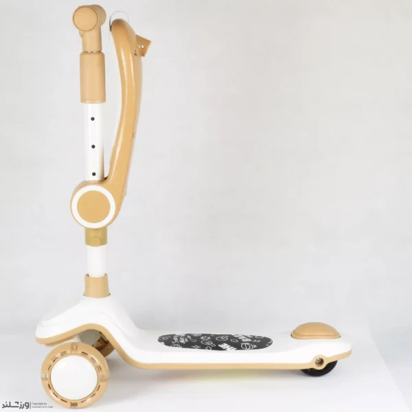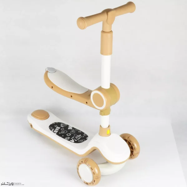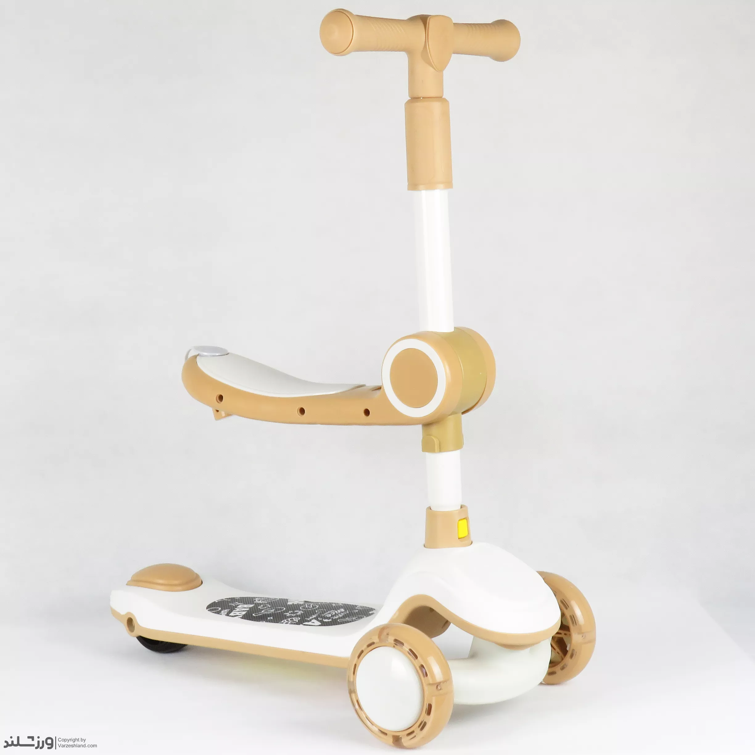 اسکوتر فراری original صندلی دار کد ۱۸۸۹ با طراحی مدرن، صندلی ارگونومیک، سه حالت تنظیم ارتفاع و چرخ‌های چراغ‌دار LED، گزینه‌ای ایده‌آل برای کودکان ۲ تا ۸ سال است. رنگ قهوه‌ای خاص و بدنه مقاوم آن در کنار فرمان ضدلغزش و ترمز ایمن، ترکیبی از زیبایی، امنیت و دوام را ارائه می‌دهد.