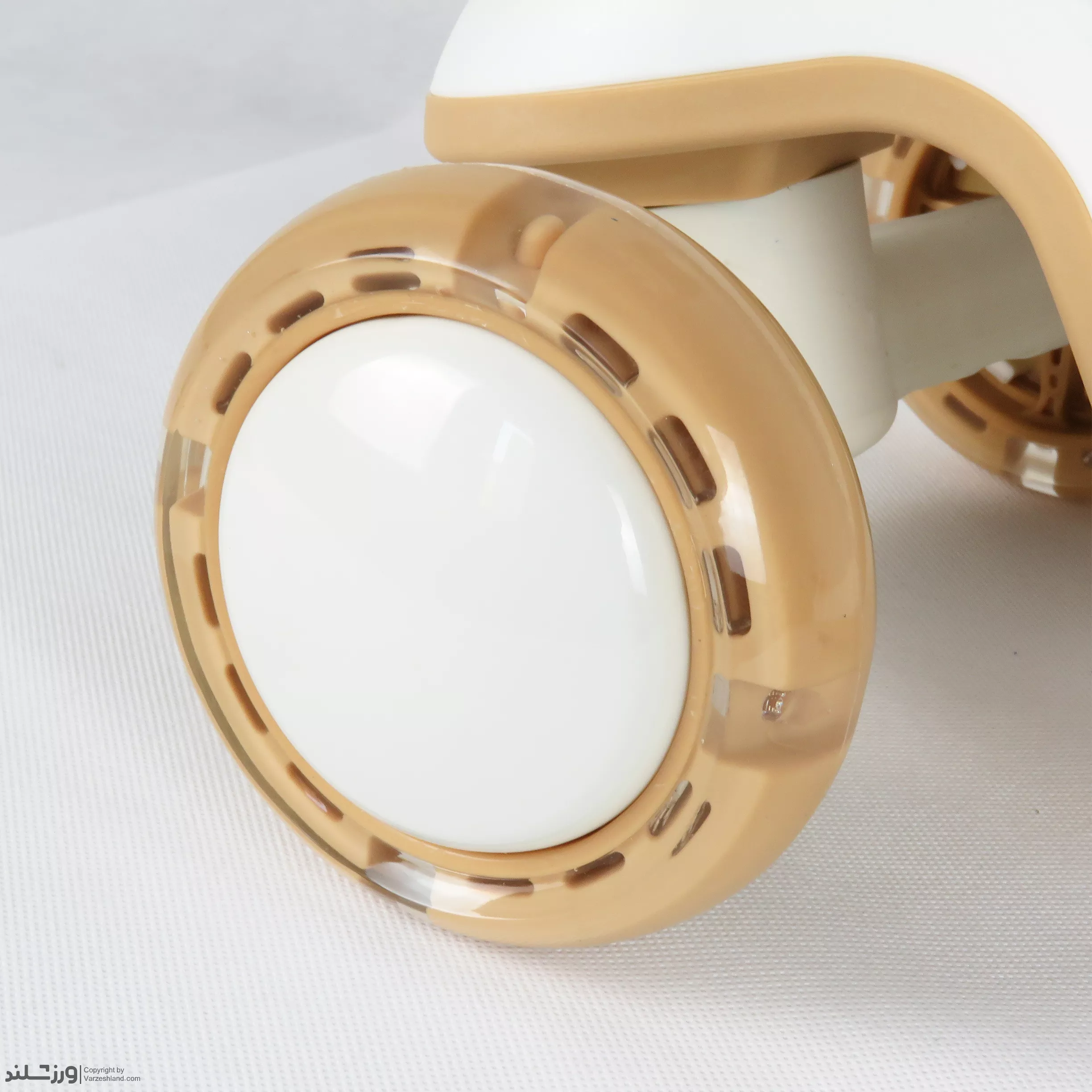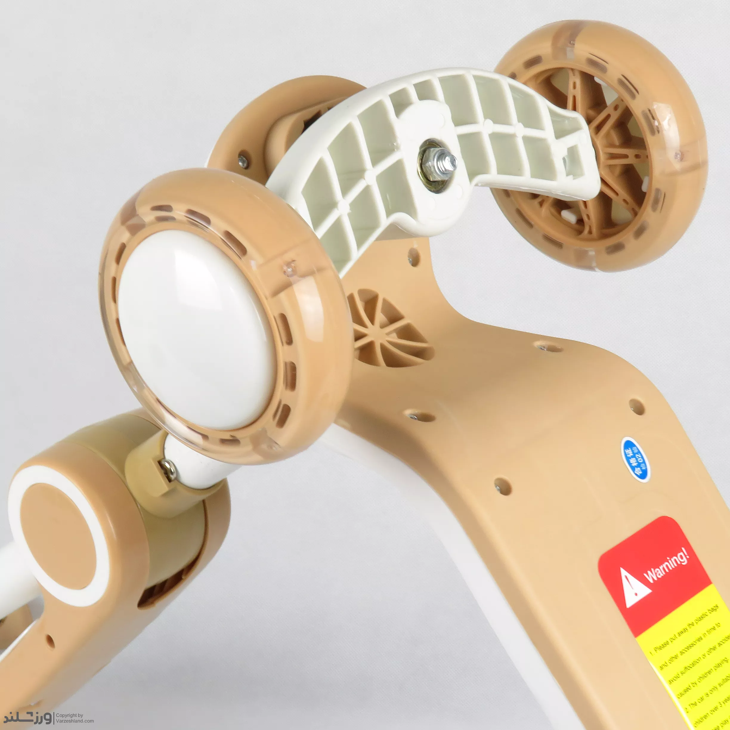 چرخ‌ های این مدل از جنس PU (پلی‌یورتان) ساخته شده‌اند؛ جنسی که دوام بالا و حرکت نرم را روی انواع سطوح تضمین می‌کند. از جذاب‌ترین قسمت‌های این اسکوتر می‌توان به چرخ‌ های چراغ‌ دار LED اشاره کرد که هنگام حرکت، با روشن شدن نورهای رنگی جلوه‌ای چشمگیر ایجاد می‌کنند. ترکیب رنگ قهوه‌ای بدنه با درخشش این چراغ‌ ها، ظاهری فانتزی و پرانرژی به محصول می‌دهد.