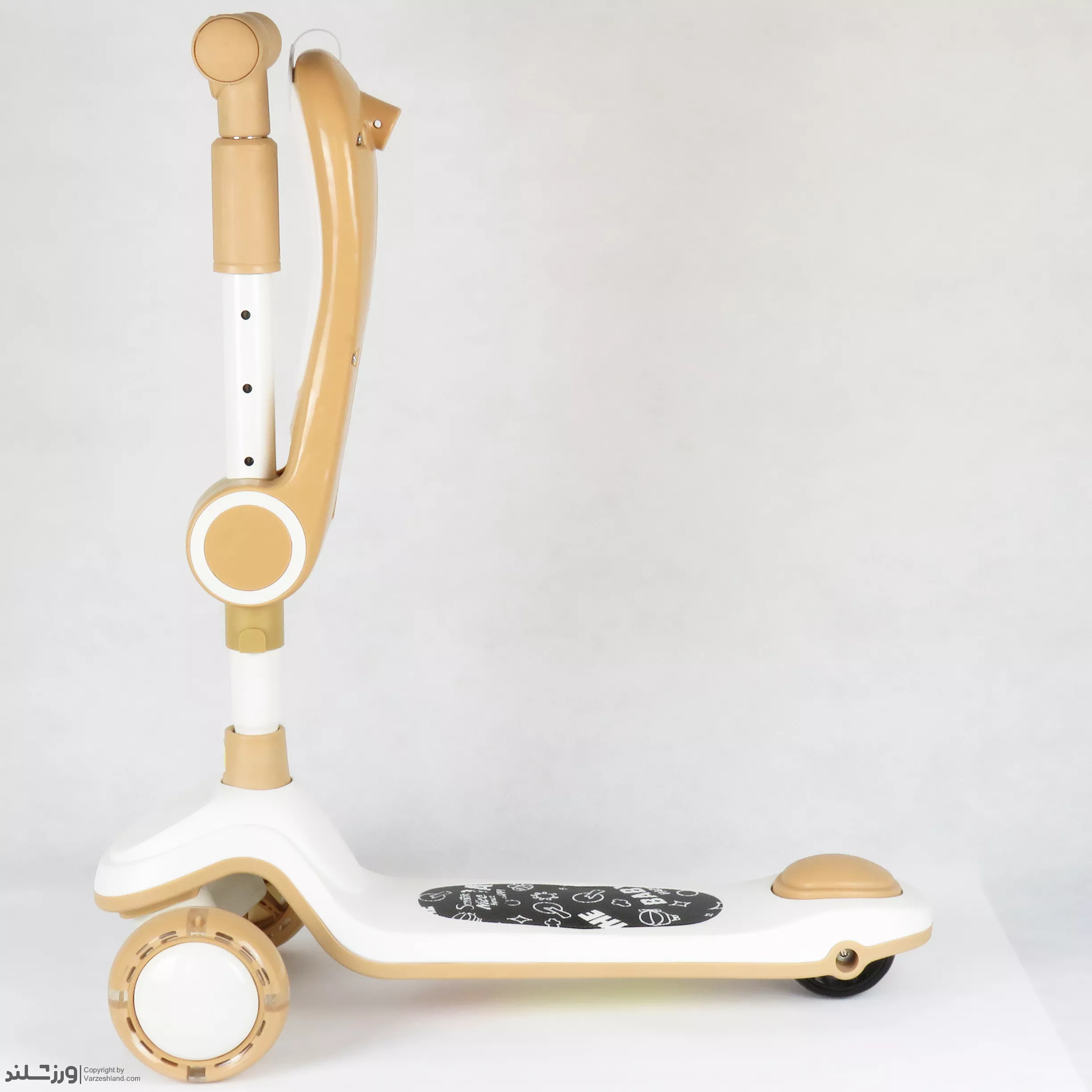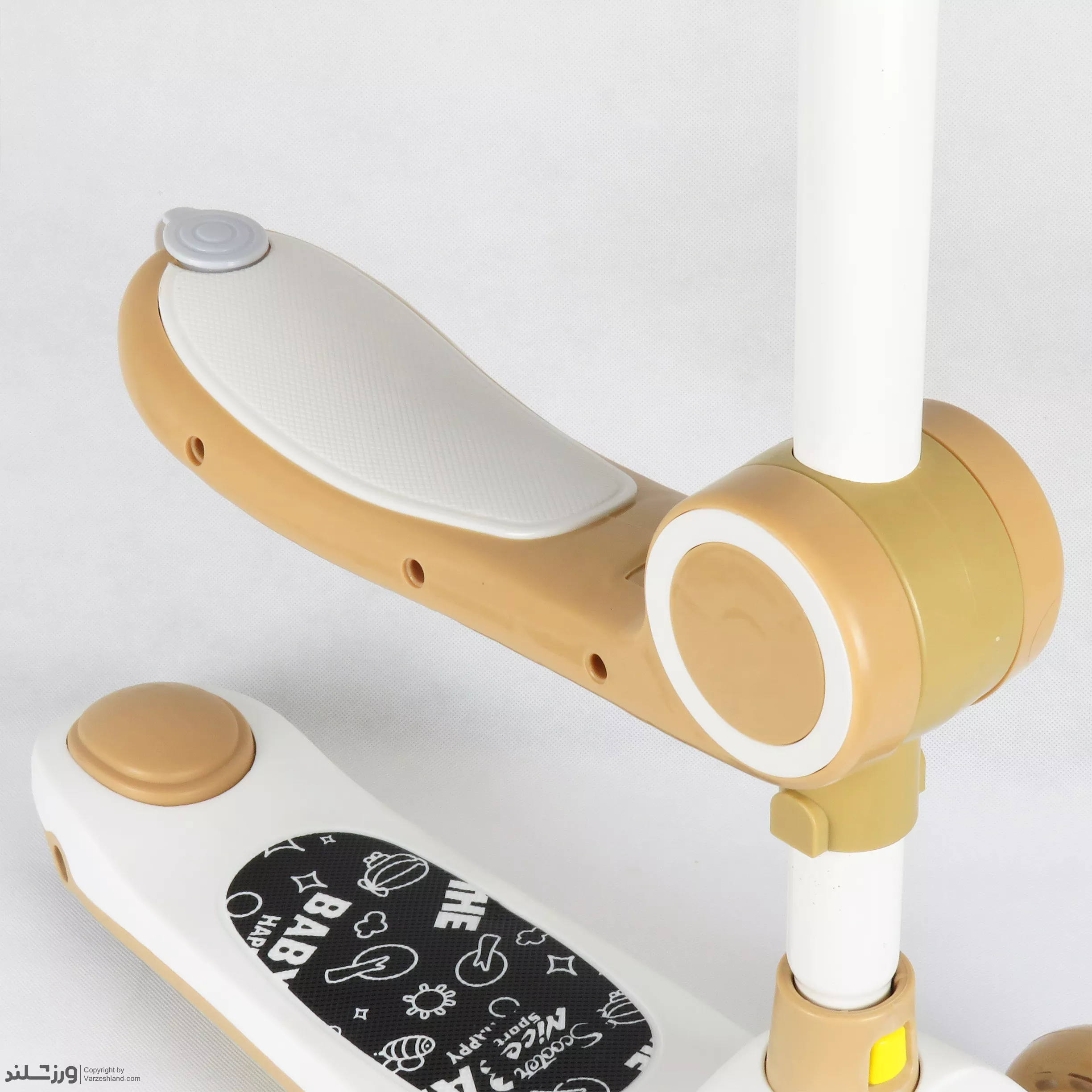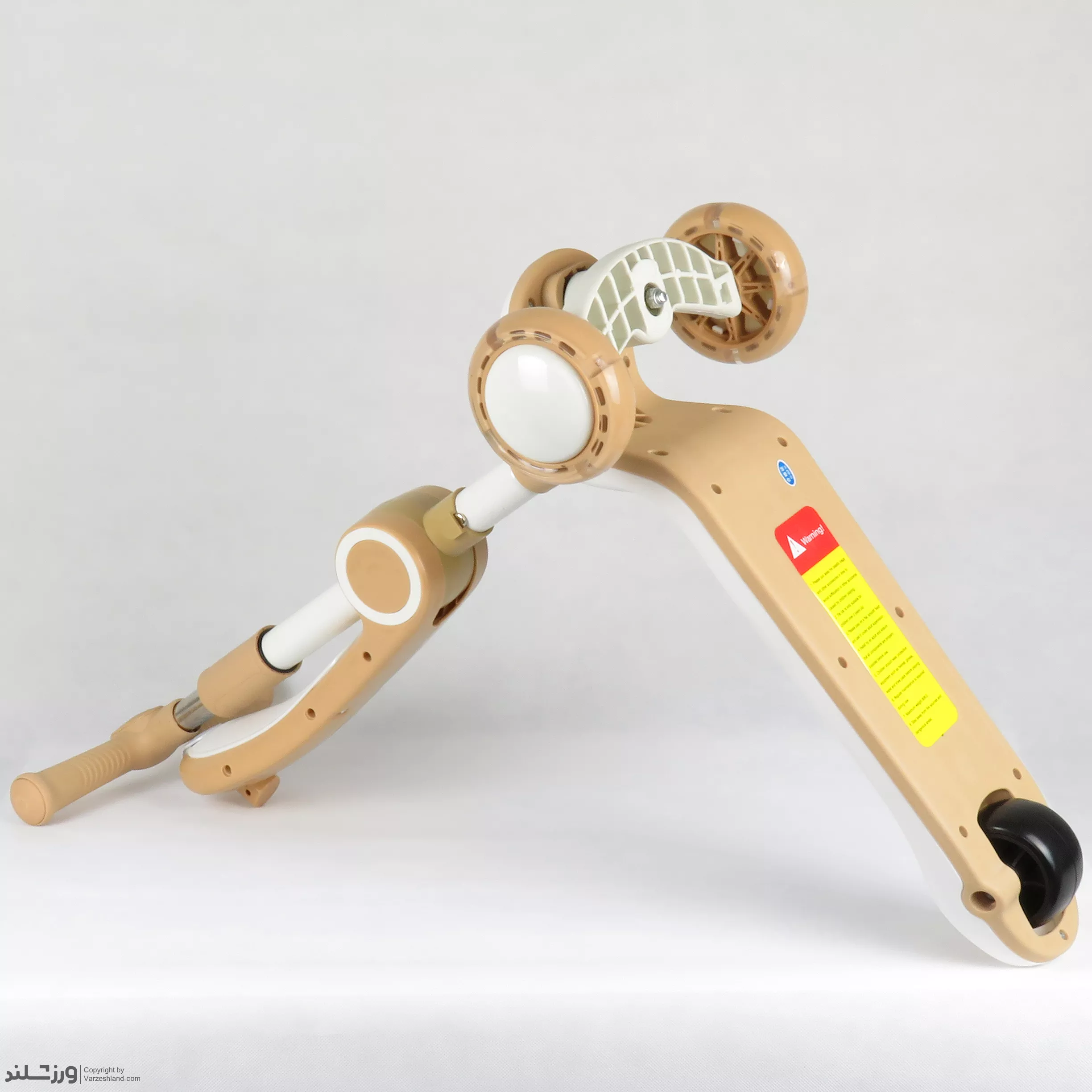 بدنه‌ی این مدل از پلاستیک فشرده مقاوم و فلز مستحکم ساخته شده تا ضمن وزن سبک، تحمل وزن بالا و دوام طولانی‌مدت داشته باشد. رنگ قهوه‌ای مات و مدرن آن حس گرما و استحکام را القا کرده و در عین سادگی، جذابیتی خاص به اسکوتر بخشیده است. طراحی منحنی‌دار بدنه و کیفیت ساخت بالا، باعث می‌شود این مدل به‌راحتی توجه والدین سخت‌پسند را جلب کند.