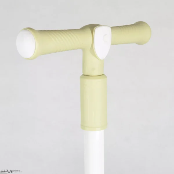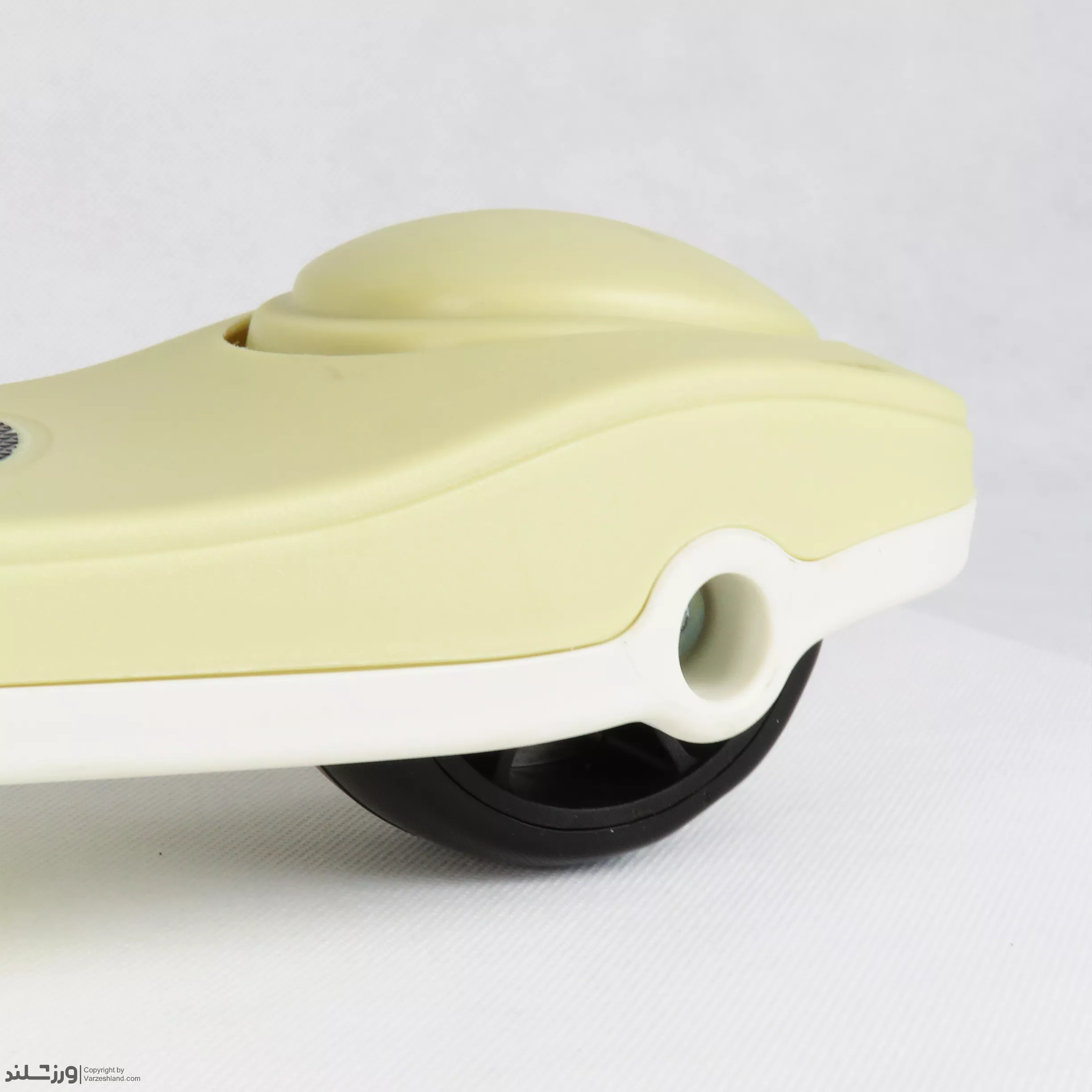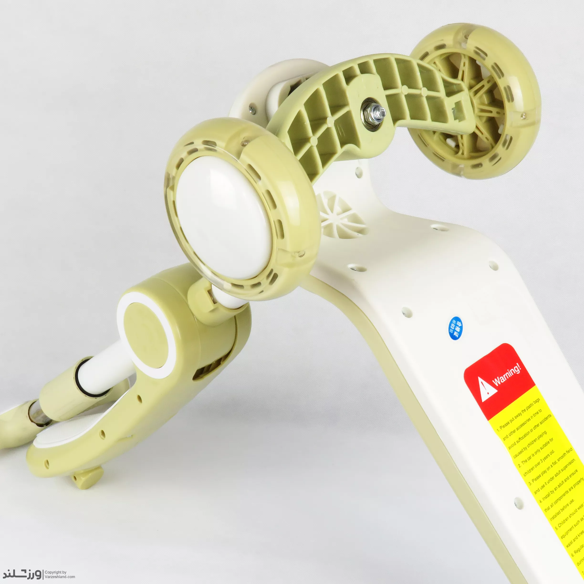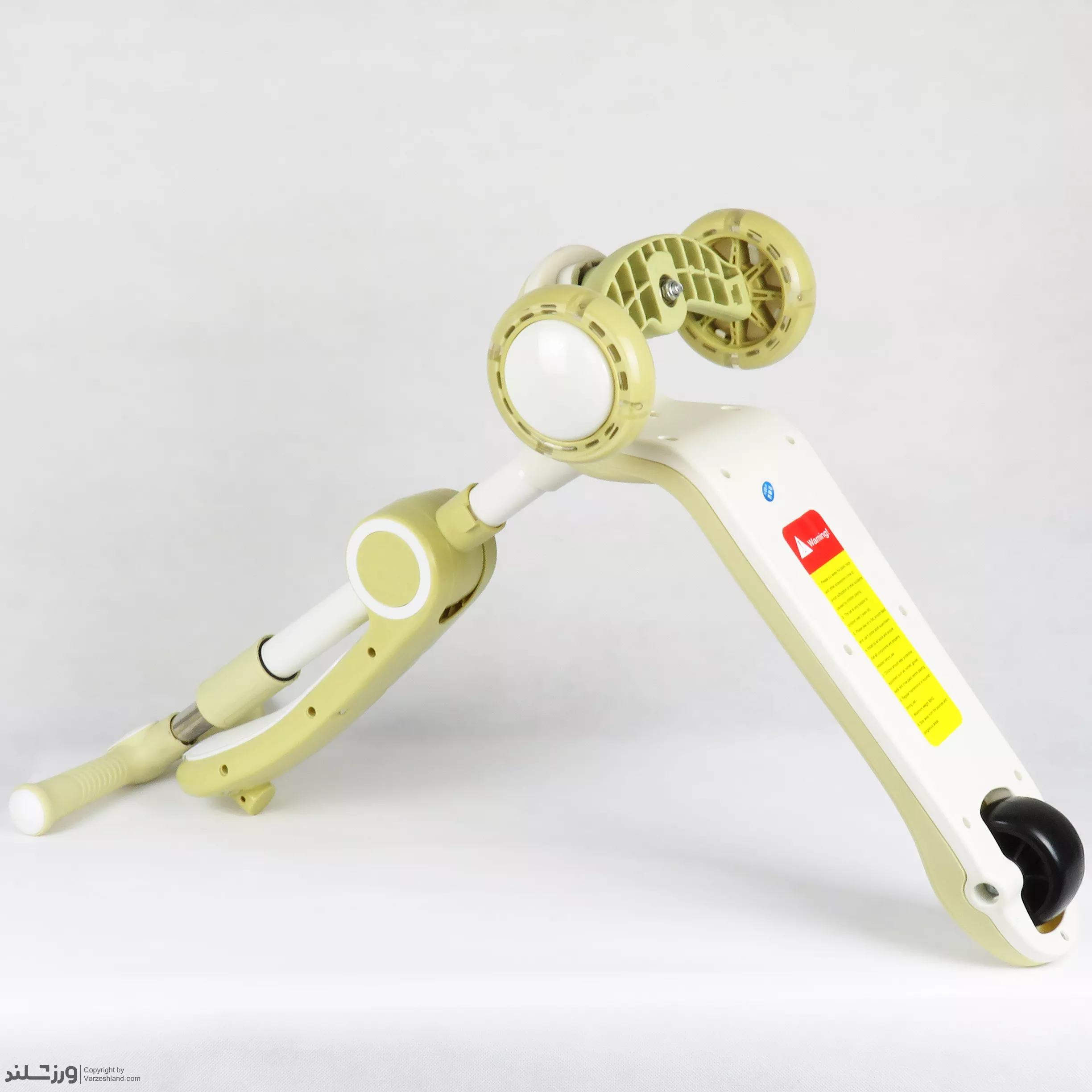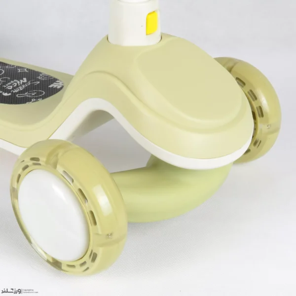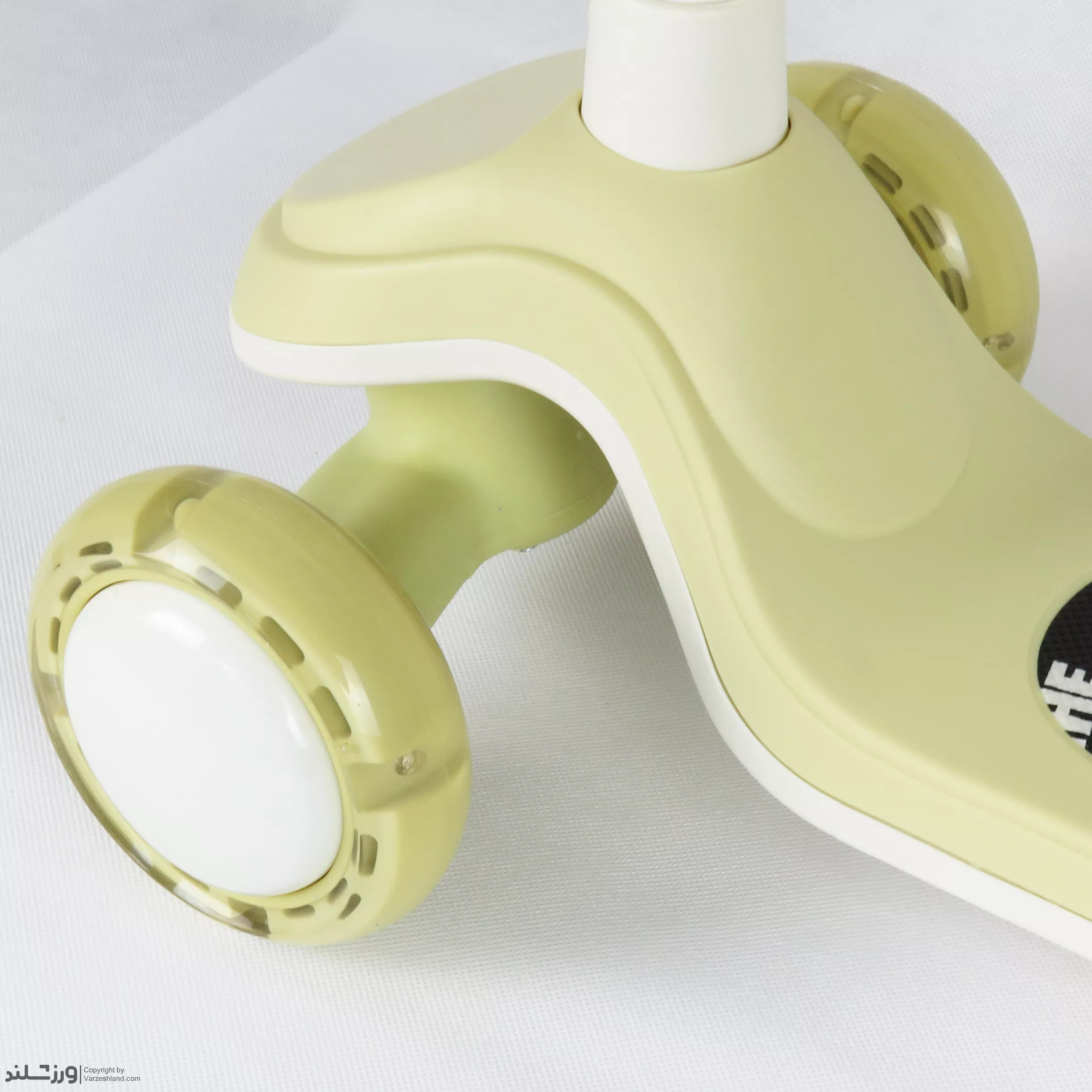 چرخ های جلویی از جنس پلییورتان (PU) طراحی شده اند تا حرکت نرم، بیصدا و روانی داشته باشند. این چرخ ها هنگام حرکت می درخشند و با چراغ های رنگی LED داخلی تجربه ای هیجان انگیز را برای کودک رقم میزنند. رنگ کرم ملایم اسکوتر در ترکیب با نور چرخها، جلوهای فانتزی و جذاب ایجاد میکند که در محیط های تاریک نیز چشمگیر است.