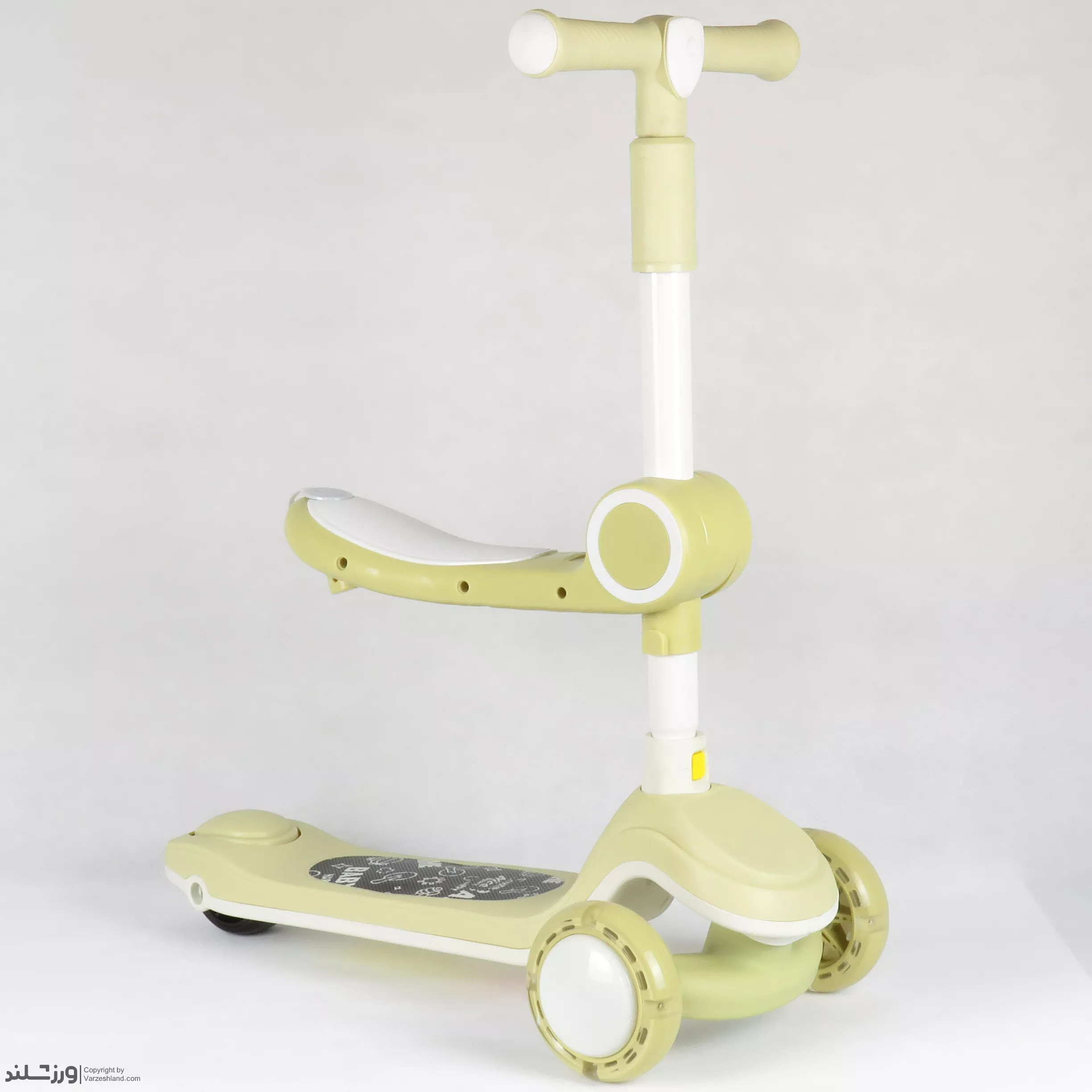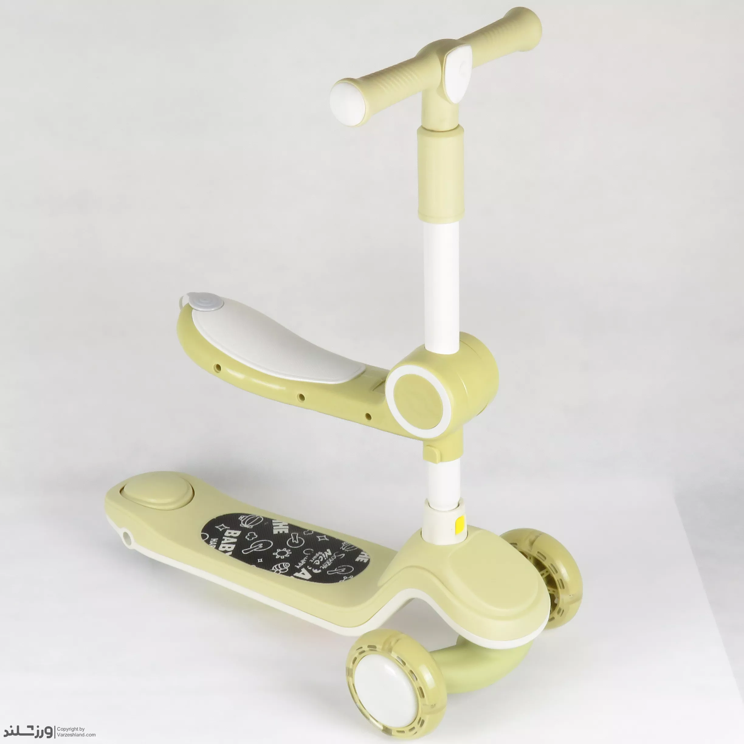 این اسکوتر صندلی دار با بدنه ای از پلاستیک فشرده و فلز تقویتشده ساخته شده تا هم سبک باشد و هم استحکام بالایی در برابر فشار و ضربه داشته باشد. رنگ کرم مات آن ظاهری شیک و خاص ایجاد کرده و در عین حال به راحتی با سایر وسایل کودک هماهنگ میشود. طراحی ارگونومیک بدنه، فرمان و صندلی باعث میشود کودک در هر سنی احساس راحتی و تعادل داشته باشد.