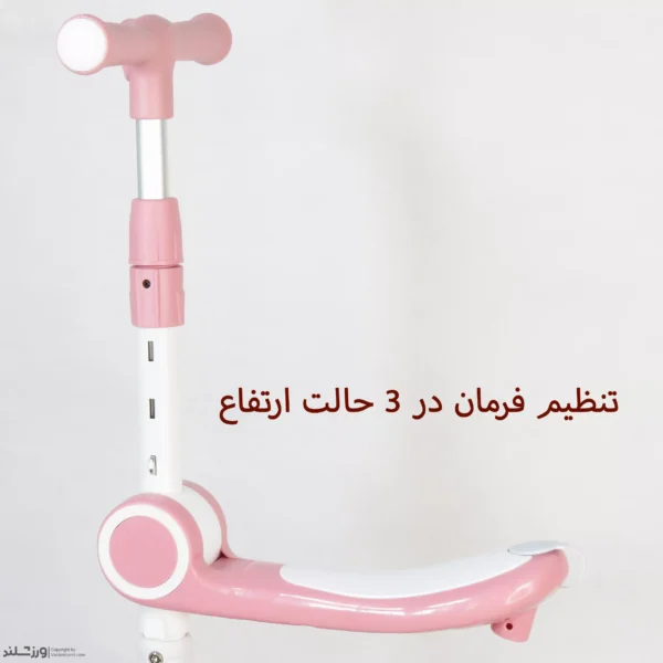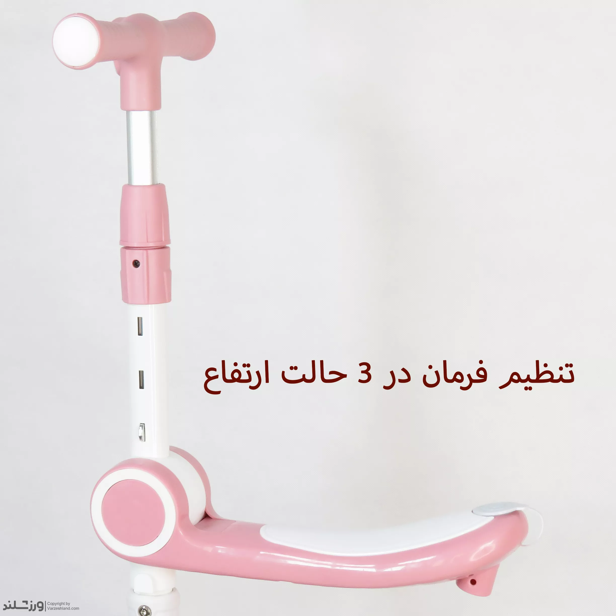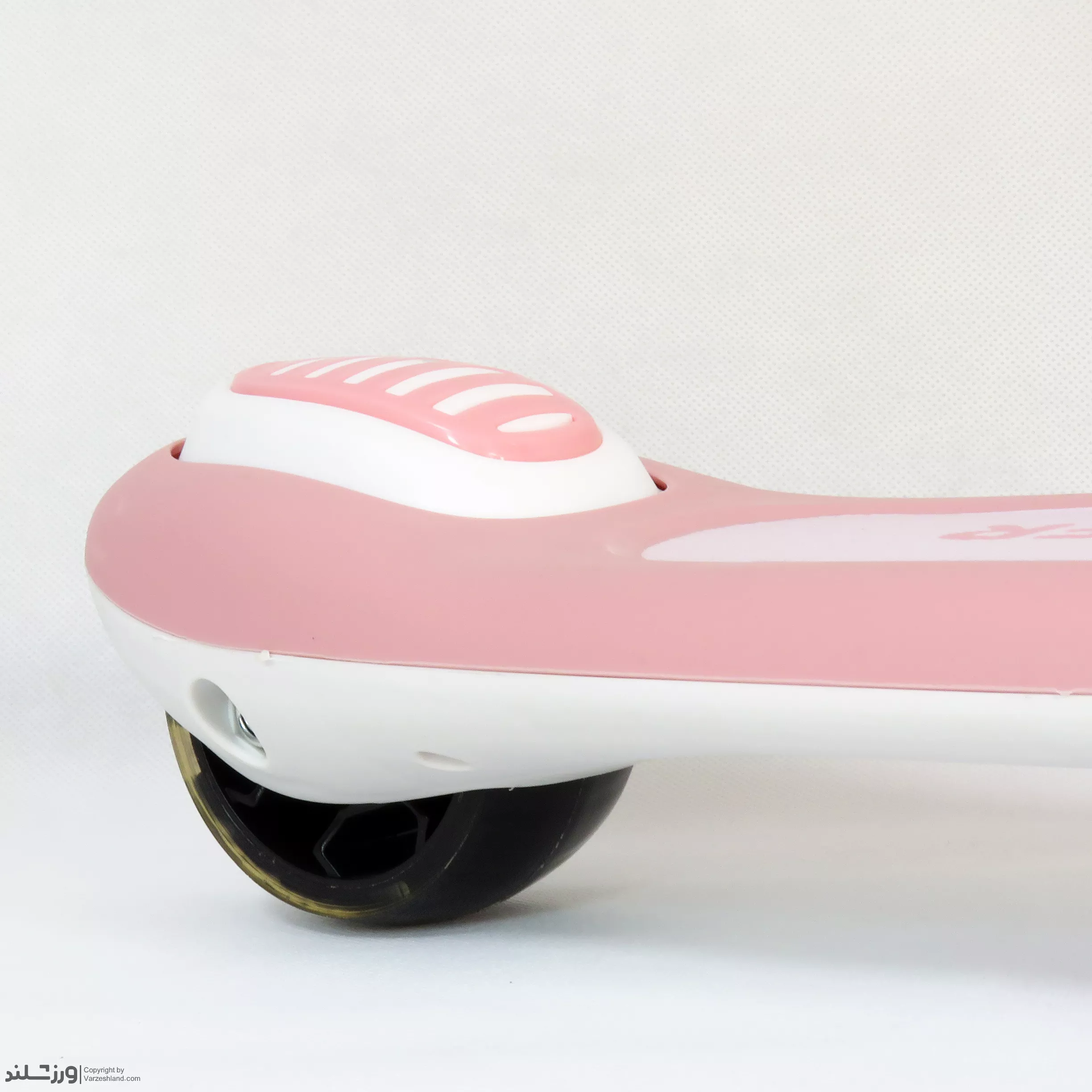 چرخ‌های جلو LED و ژله‌ای PU این اسکوتر صندلی دار نه تنها ظاهر فانتزی و جذاب به رنگ صورتی می‌دهند، بلکه با حرکت روشن شده و جذابیت بصری بیشتری ایجاد می‌کنند و باعث می‌شوند کودک در محیط‌های کم‌نور هم دیده شود.