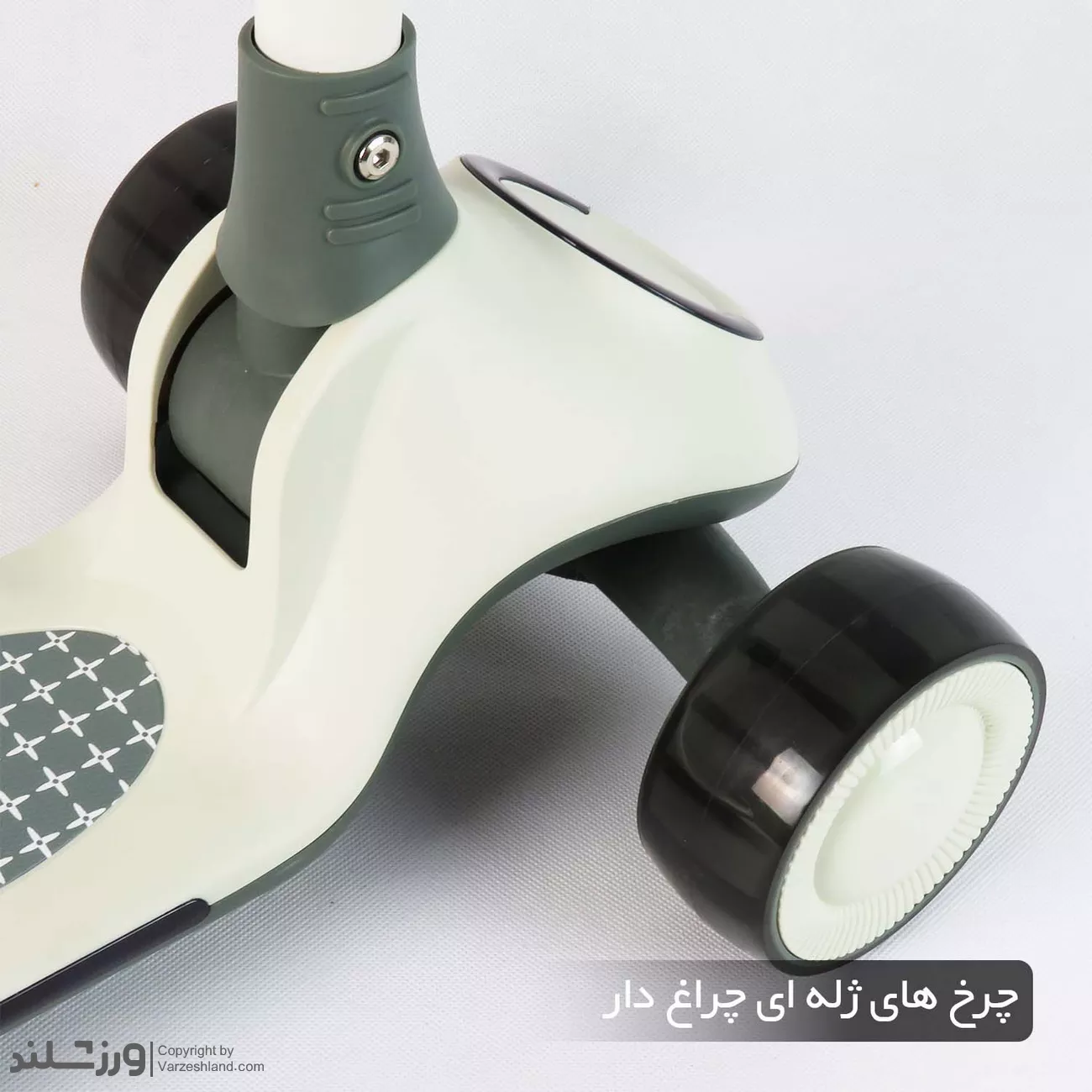 چرخهای ژلهای و چراغدار، حرکت اسکوتر موزیکال را زیبا و لذتبخش میکنند. این چرخها دارای بلبرینگهای قوی هستند که حرکت را کاملاً روان، ایمن و بدون لرزش میسازند. طوسی بودن بدنه این مدل باعث شده برای استفاده در هر محیطی ظاهر شیک خود را حفظ کند و برای پسران و دختران مناسب باشد.