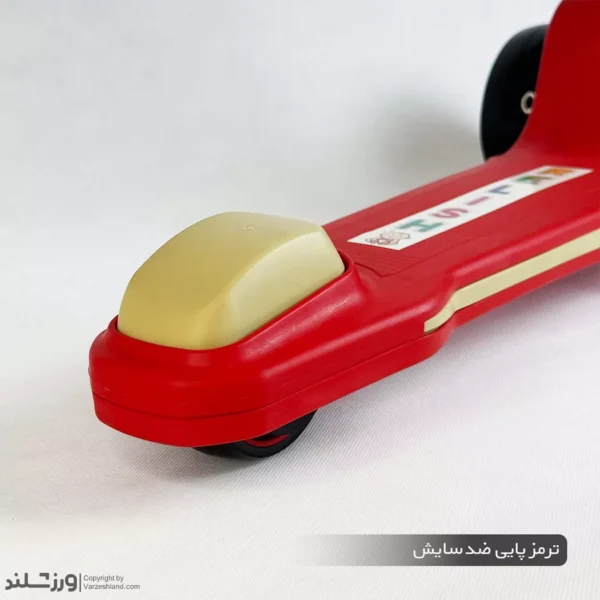 ترمز پایی ضدسایش بخش دیگری از امکانات کاربردی این اسکوتر است. وجود ترمز عقب باعث میشود کودک بتواند در هر لحظه سرعت خود را کم یا متوقف کند. متریال باکیفیت و مقاومت بالای ترمز باعث شده عملکرد آن در استفاده روزانه کاهش پیدا نکند. این ترمز طراحی ایمنی دارد و برای کودکان کمسن کاملاً مناسب است؛ بدون پیچیدگی و فقط با فشار پا.