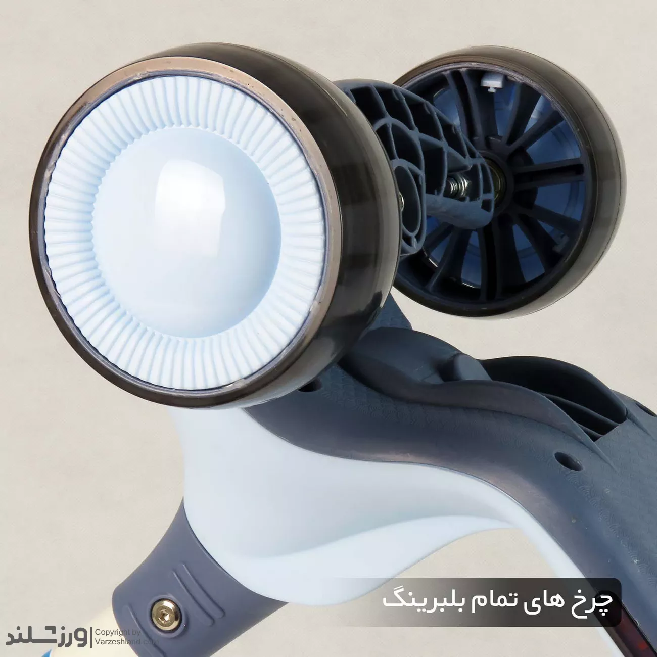 در قسمت چرخها از چرخ های ژلهای (PU) با کیفیت بالا استفاده شده که در برخورد با زمین، لرزش و ضربه را کاهش میدهد. چرخ های جلو به صورت چراغدار هستند و هنگام حرکت، نورهای رنگی جذابی تولید میکنند؛ این ویژگی برای کودکان هیجانانگیز و سرگرمکننده است. از طرفی، وجود بلبرینگ های قوی حرکت اسکوتر را بسیار روان، بدون صدا و ایمن کرده است.