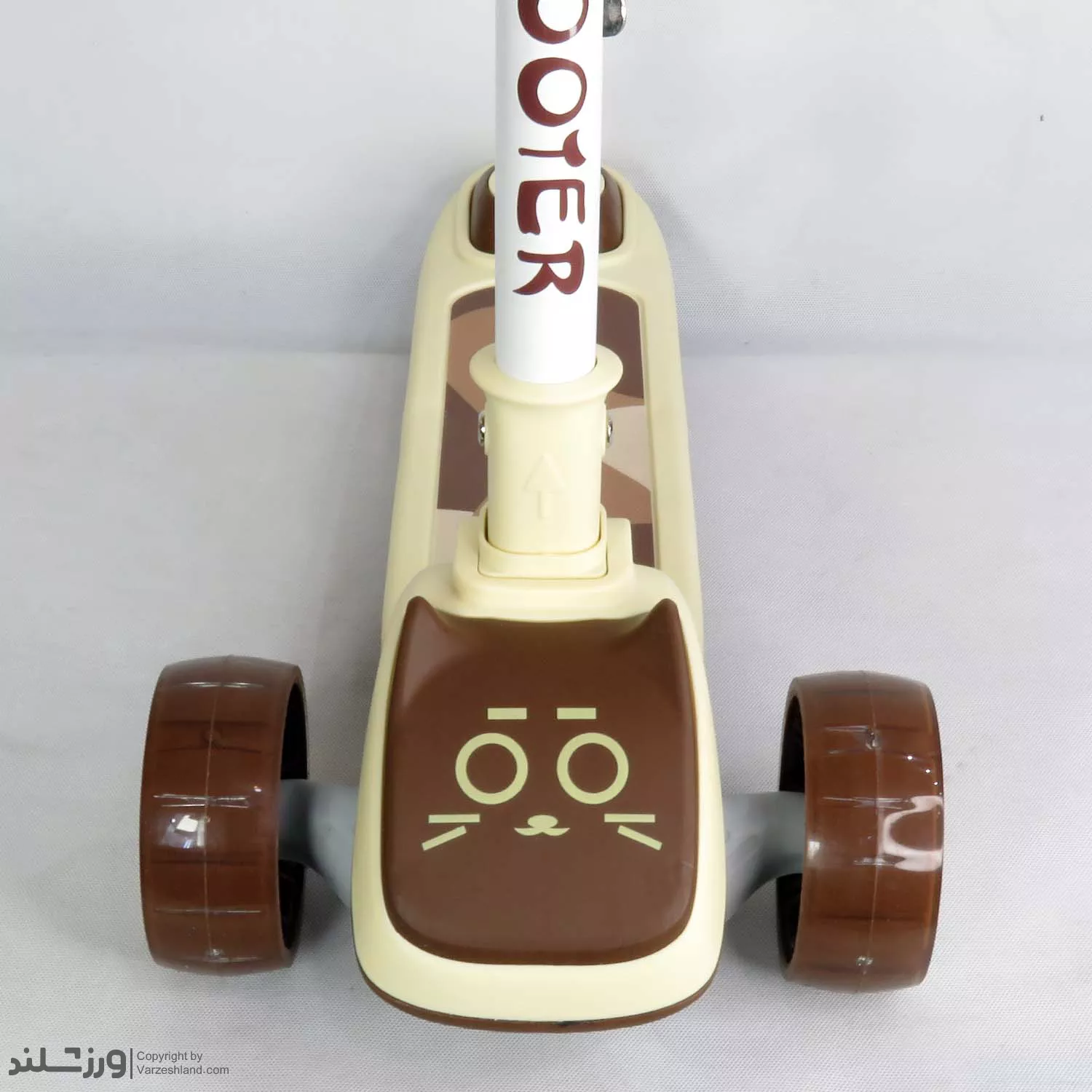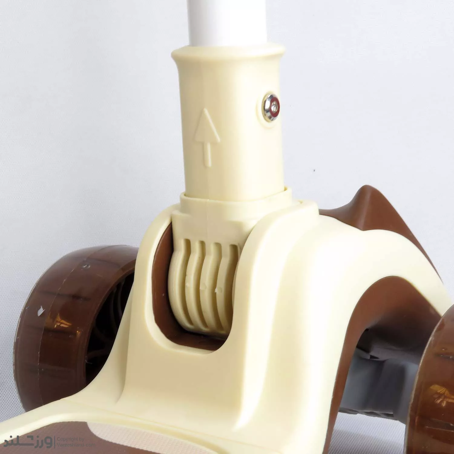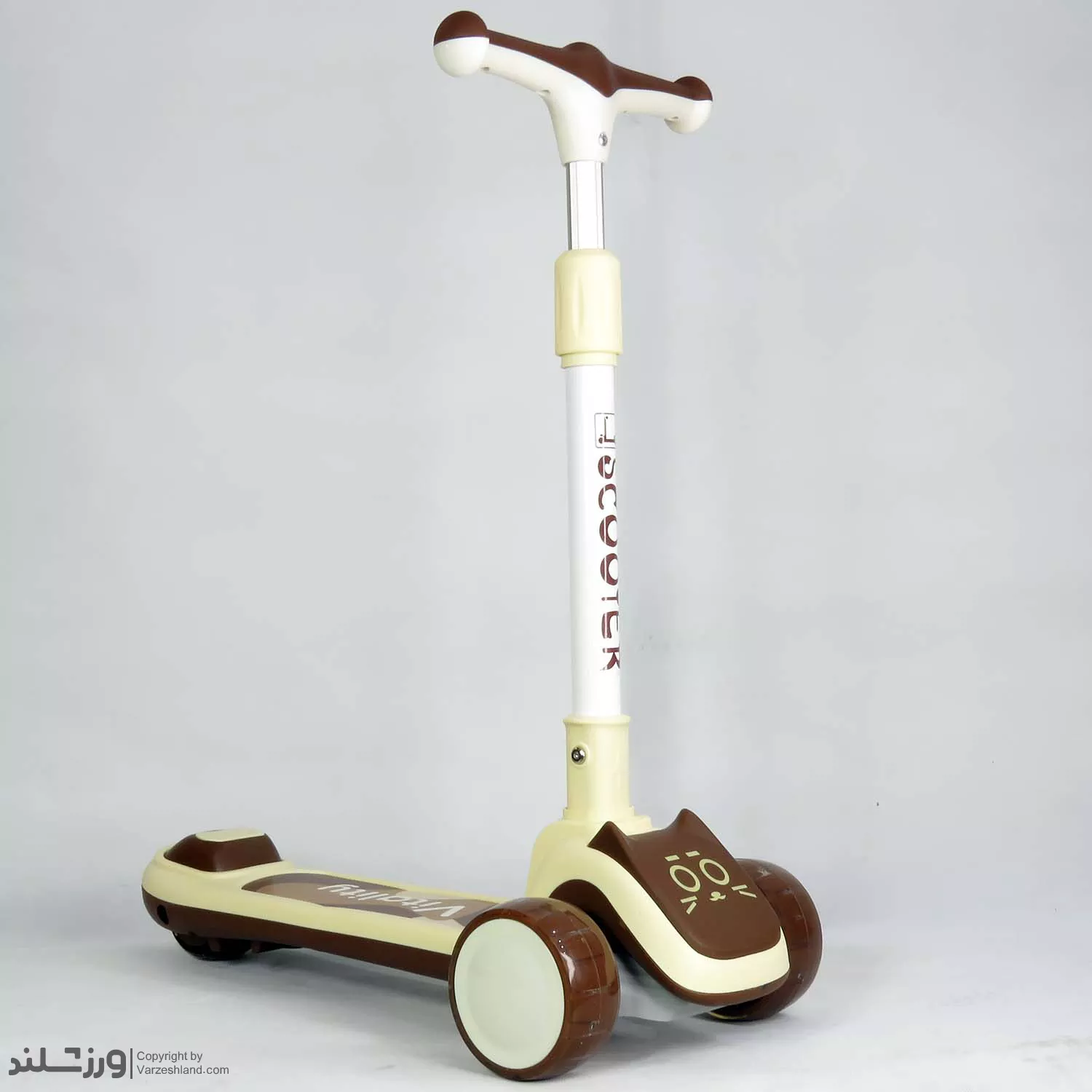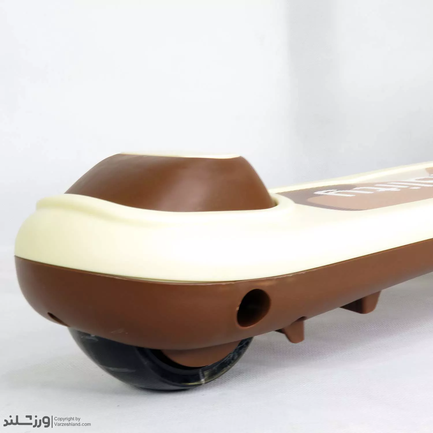 بدنهی این اسکوتر از پلاستیک فشردهی ABS باکیفیت بالا ساخته شده است که در برابر ضربه و سایش مقاومت زیادی دارد. استفاده از ترکیب رنگ کرم و قهوه ای، حس گرما و لطافت را القا کرده و باعث میشود این مدل نسبت به سایر رنگها خاصتر و لوکستر به نظر برسد. چرخهای جلویی مجهز به نورپردازی LED هستند که هنگام حرکت روشن میشوند و جلوهای چشمنواز ایجاد میکنند. همچنین وجود ترمز پدالی عقب ایمنی کامل را در هنگام توقف برای کودک فراهم میسازد.