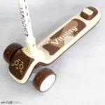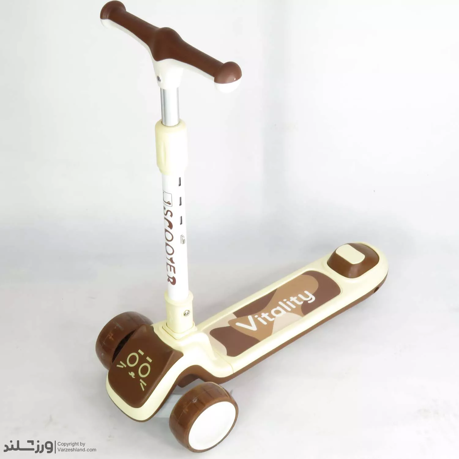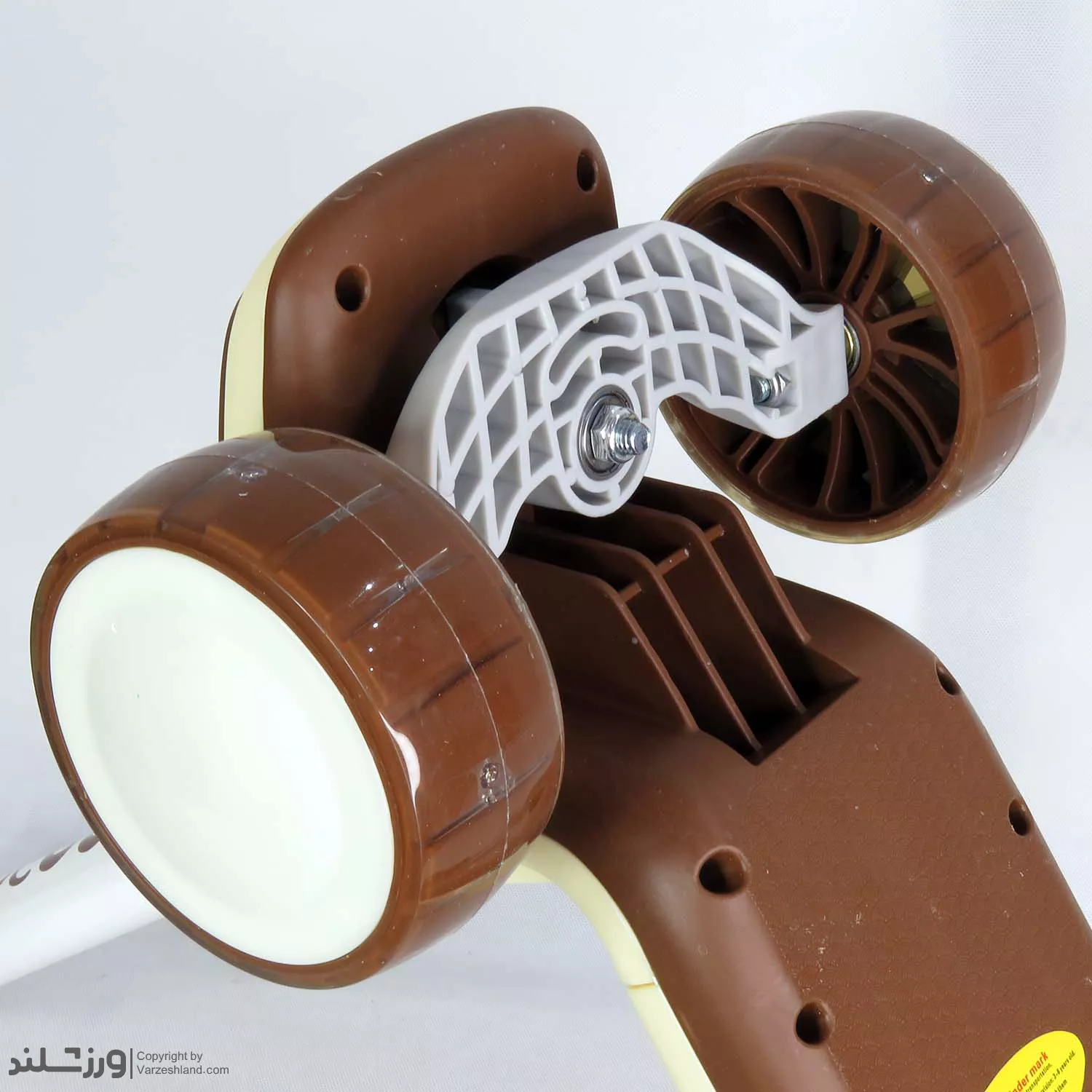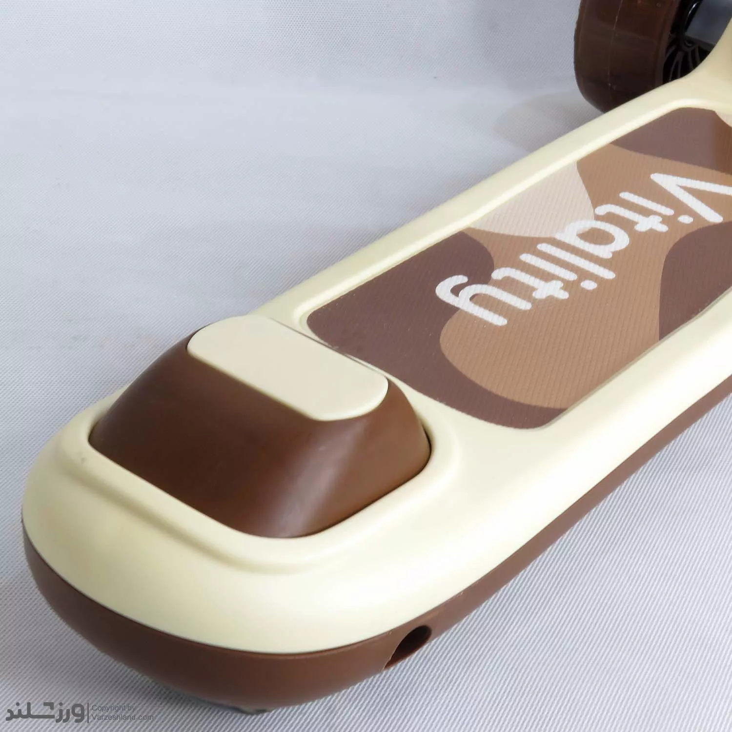 بدنهی این اسکوتر از پلاستیک فشردهی ABS باکیفیت بالا ساخته شده است که در برابر ضربه و سایش مقاومت زیادی دارد. استفاده از ترکیب رنگ کرم و قهوه ای، حس گرما و لطافت را القا کرده و باعث میشود این مدل نسبت به سایر رنگها خاصتر و لوکستر به نظر برسد. چرخهای جلویی مجهز به نورپردازی LED هستند که هنگام حرکت روشن میشوند و جلوهای چشمنواز ایجاد میکنند. همچنین وجود ترمز پدالی عقب ایمنی کامل را در هنگام توقف برای کودک فراهم میسازد.