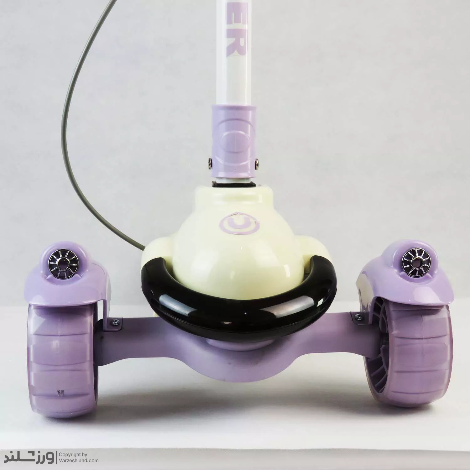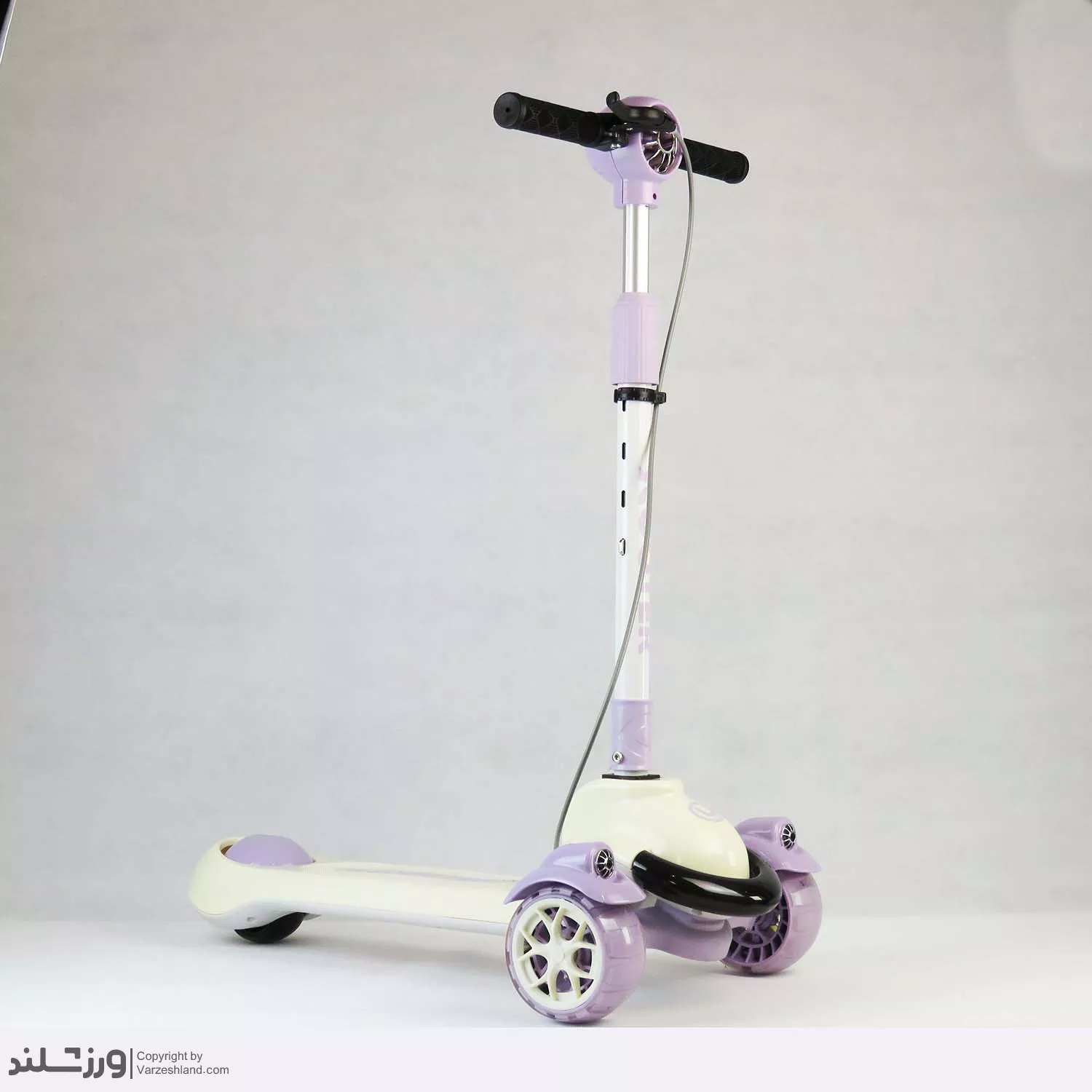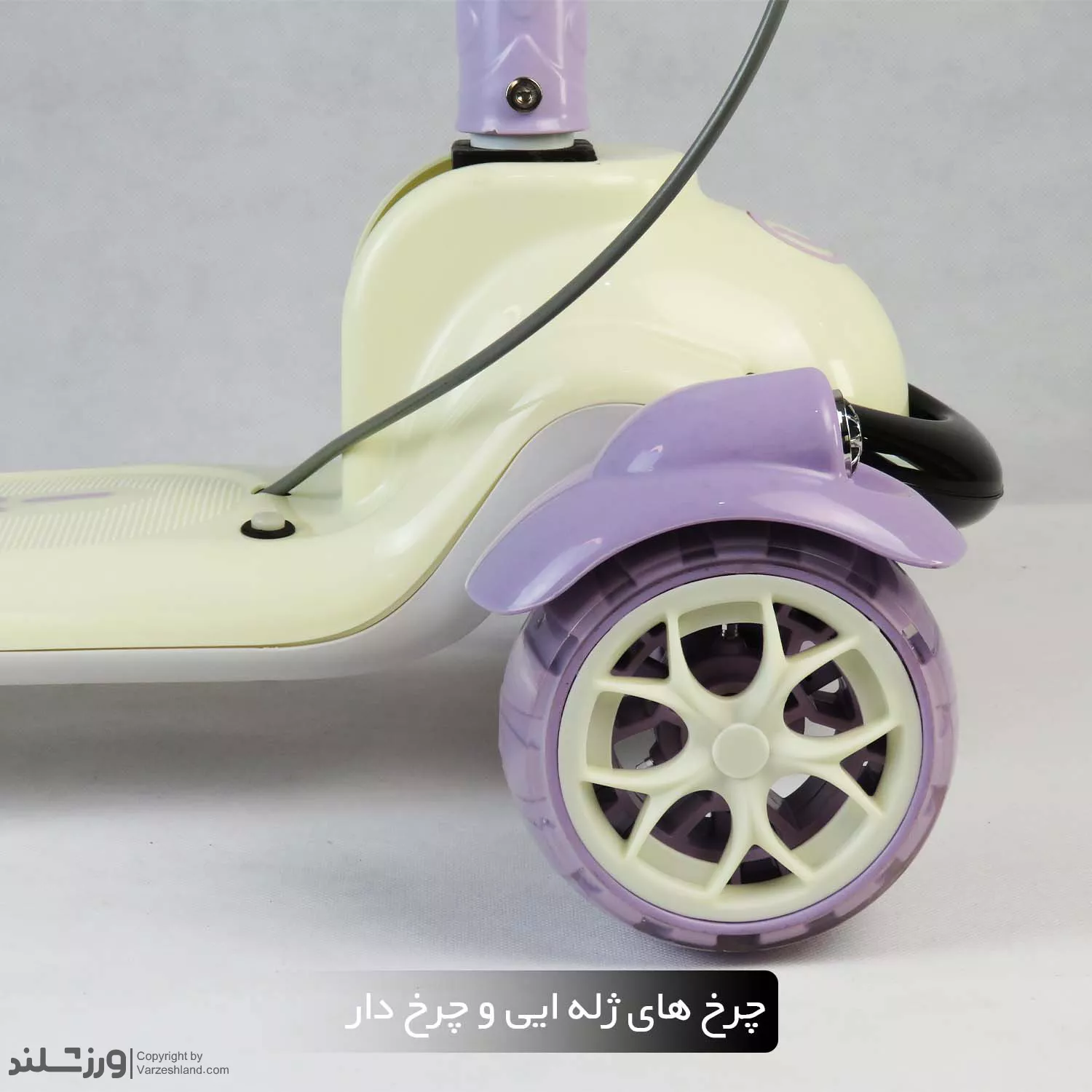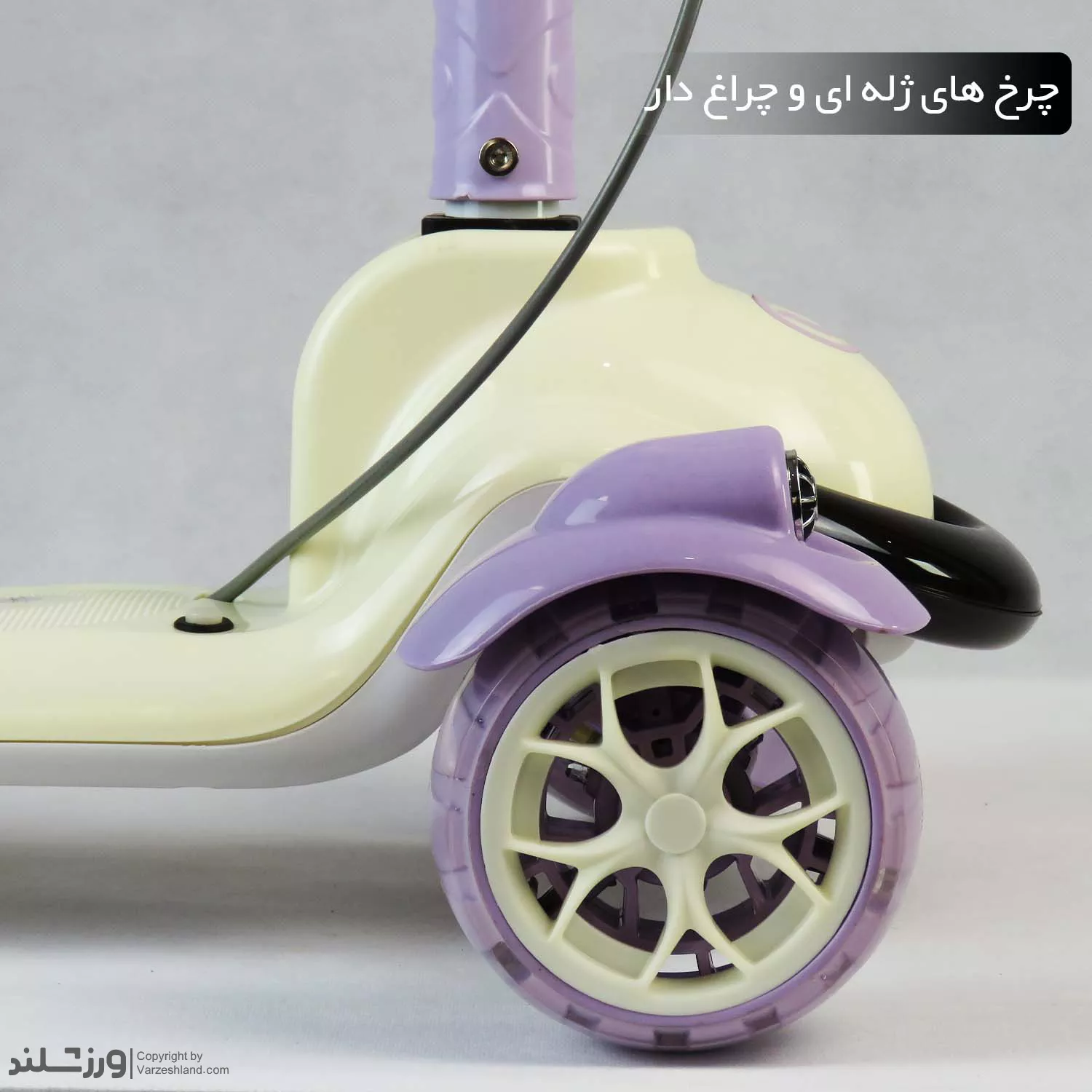 در قسمت چرخها از چرخ های ژلهای (PU) با کیفیت بالا استفاده شده که در برخورد با زمین، لرزش و ضربه را کاهش می دهد. چرخ های جلو به صورت چراغدار هستند و هنگام حرکت، نورهای رنگی جذابی تولید میکنند؛ این ویژگی برای کودکان هیجان انگیز و سرگرم کننده است. از طرفی، وجود بلبرینگ های قوی حرکت اسکوتر را بسیار روان، بدون صدا و ایمن کرده است.