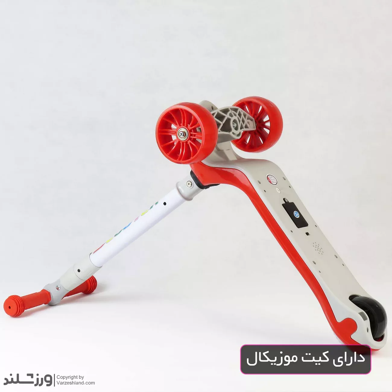 سطح زیرپایی دوجداره و ضدسایش با خطوط برجسته، از لغزش پا جلوگیری کرده و ترمز پایی چرخ عقب، توقف سریع و ایمن را تضمین میکند. علاوه بر این، اسکوتر قابلیت پخش موزیک دارد که محیط بازی کودک را شاد و جذاب میکند.