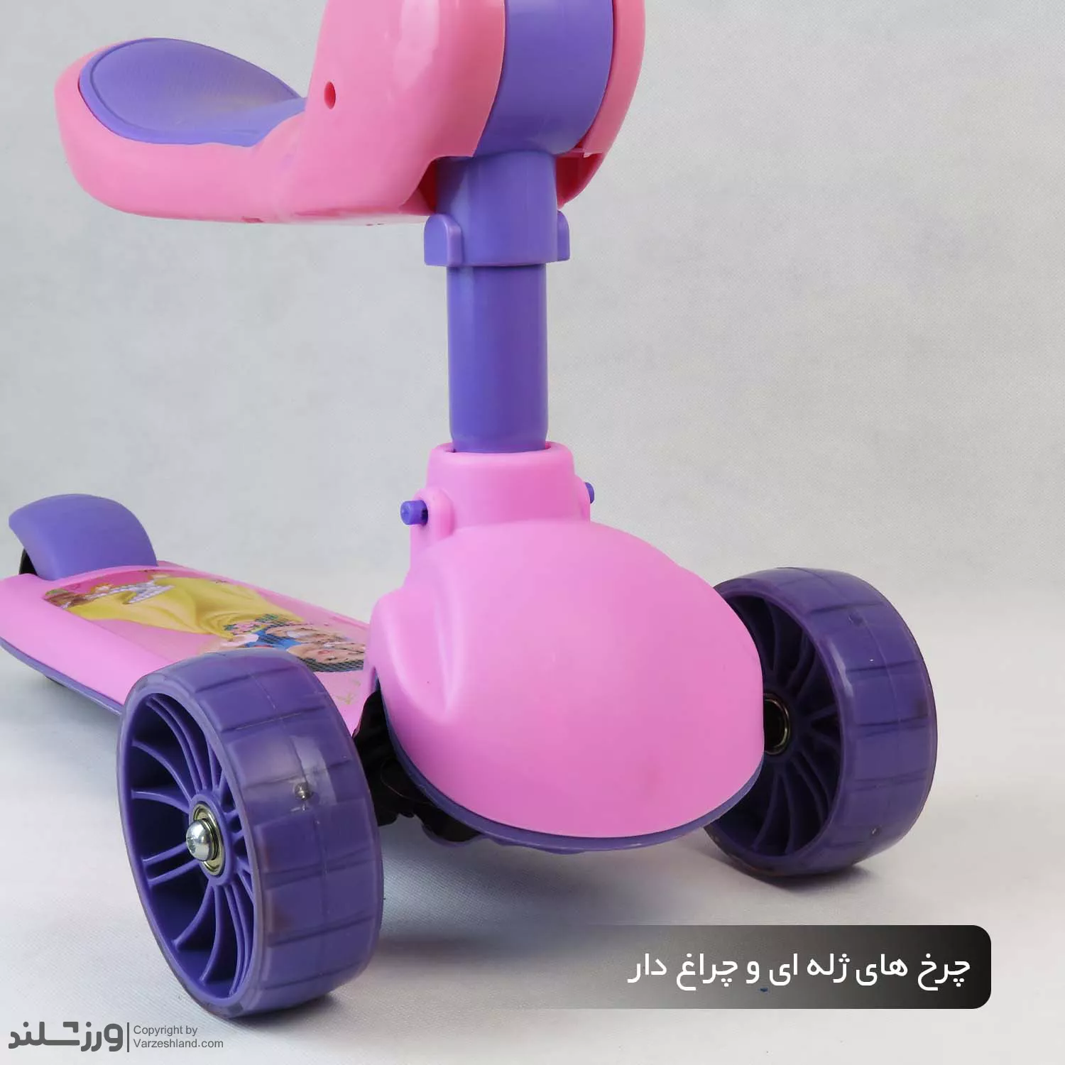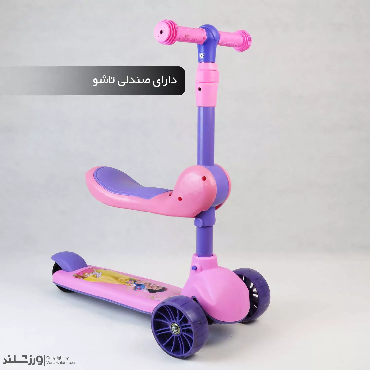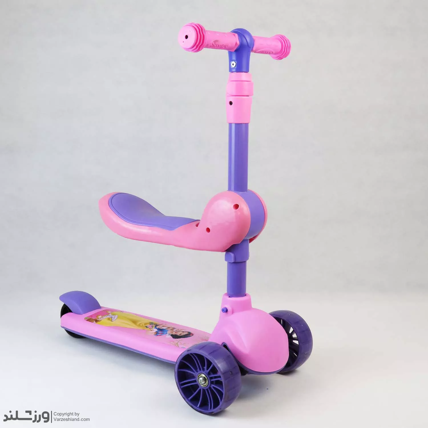 اسکوتر کودک صندلی دار سفیدبرفی کد 2121 با صندلی تاشو، چرخ‌ های چراغ‌ دار، ترمز پایی عقب و فرمان قابل تنظیم ارتفاع تا 3 مرحله ؛ مناسب بازی ایمن و هیجان‌ انگیز کودکان با تحمل وزن تا 60 کیلوگرم و تحمل صندلی تا 25 کیلوگرم .