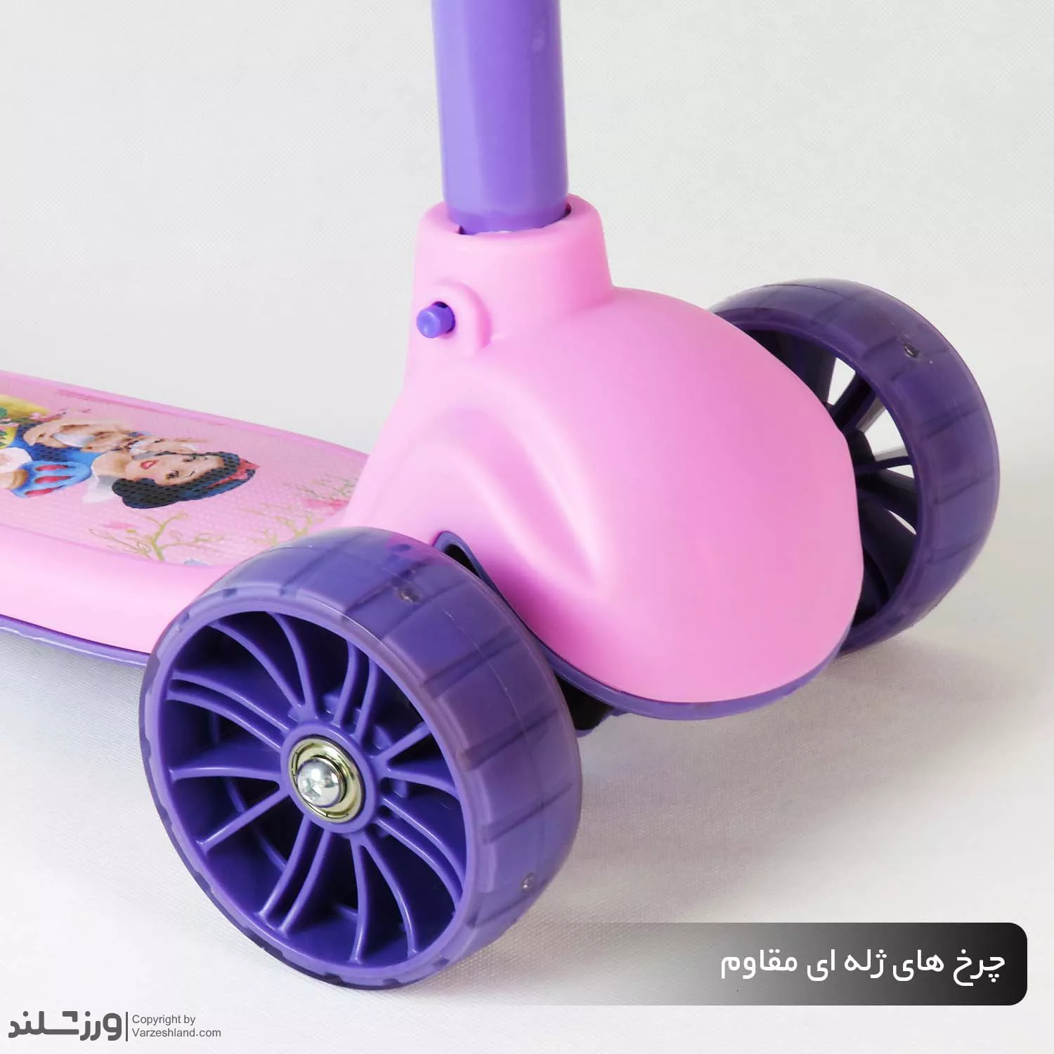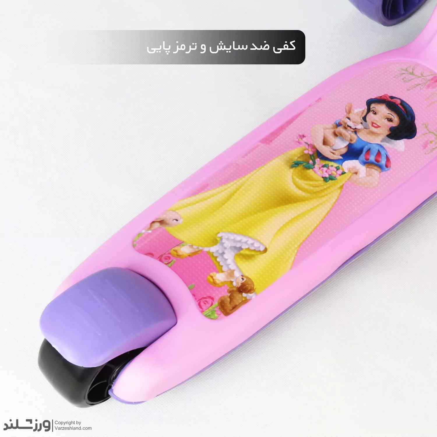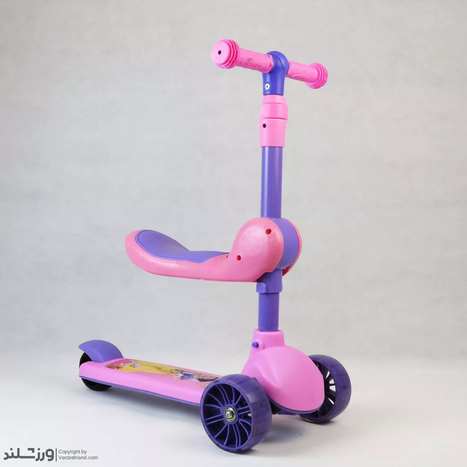 اسکوتر کودک صندلی دار سفیدبرفی کد 2121 با صندلی تاشو، چرخ‌ های چراغ‌ دار، ترمز پایی عقب و فرمان قابل تنظیم ارتفاع تا 3 مرحله ؛ مناسب بازی ایمن و هیجان‌ انگیز کودکان با تحمل وزن تا 60 کیلوگرم و تحمل صندلی تا 25 کیلوگرم .