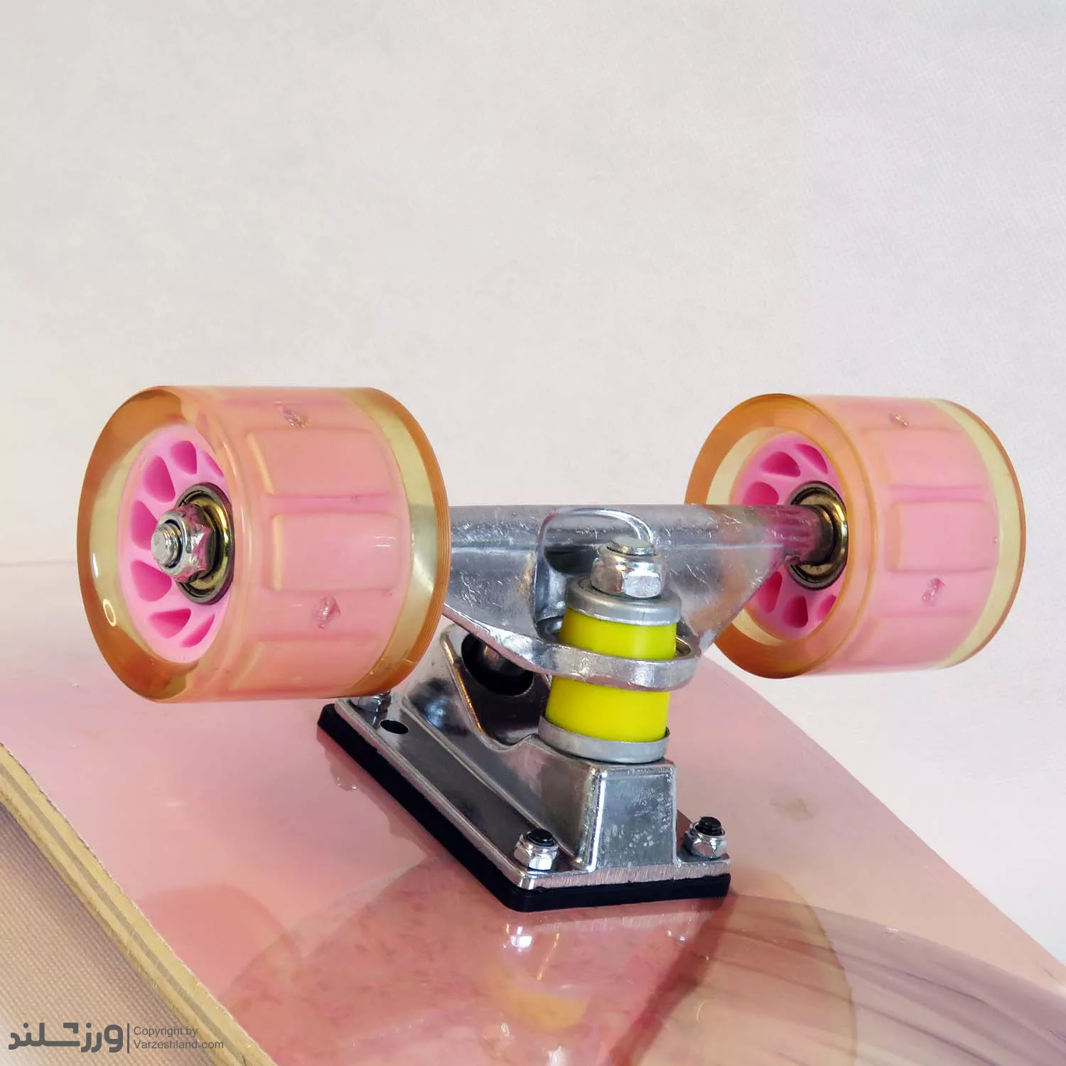 تراکهای (Trucks) محکم از جنس آلیاژ آلومینیوم، پایداری و کنترل لازم را برای هدایت اسکیت برد فراهم میکنند. چرخهای صورتی شفاف از جنس پلییورتان با سختی متعادل (حدود 95A)، سواری نرم و لذتبخشی را بر روی سطوح مختلف تجربه خواهید کرد. این چرخها، علاوه بر زیبایی بصری، چسبندگی مناسبی را به سطح زمین ارائه میدهند. بلبرینگهای دقیق ABEC-5 ، غلتش روان و سریع چرخها را تضمین کرده و سرعت ایدهآلی را برای شما به ارمغان میآورند.