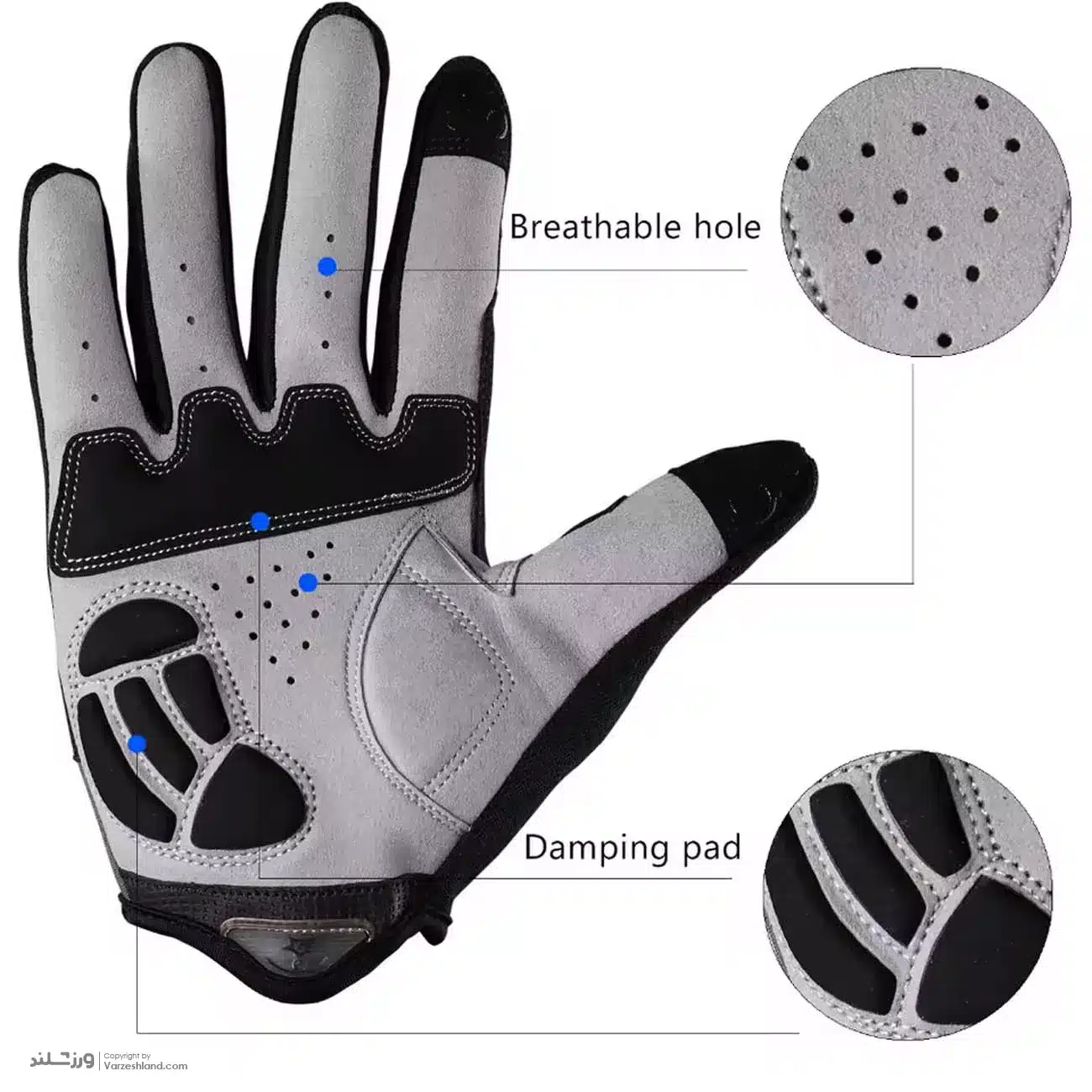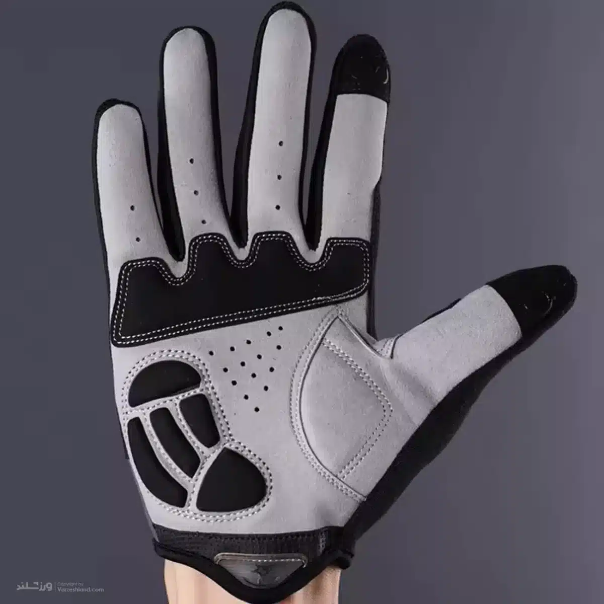 کف دستکش با چرم مصنوعی ضد لغزش و مقاوم طراحی شده است. وجود پدهای تقویتی در این بخش، عملکردی ضد ضربه (Shock Absorption) ایجاد کرده و فشار ناشی از رکابزدن یا عبور از مسیرهای ناهموار را کاهش میدهد. همین قابلیت باعث میشود کنترل شما روی فرمان دوچرخه بیشتر شده و خستگی دستها به حداقل برسد.