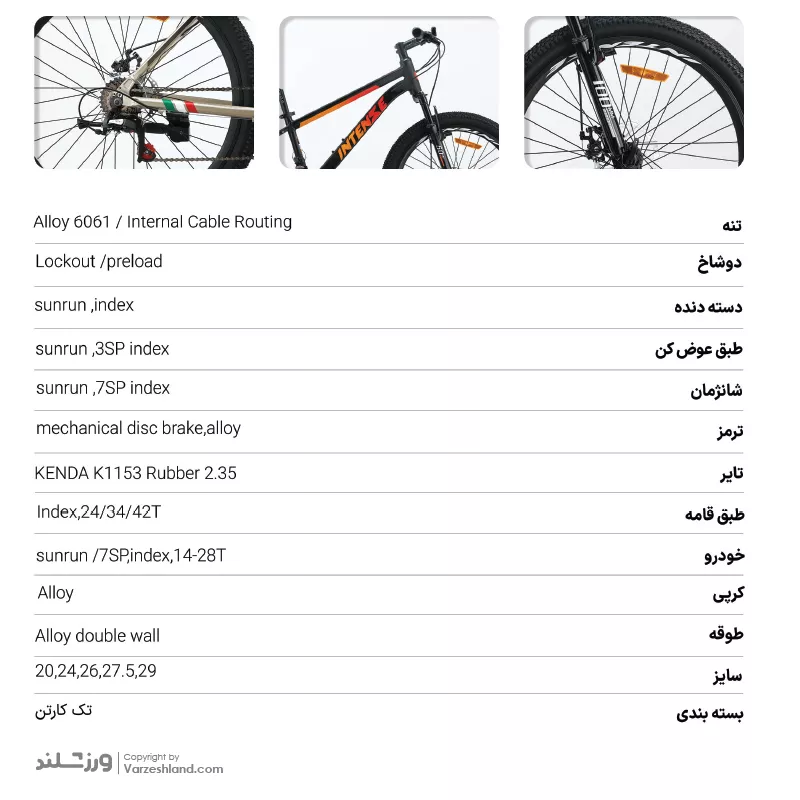 در بخش انتقال نیرو، اینتنس از سیستم دنده Sunrun Index استفاده کرده است. ترکیب شانژمان ۷ سرعته و طبق‌ عوض‌ کن ۳ سرعته در مجموع ۲۱ دنده کاربردی را در اختیار شما قرار می‌دهد تا بتوانید در مسیرهای سربالایی، سرازیری یا جاده‌ای عملکردی نرم و کنترل‌شده داشته باشید. طبق‌قامه سه‌حالته با ترکیب 24/34/42T و خودرو 14-28T نیز در هماهنگی کامل کار می‌کنند تا انتقال قدرت دقیق و روانی را فراهم کنند.