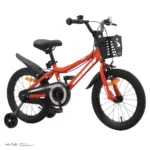 دوچرخه بچگانه راکی سایز 16 نارنجی کد 1861 با بدنه آهنی مقاوم، ترمز لقمهای ایمن، قاب زنجیر فلزی کامل، چرخهای کمکی، زین نرم و قابل تنظیم، گلگیر پرشی، سبد جلو و زنگ کودکانه، یک انتخاب عالی برای کودکان 4 تا 7 سال است.