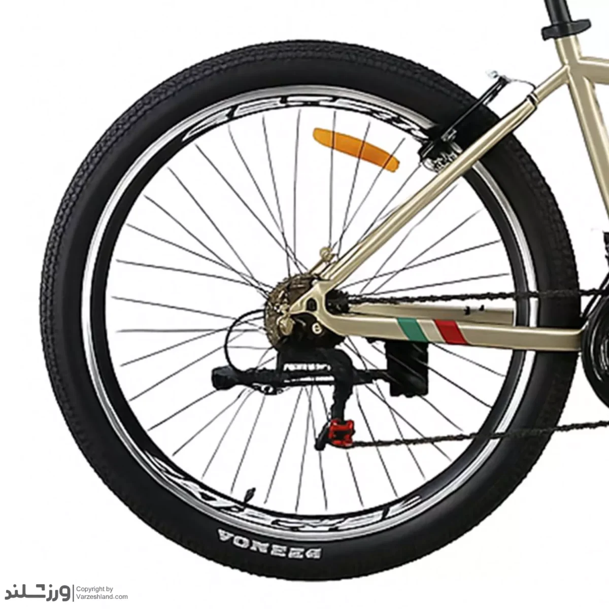 سایز ۲۶ آن برای بزرگسالان و نوجوانان گزینه ای ایده آل است. طراحی فریم با خط خمیده و رنگ خاص طلایی باعث شده این مدل جلوهای شیک و اسپرت داشته باشد و برای بانوان و آقایان جذاب باشد.
