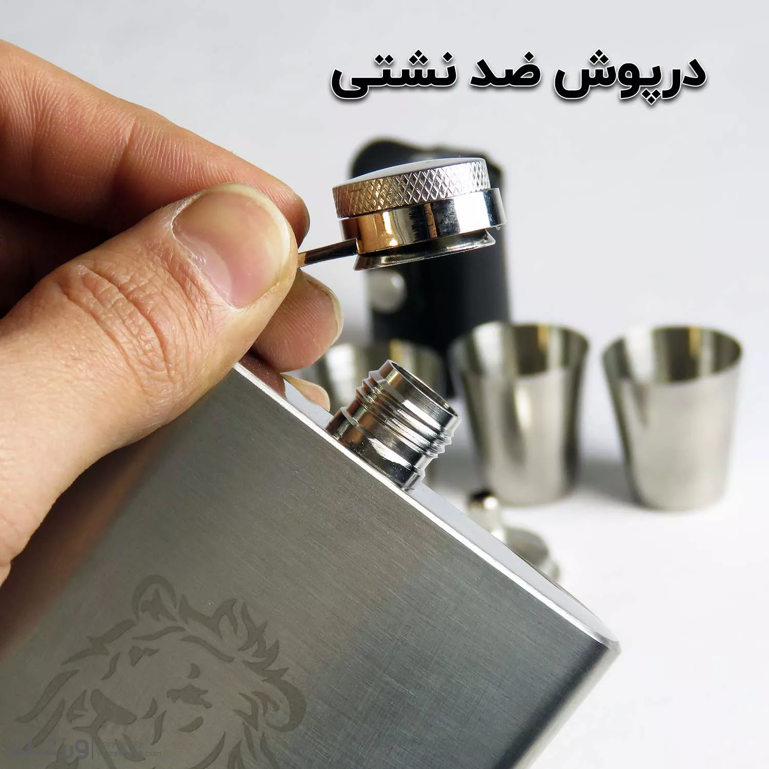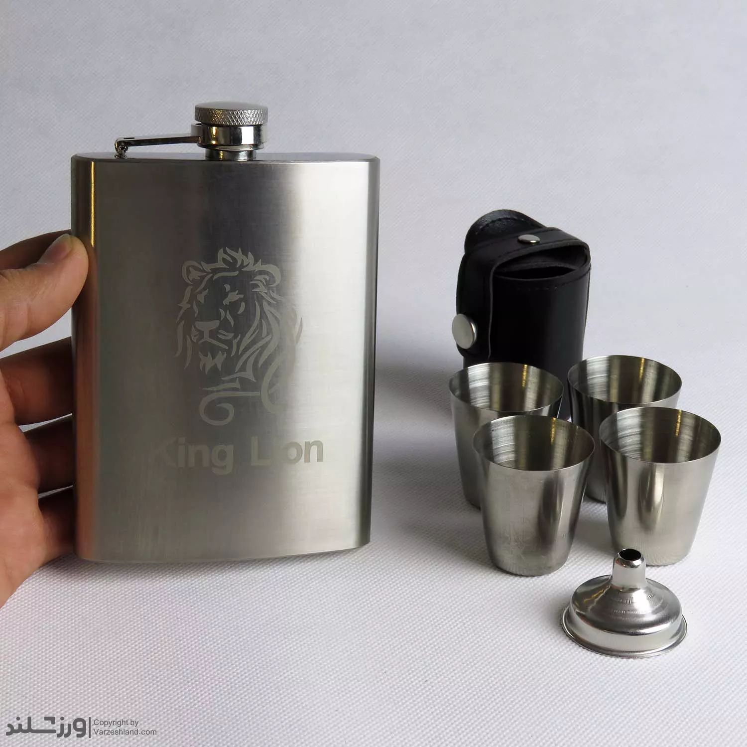 خرید ست قمقمه جیبی King Lion کد 2173 شامل قمقمه استیل ضدزنگ، 4 لیوان فلزی، قیف و کاور چرمی مشکی. مناسب سفر، کمپینگ و هدیهای خاص و کاربردی ، ظرفیت 8 اونس معادل 240 میلی لیتر