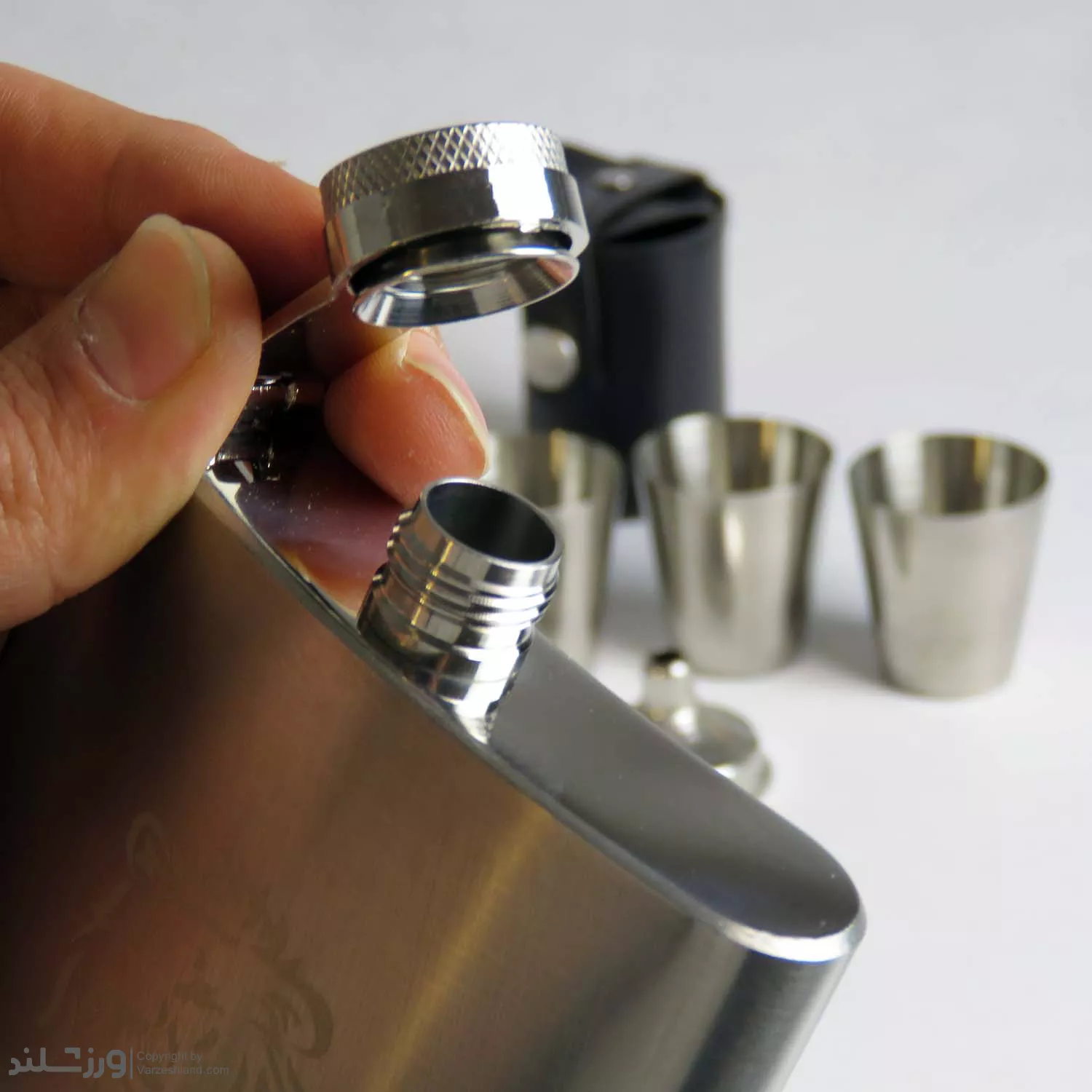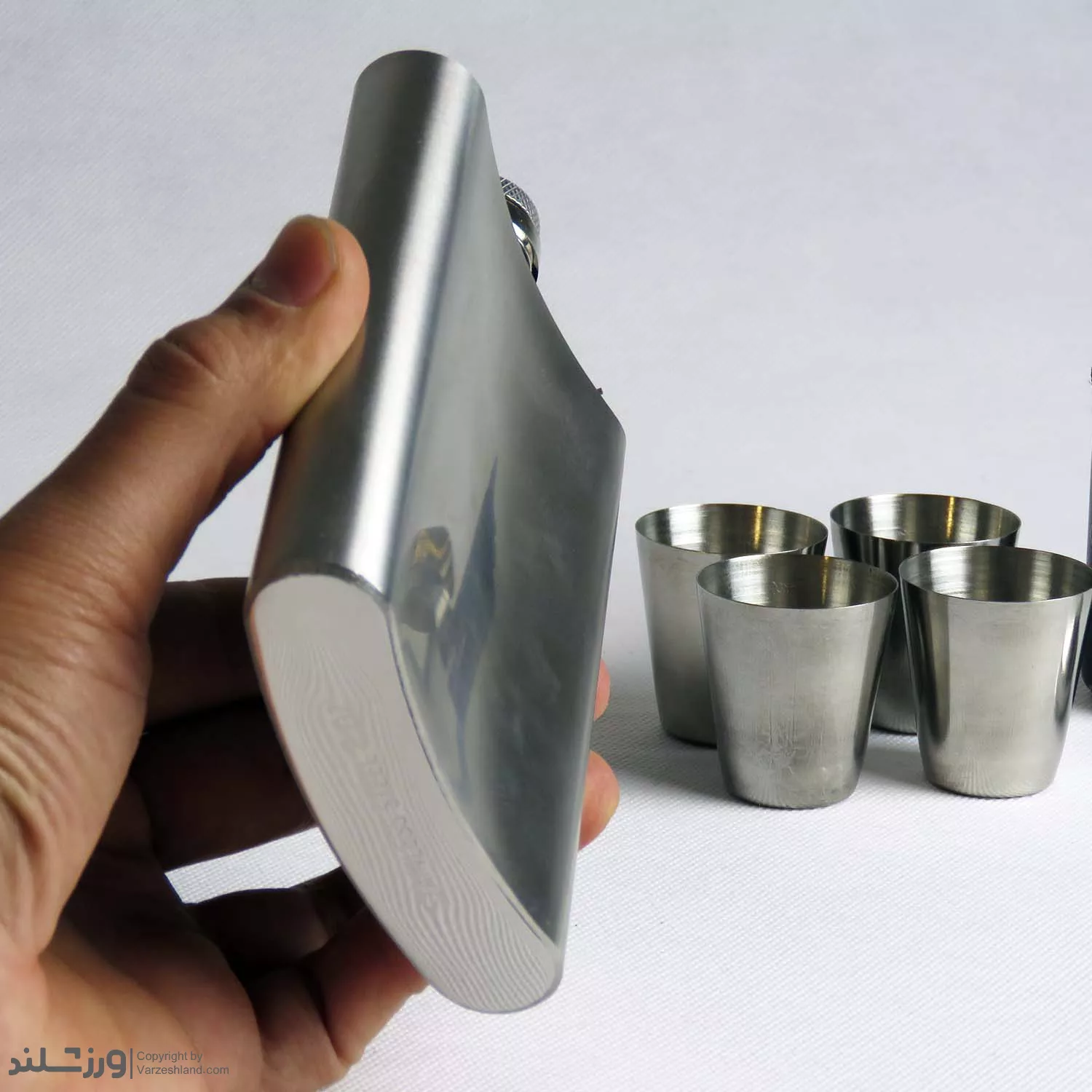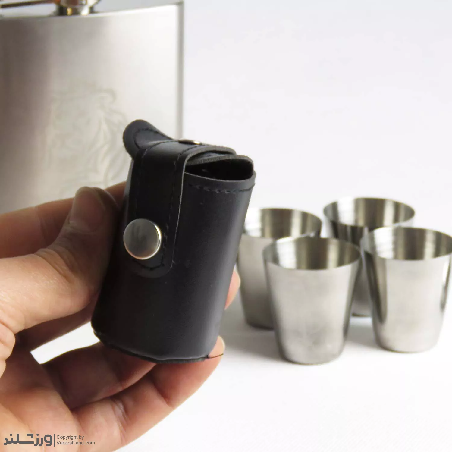 چهار لیوان استیل همراه این ست، داخل کاور چرمی دکمهدار قرار میگیرند و به راحتی قابل حمل هستند. قیف فلزی نیز برای جلوگیری از ریختن مایع هنگام پر کردن قمقمه در نظر گرفته شده است.