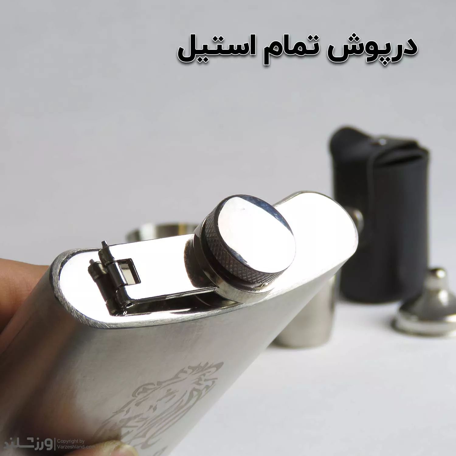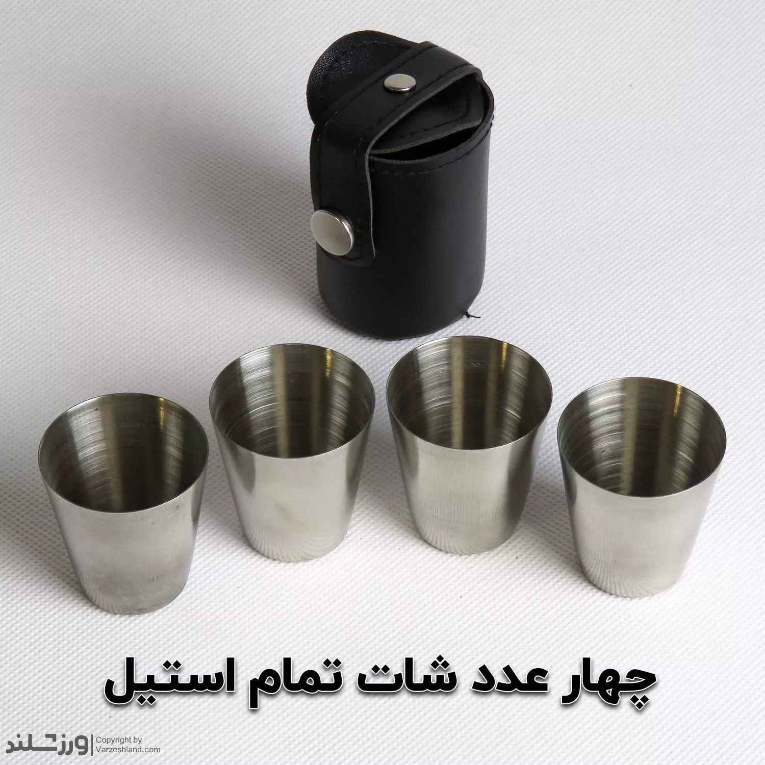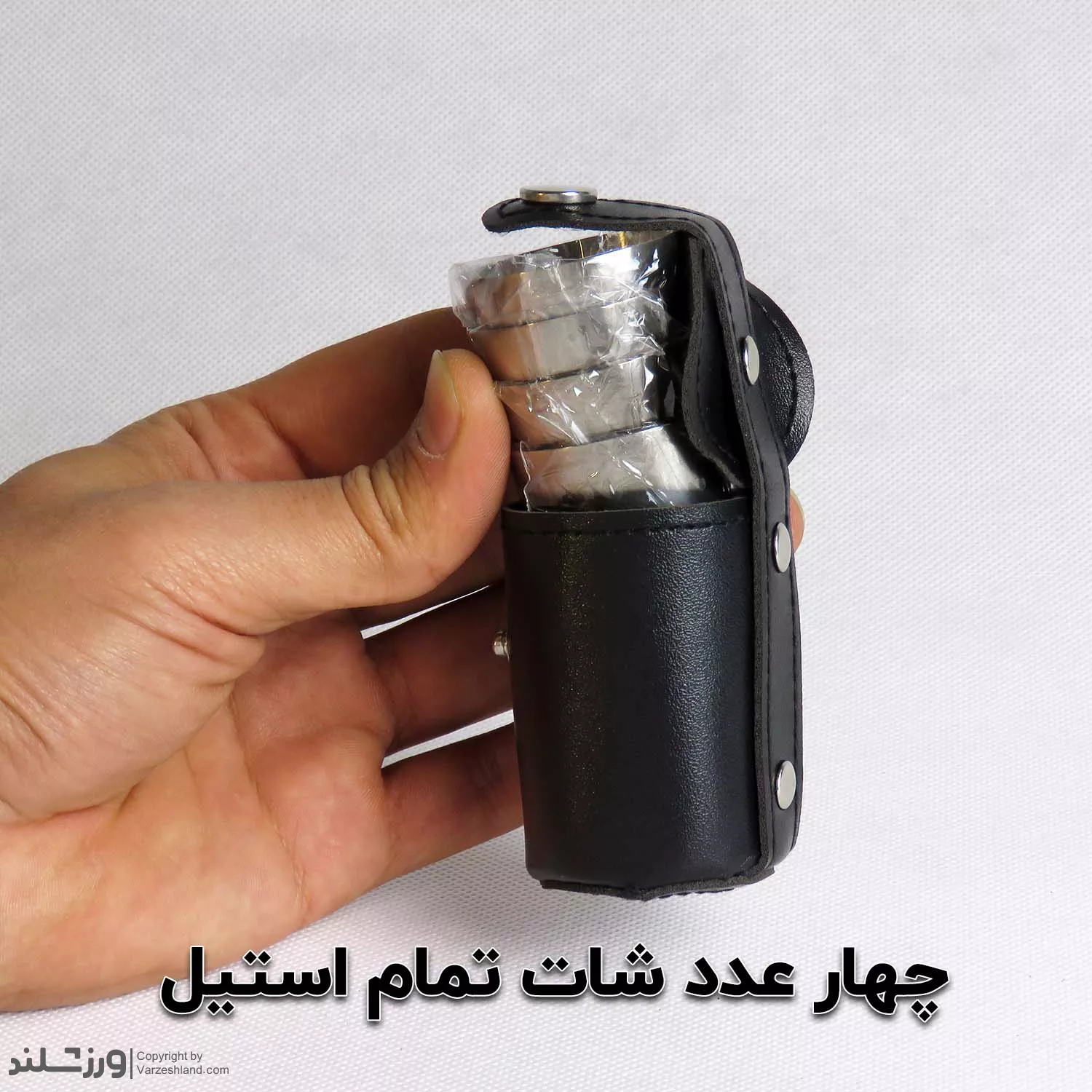 چهار لیوان استیل همراه این ست، داخل کاور چرمی دکمهدار قرار میگیرند و به راحتی قابل حمل هستند. قیف فلزی نیز برای جلوگیری از ریختن مایع هنگام پر کردن قمقمه در نظر گرفته شده است.