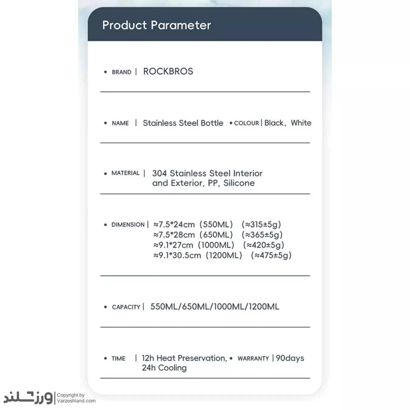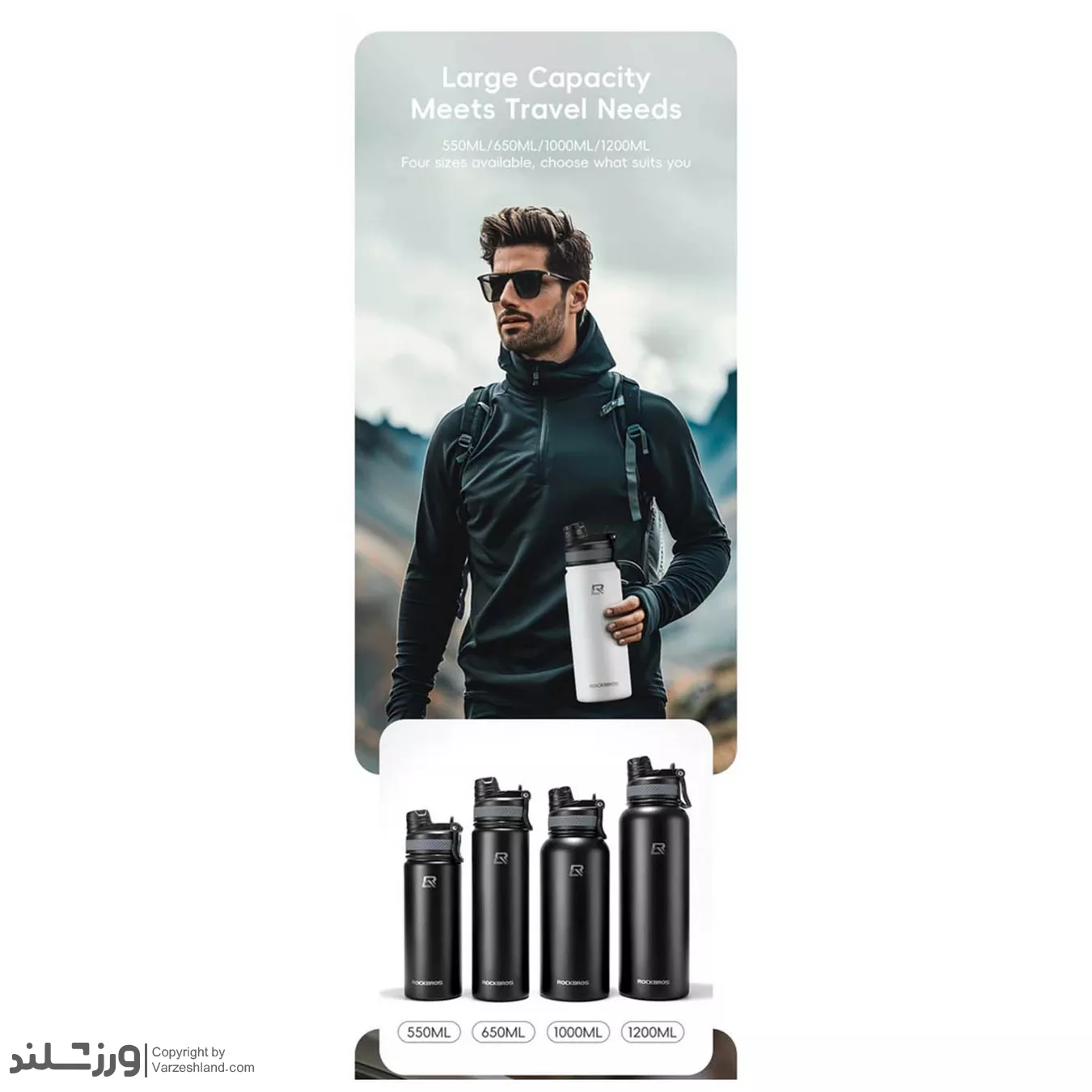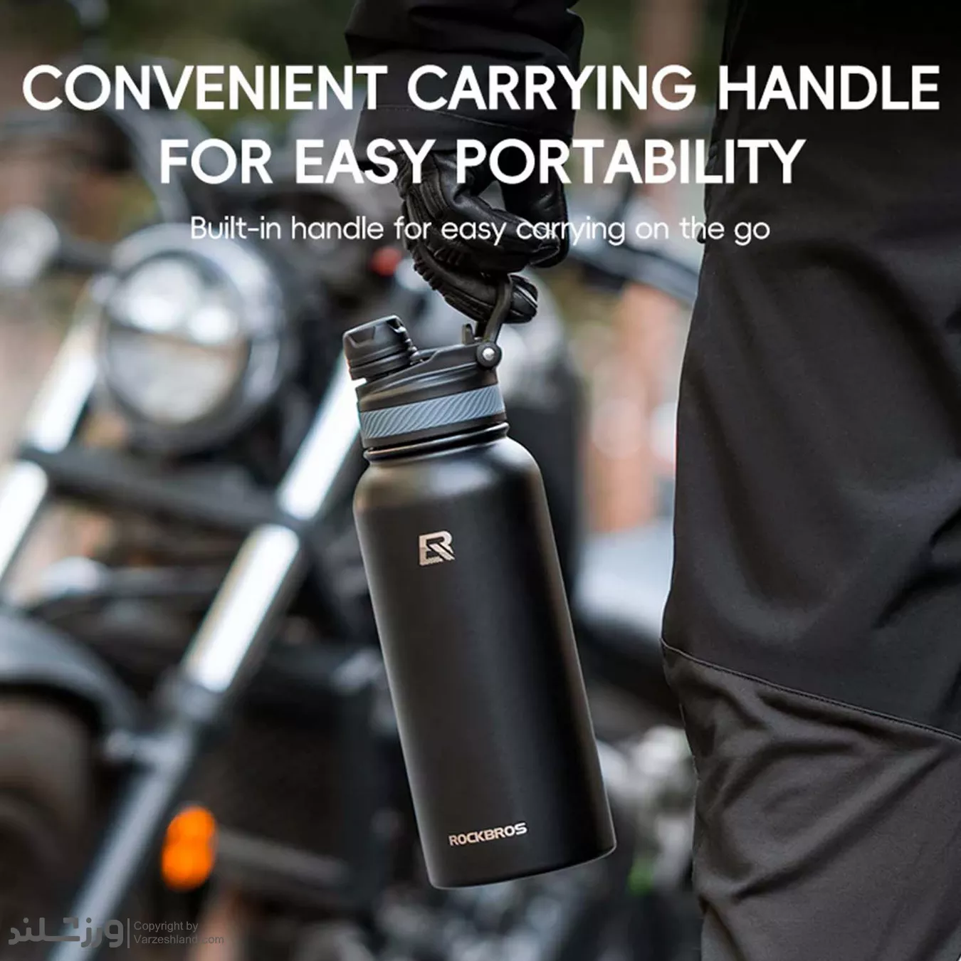دسته تعبیه شده امکان حمل راحت یا اتصال به کوله‌ پشتی را فراهم می‌کند، بنابراین بطری برای دوچرخه‌ سواری، کمپینگ، پیاده‌روی و باشگاه مناسب است. این مدل در سایز ۵۳۰ میلی‌ لیتر و در رنگ مشکی کلاسیک عرضه می‌شود. RockBros ترکیبی از دوام، راحتی و طراحی شیک است که نوشیدنی شما را در تمام طول روز در دمای مناسب نگه می‌دارد.