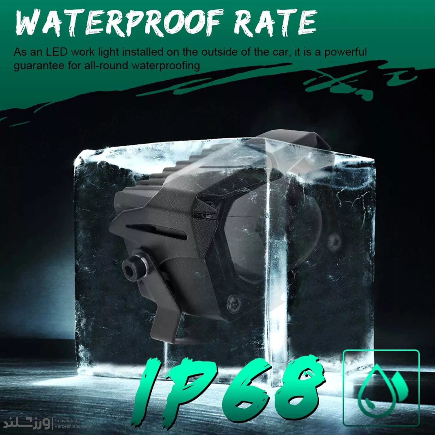 این پروژکتور دارای استاندارد IP68 است، بنابراین کاملاً ضد آب و ضد گردوغبار بوده و در شرایط بارانی شدید، گل‌آلود یا شست‌وشوی مستقیم مقاوم است. این ویژگی باعث می‌شود چراغ حتی در سخت‌ترین شرایط آب‌وهوایی عملکردی پایدار و مطمئن داشته باشد. ابعاد جمع‌وجور و طراحی مقاوم آن امکان نصب آسان روی سپر، باربند، رک سقف و انواع خودروهای SUV، وانت، پیکاپ و ماشین‌آلات صنعتی را فراهم می‌کند.