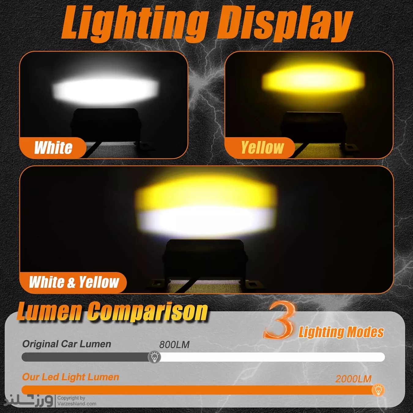 پروژکتور آفرود سه لنز 3.7 اینچ 90وات دارای سه حالت نوردهی کاربردی شامل نور سفید، نور زرد و نور ترکیبی (زرد + سفید) است. نور سفید برای رانندگی در شب و جاده‌ های تاریک، نور زرد برای شرایط مه‌آلود، بارانی و برفی و حالت ترکیبی برای حداکثر روشنایی در مسیرهای آفرودی و خارج از جاده بسیار مناسب است. دمای رنگ نور 6500 کلوین، نوری شفاف و نزدیک به نور روز ایجاد می‌کند.