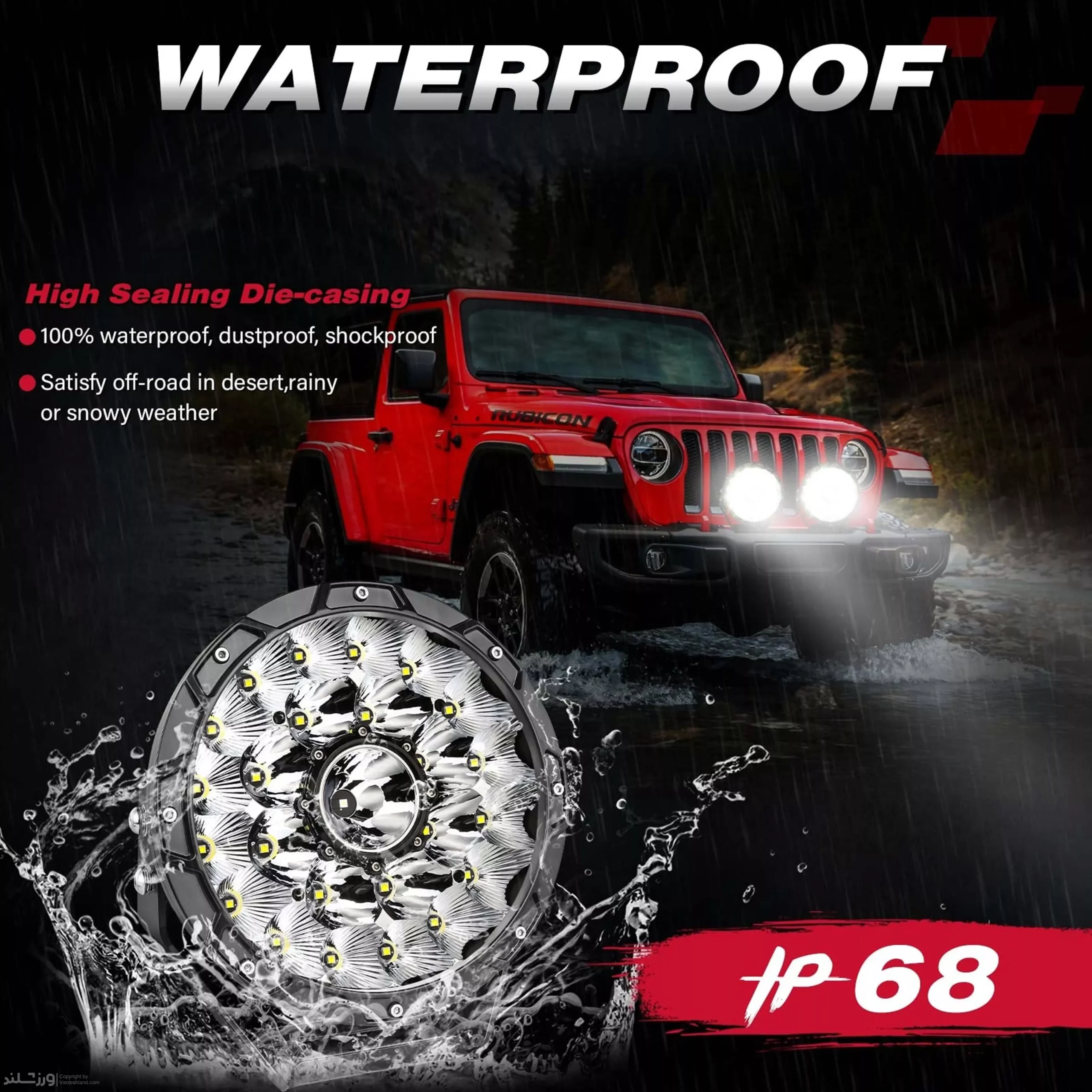 استاندارد ضدآب و ضدگردوغبار IP68 امکان استفاده مطمئن در شرایط آفرودی و صنعتی را فراهم می‌سازد. ولتاژ کاری 12 تا 24 ولت، پایه قابل تنظیم و عرضه به‌صورت پک دوتایی، این محصول را به انتخابی قدرتمند، حرفه‌ای و مقرون‌به‌صرفه برای خودروهای آفرودی، وانت و کامیون تبدیل کرده است.