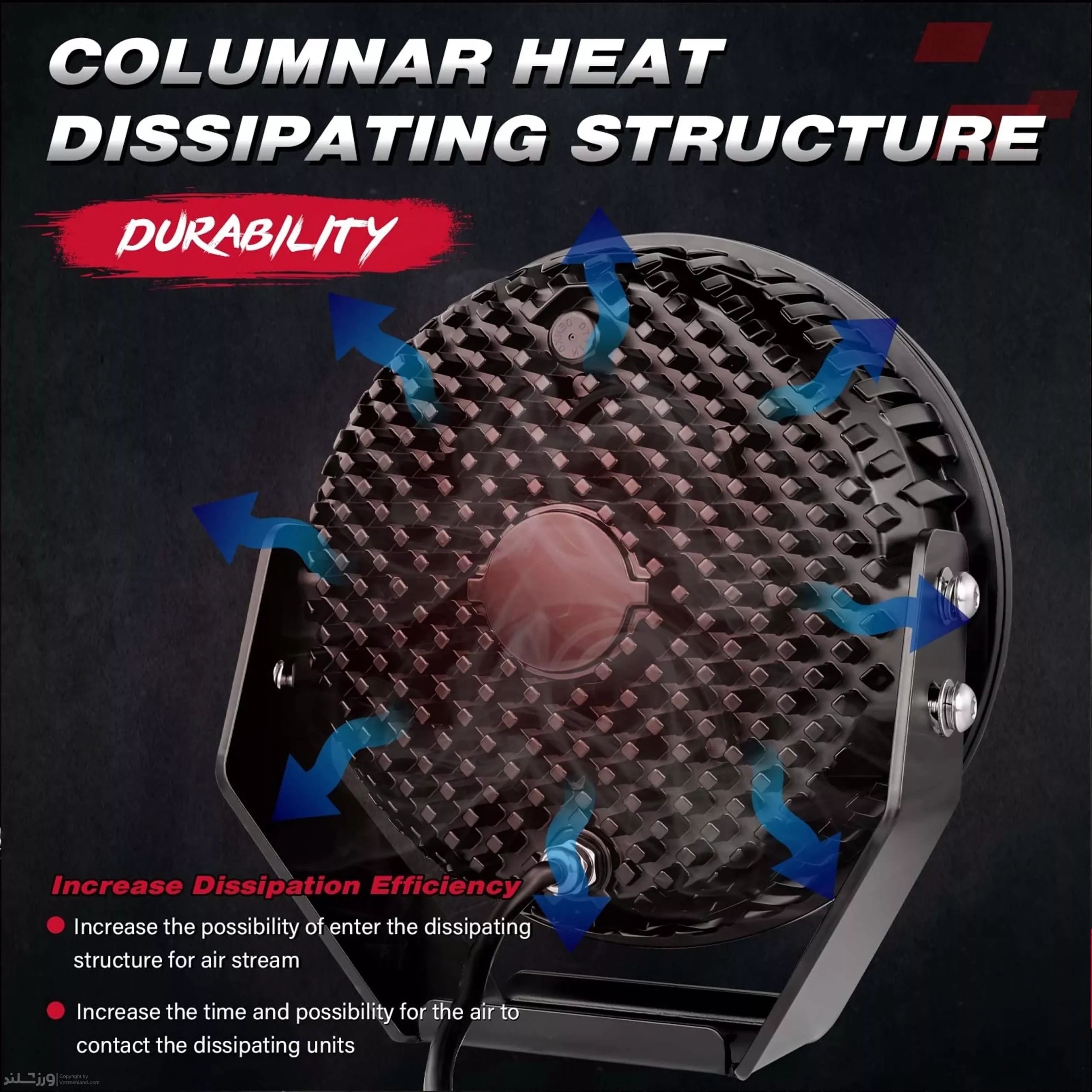 بدنه این محصول از آلومینیوم دایکست مقاوم ساخته شده و در برابر ضربه، لرزش و حرارت مقاومت بالایی دارد. طراحی مهندسی‌شده بدنه و سیستم دفع حرارت مؤثر، از داغ شدن بیش از حد جلوگیری کرده و عمر مفید چیپ‌های LED را افزایش می‌دهد. پایه فلزی قابل تنظیم نیز امکان نصب آسان و تنظیم دقیق زاویه نور را فراهم می‌کند.