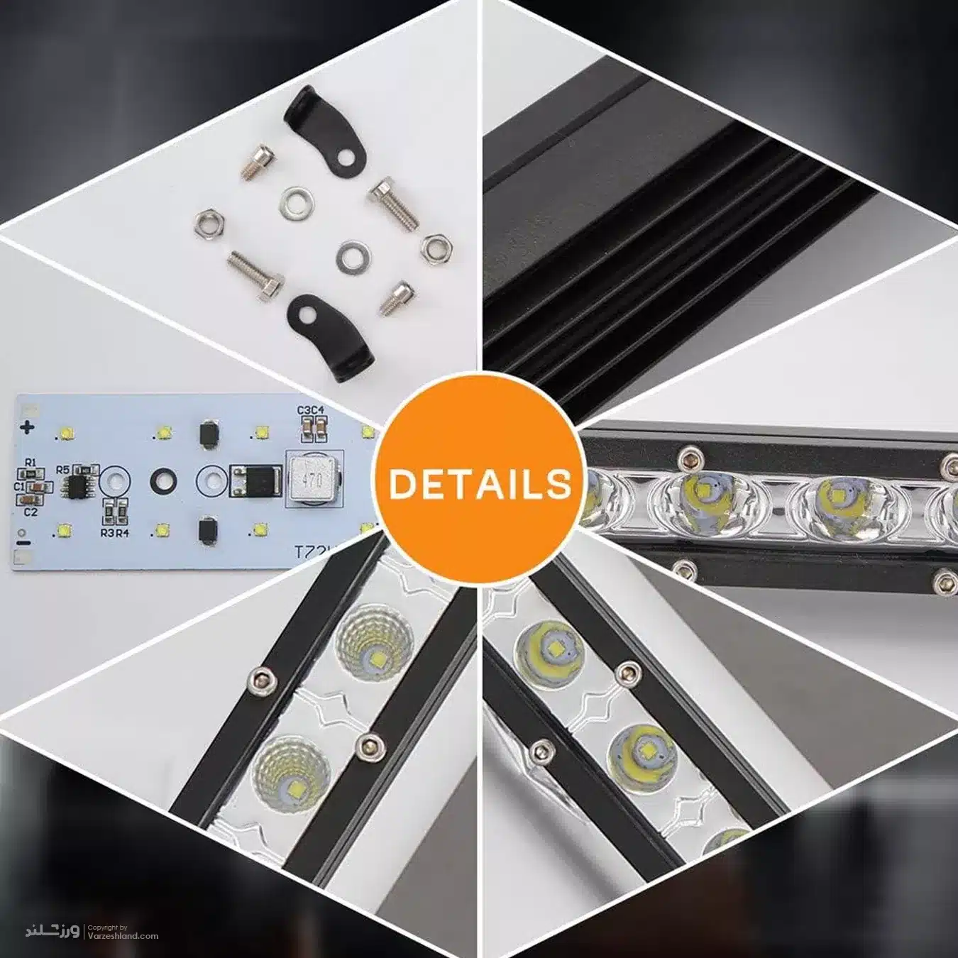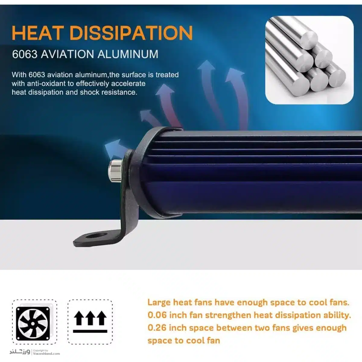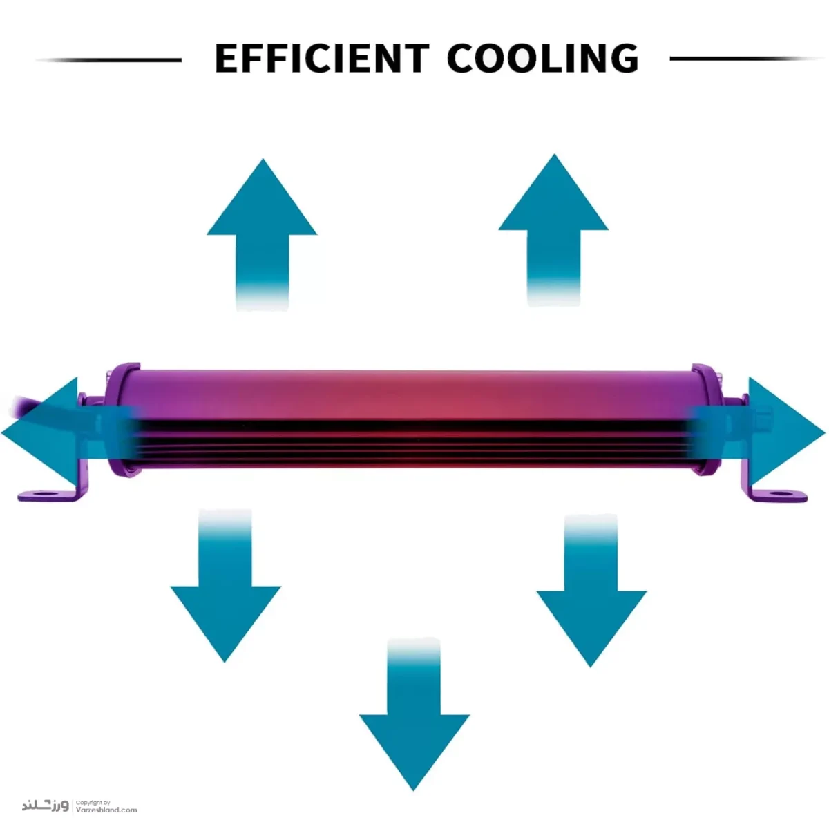 بدنه این چراغ از آلومینیوم دایکاست مقاوم ساخته شده است که علاوه بر استحکام بالا، به لطف شیارهای خنککننده تعبیهشده روی آن، از افزایش دما و آسیب به چیپهای LED جلوگیری میکند. رنگ مشکی مات بدنه نیز باعث شده تا ظاهر این پروژکتور کاملاً اسپرت و هماهنگ با خودروهای آفرود و SUV به نظر برسد.