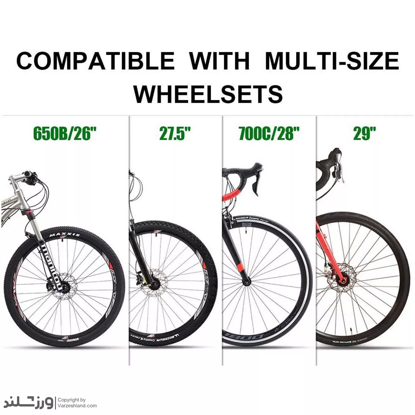 ✔ قابلیت استفاده برای سایزهای استاندارد چرخ دوچرخه (مثلاً 26 تا 29 اینچ در نسخههای مشابه).