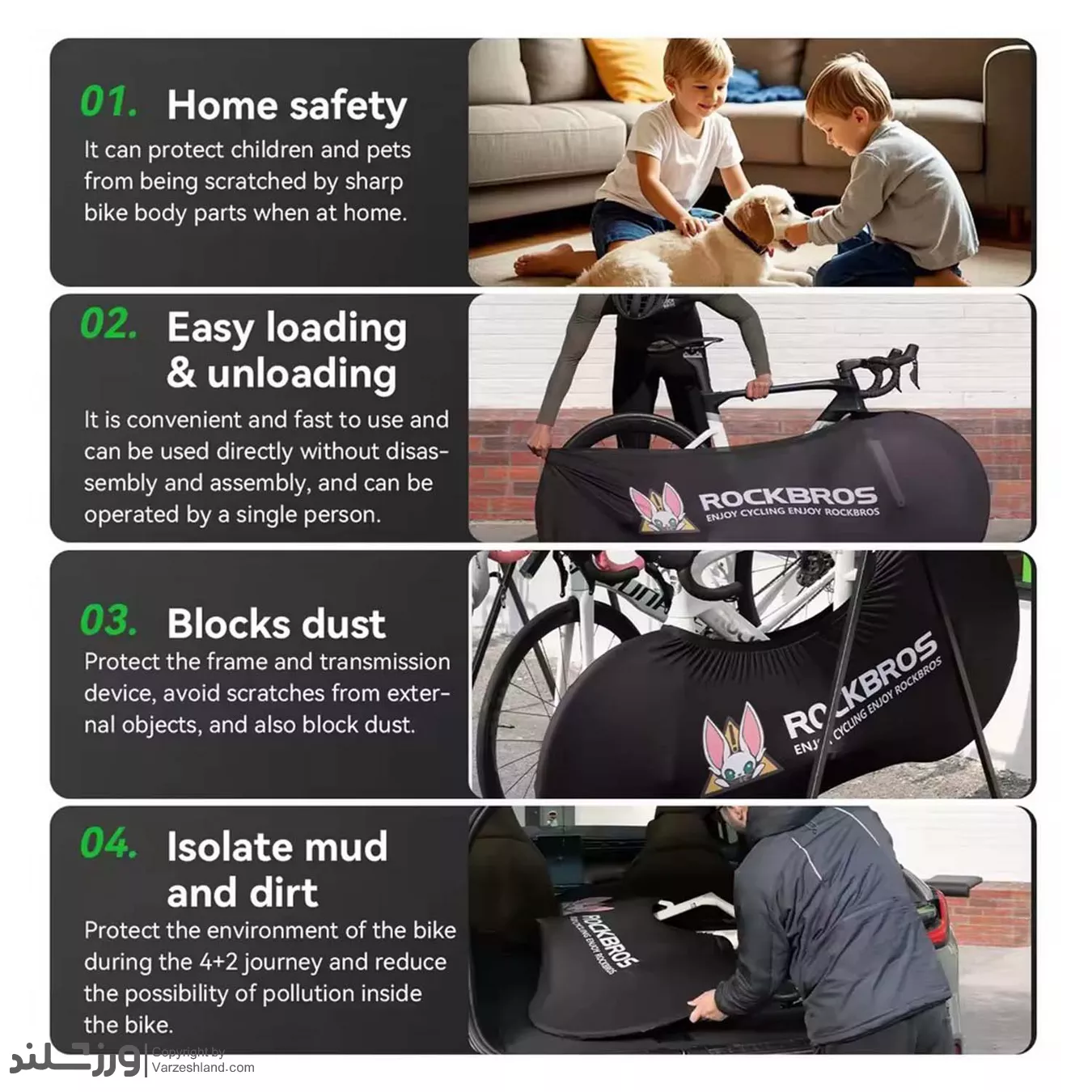 محافظت از بدنه دوچرخه در برابر آب، گردوغبار، خط و خش و آفتاب هنگام پارک یا حملونقل.