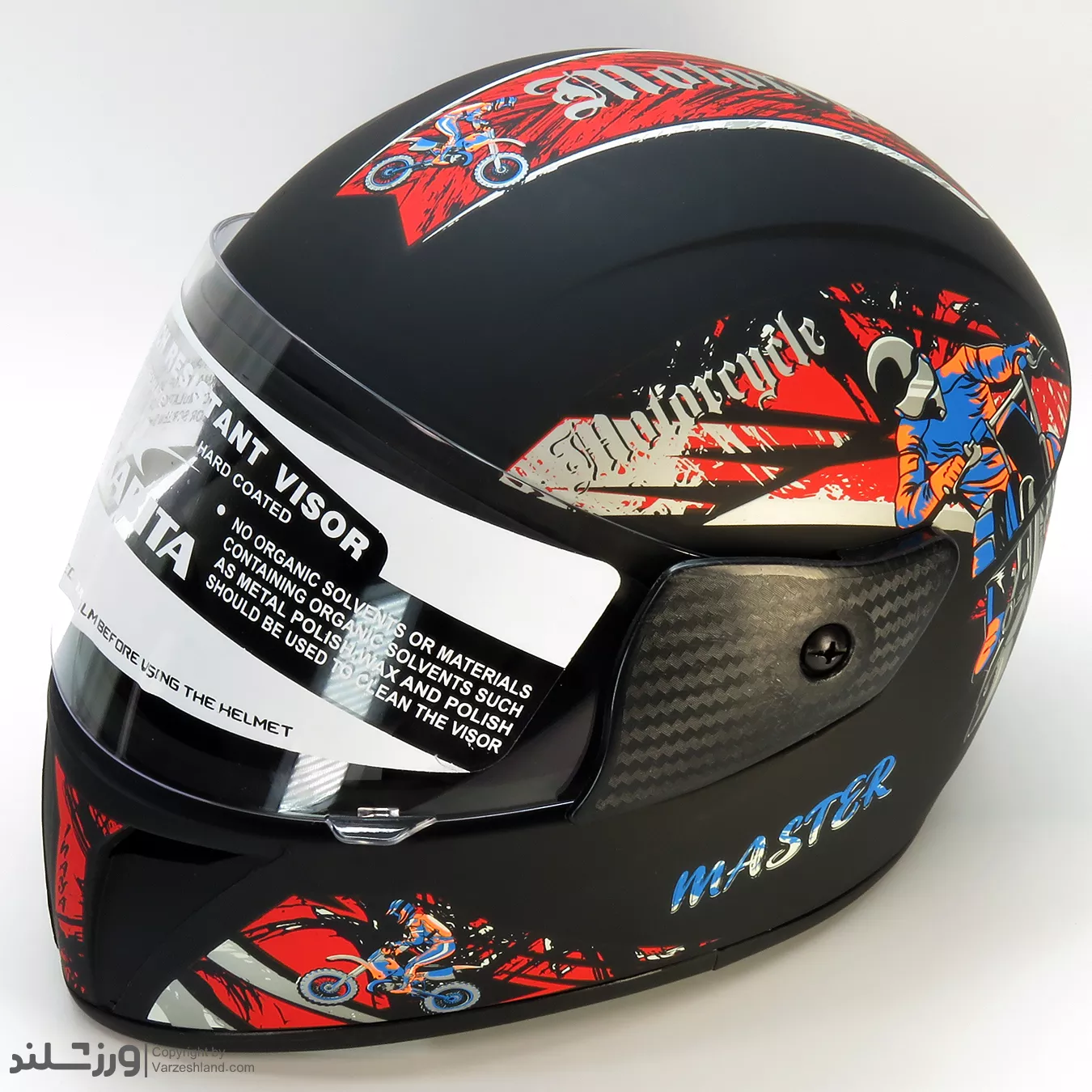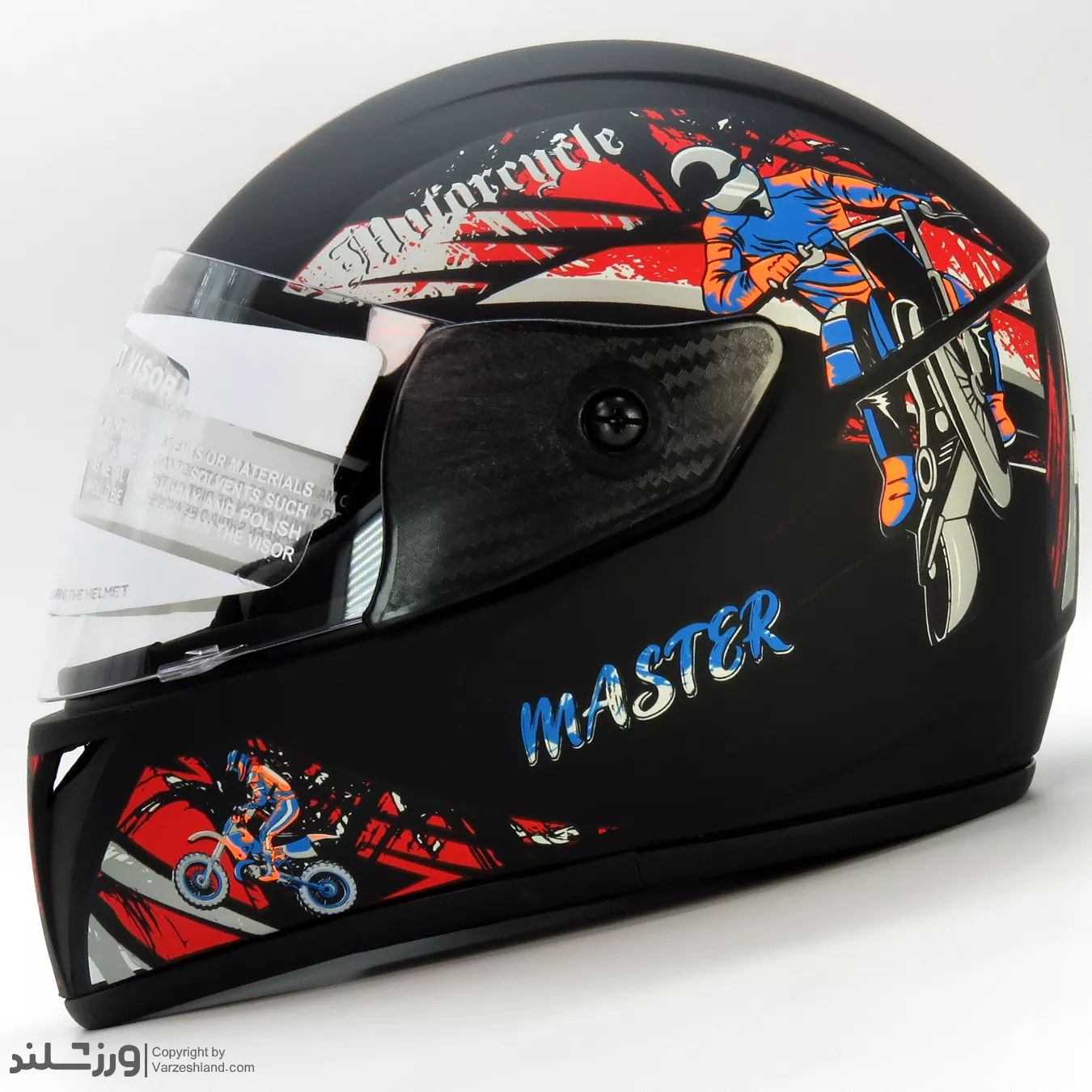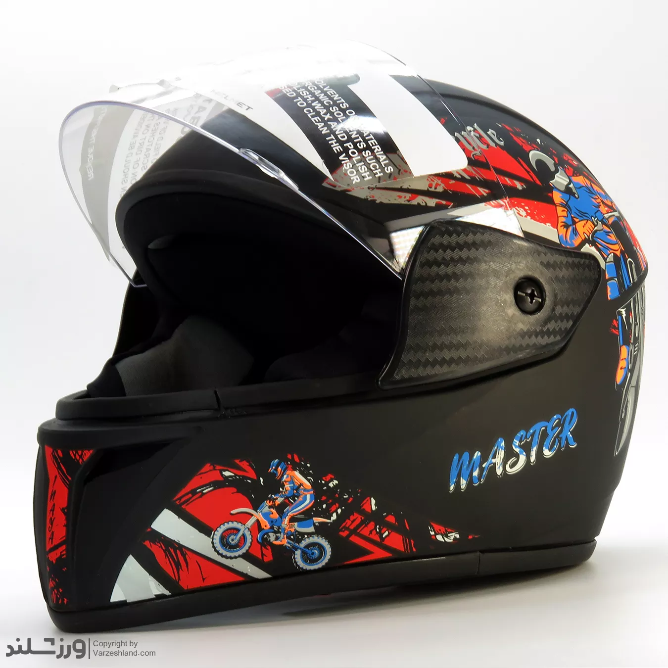 در طراحی بیرونی، رنگ مشکی مات با ترکیب قرمز و طرح گرافیکی موتورسوار باعث جذابیت بیشتر این مدل شده است. نوشته ی برجستهی MASTER در کنارهی کلاه، حس قدرت و ماجراجویی را به کودک القا میکند.