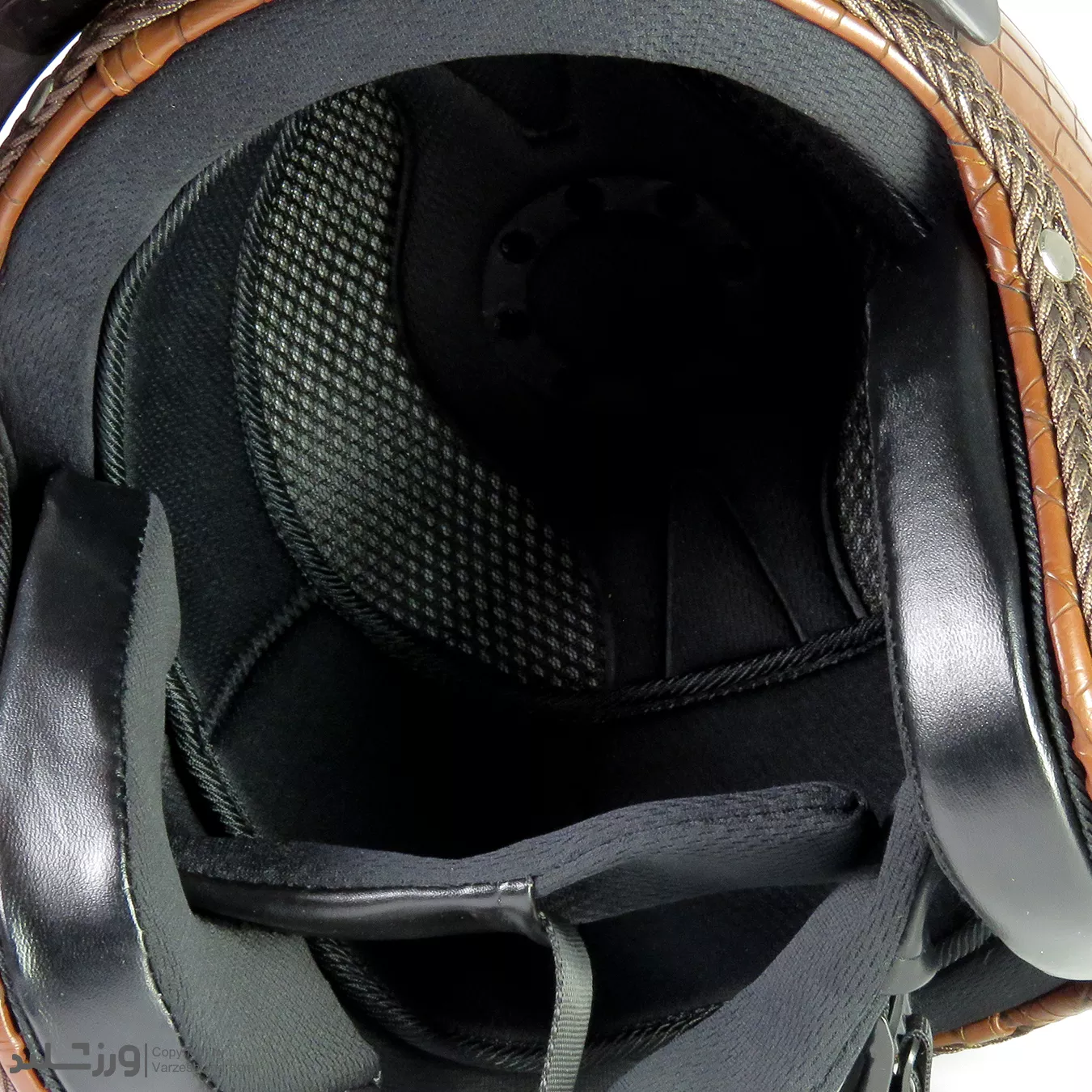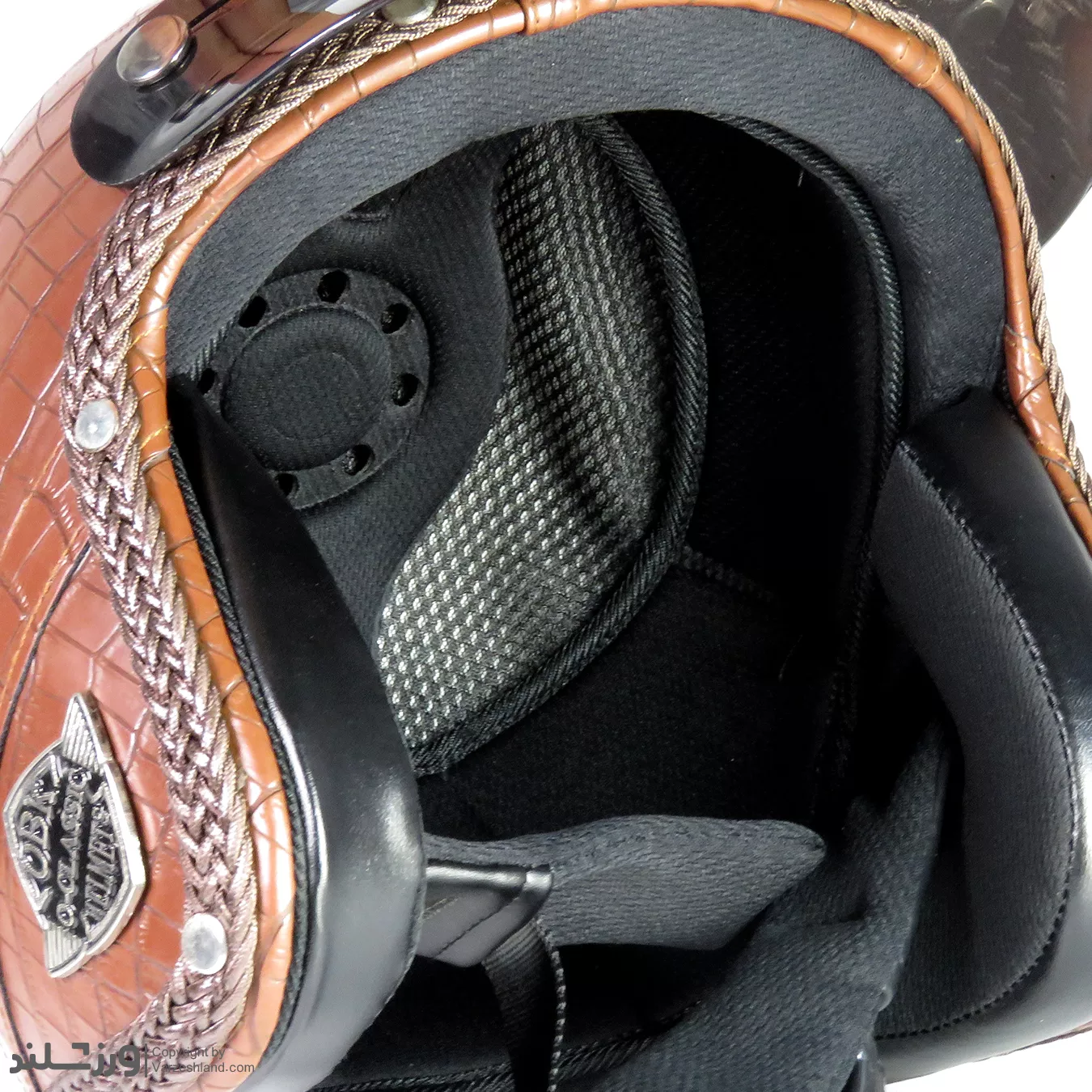 بدنهی اصلی کلاه از پلاستیک فشرده ABS مقاوم در برابر ضربه ساخته شده و رویه ی آن با چرم مصنوعی طرح پوست سوسماری (Crocodile Pattern) پوشیده شده است. این چرم نهتنها جلوهای لوکس به کلاه میبخشد، بلکه در برابر سایش و خطوخش نیز مقاوم است. دوخت ظریف و تزئینی دور تا دور کلاه کاسکت، زیبایی آن را دوچندان کرده و حس یک محصول دستساز و خاص را به کاربر منتقل میکند.