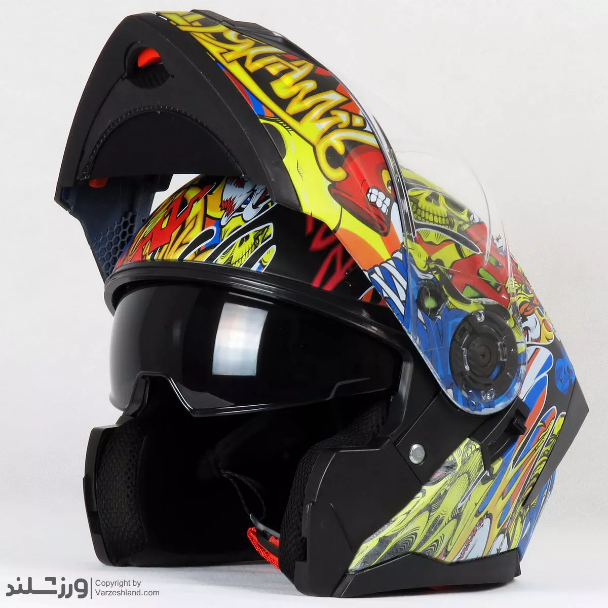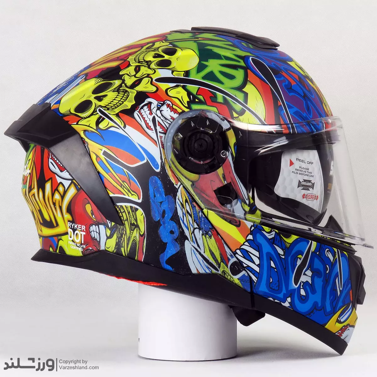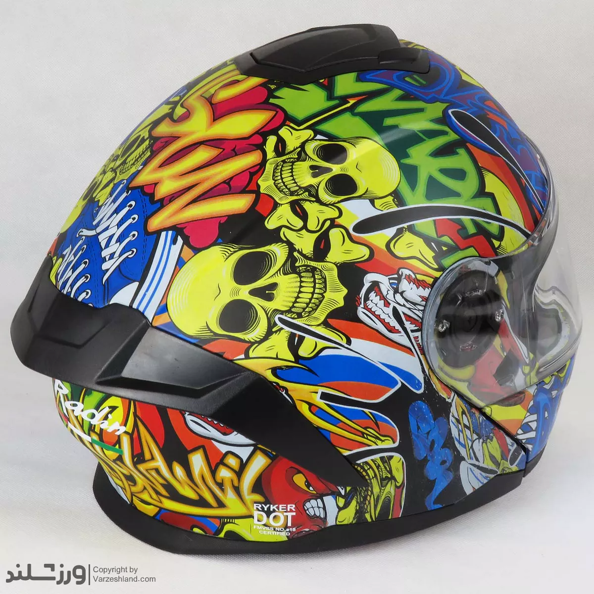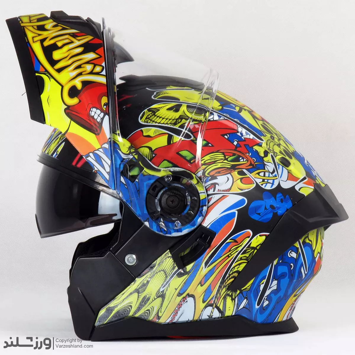کلاه کاسکت Graffix رادین کد 1949 با طراحی منحصر به فرد گرافیتی، انتخابی ایدهآل برای موتورسواران جوان و عاشقان استایل خیابانی است. این مدل ترکیبی از رنگهای زرد، آبی، قرمز، سفید و مشکی دارد و خطوط گرافیتی، اسکلتهای کارتونی و نوشتههای اسپرت آن، ظاهری پرانرژی و چشمگیر به کلاه بخشیده است.