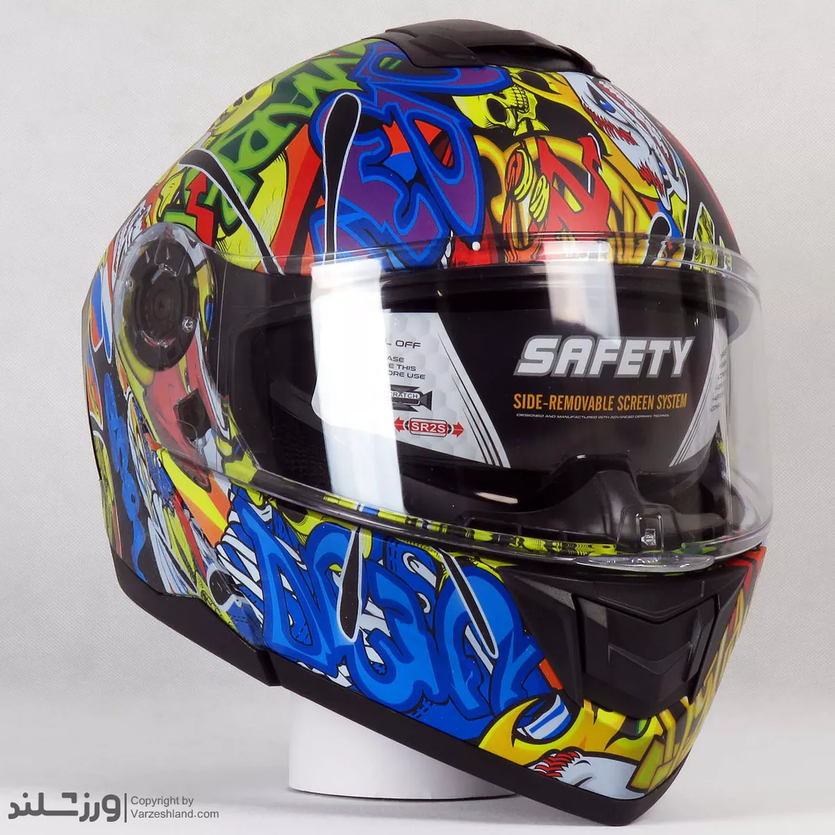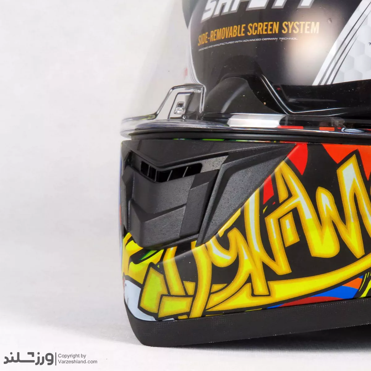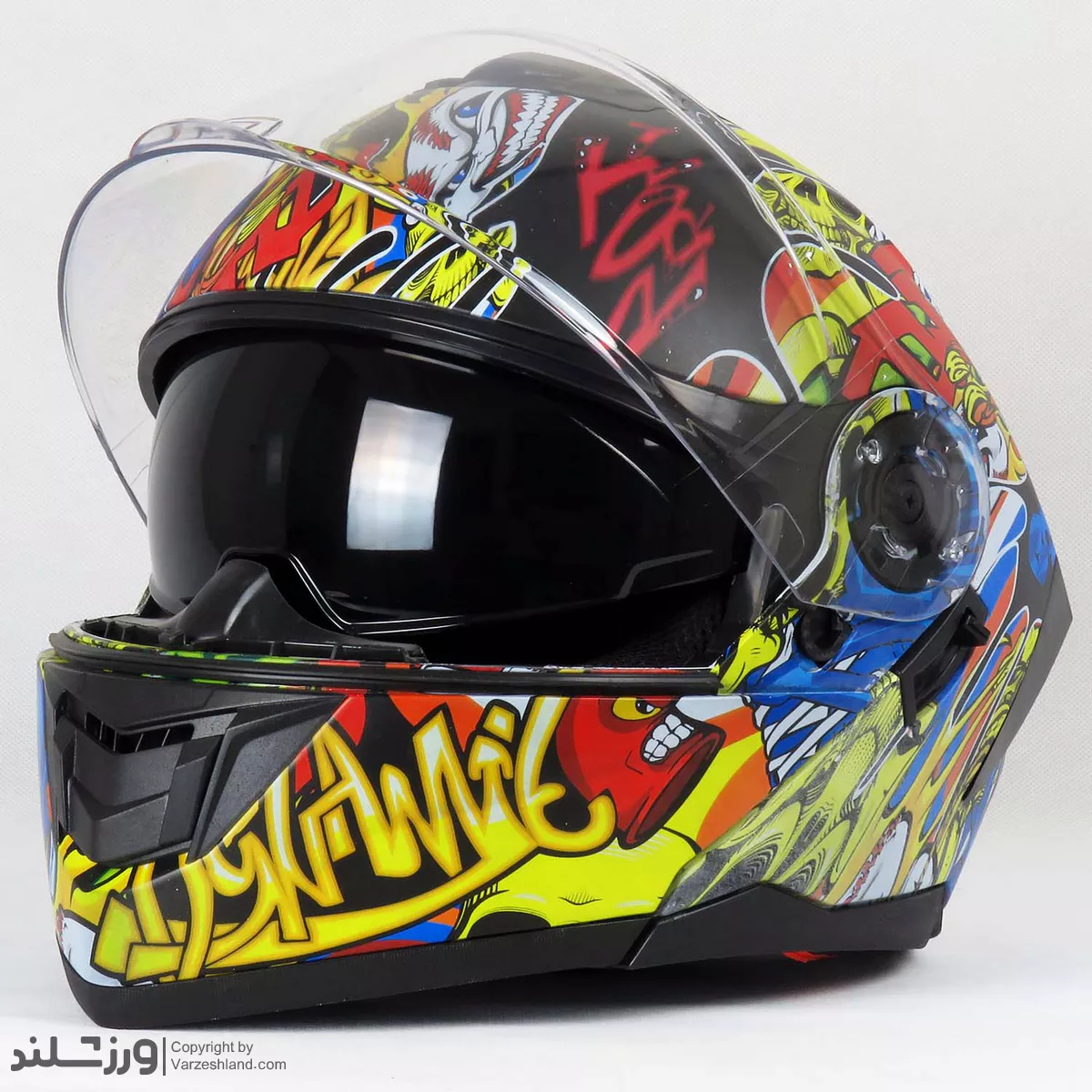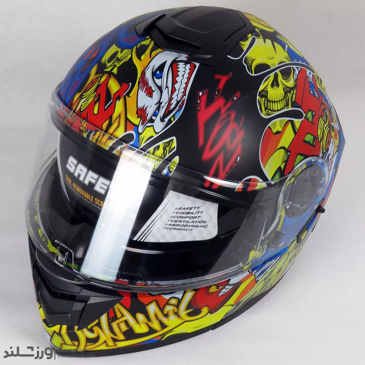 کلاه کاسکت Graffix رادین کد 1949 با طراحی منحصر به فرد گرافیتی، انتخابی ایدهآل برای موتورسواران جوان و عاشقان استایل خیابانی است. این مدل ترکیبی از رنگهای زرد، آبی، قرمز، سفید و مشکی دارد و خطوط گرافیتی، اسکلتهای کارتونی و نوشتههای اسپرت آن، ظاهری پرانرژی و چشمگیر به کلاه بخشیده است.