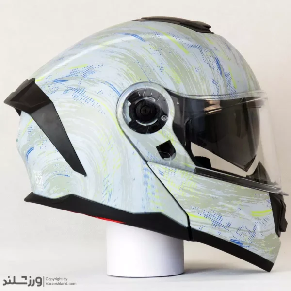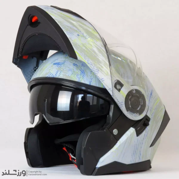 یکی از مهم ترین مزیت های این مدل، وجود فک متحرک یا Flip-Up است. این سیستم امکان تبدیل سریع کلاه از حالت تمامفک به نیمفک را فراهم می کند و آزادی عمل بیشتری هنگام مکالمه، سوخت گیری و توقفهای کوتاه به شما می دهد. قفل فک نیز از نوع مقاوم و ایمن است تا در زمان حرکت کاملاً ثابت و بدون لرزش بماند.