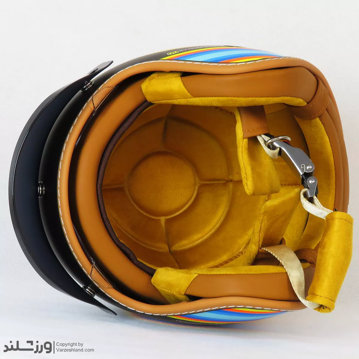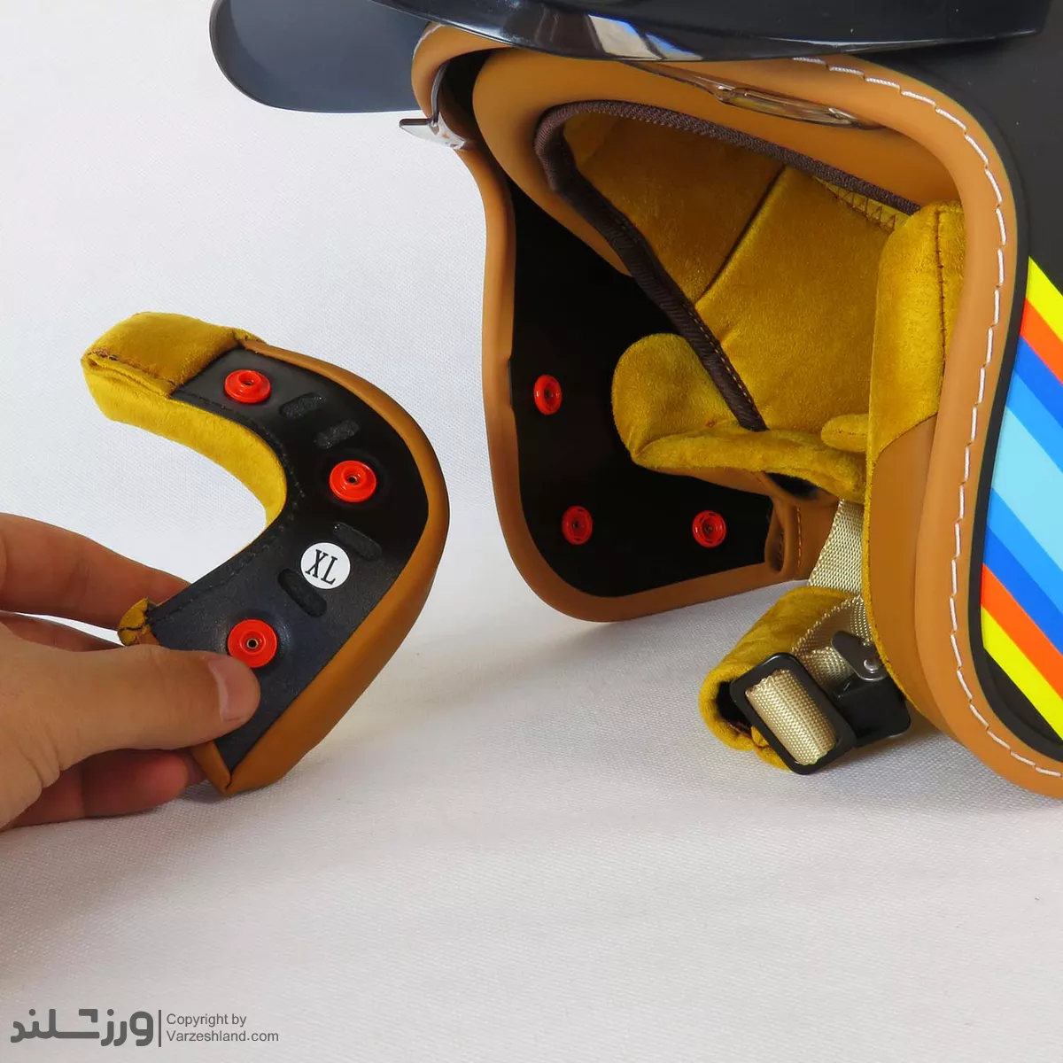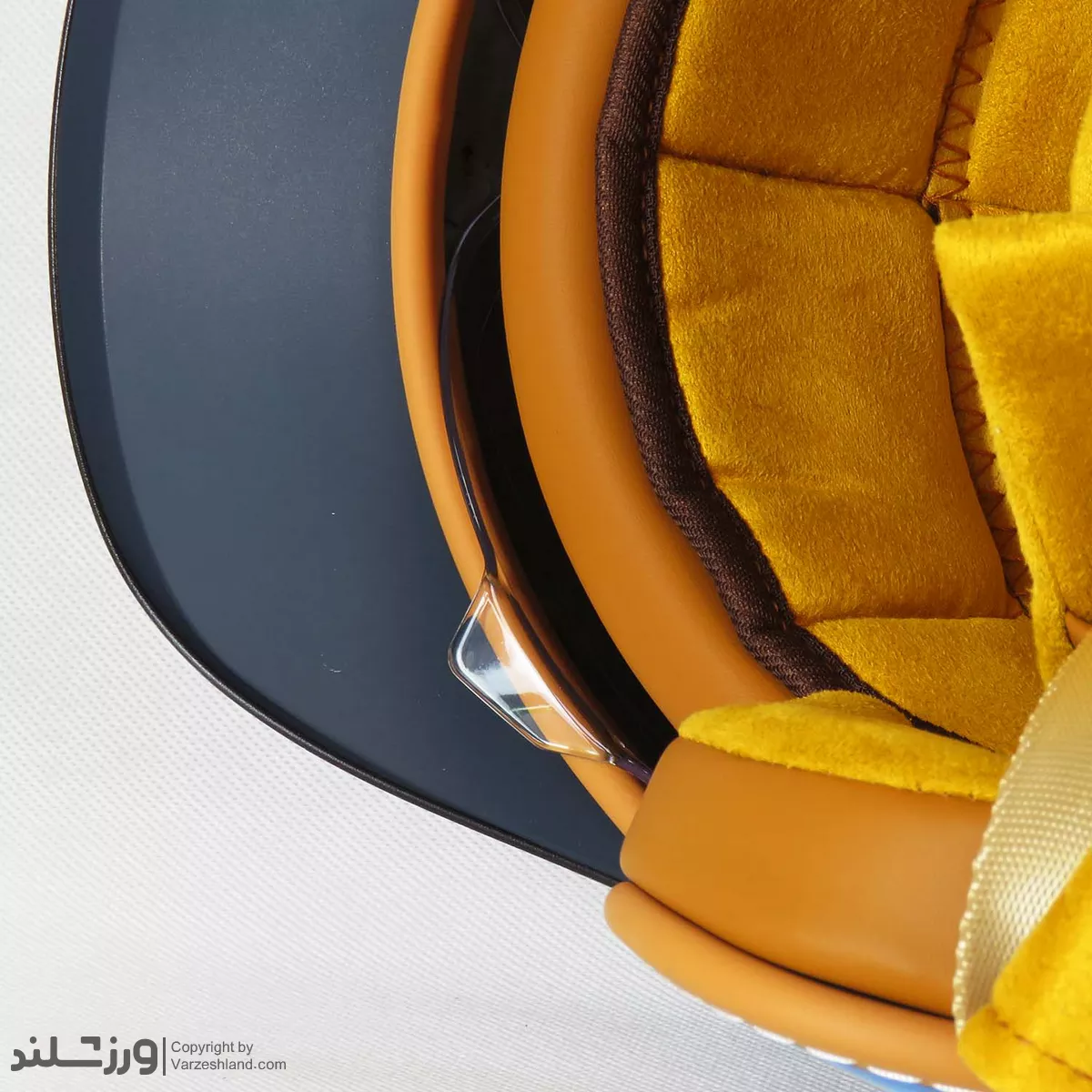 این مدل با سبکی ریترو و نیمه فیس طراحی شده که علاوه بر زیبایی، احساس آزادی و تهویه مناسبتری نسبت به کلاههای فکدار ایجاد میکند. در بخش جلویی کلاه یک ویزور کوتاه آفتاب گیر نصب شده که از چشم در برابر نور مستقیم محافظت کرده و در عین حال دید کامل را حفظ میکند. استفاده از لبه چرمی تقویتشده به همراه دوخت تمیز و باکیفیت، علاوه بر زیبایی، مقاومت کلاه را نیز افزایش میدهد. بند قفل شوندهی این کلاه از نوع Quick Release است که باز و بسته شدن آن را بسیار سریع و راحت میکند.