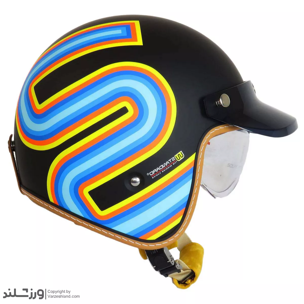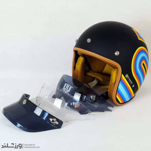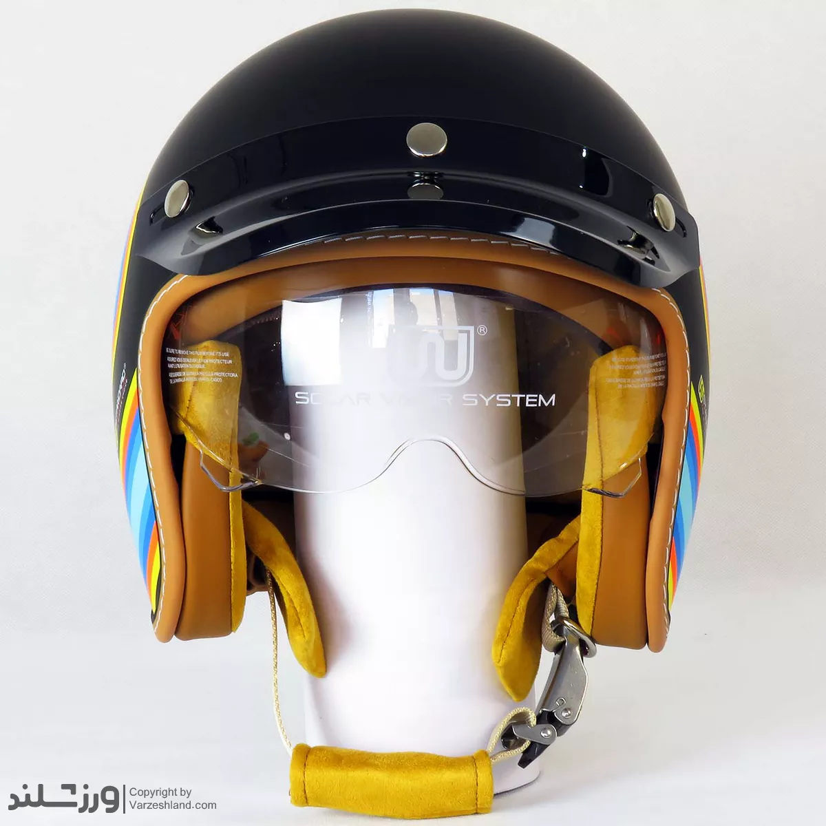 این مدل با سبکی ریترو و نیمه فیس طراحی شده که علاوه بر زیبایی، احساس آزادی و تهویه مناسبتری نسبت به کلاههای فکدار ایجاد میکند. در بخش جلویی کلاه یک ویزور کوتاه آفتاب گیر نصب شده که از چشم در برابر نور مستقیم محافظت کرده و در عین حال دید کامل را حفظ میکند. استفاده از لبه چرمی تقویتشده به همراه دوخت تمیز و باکیفیت، علاوه بر زیبایی، مقاومت کلاه را نیز افزایش میدهد. بند قفل شوندهی این کلاه از نوع Quick Release است که باز و بسته شدن آن را بسیار سریع و راحت میکند.