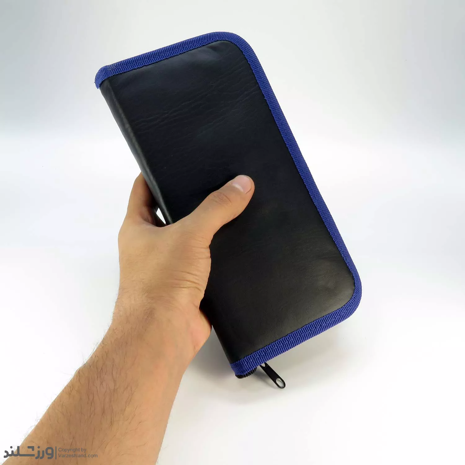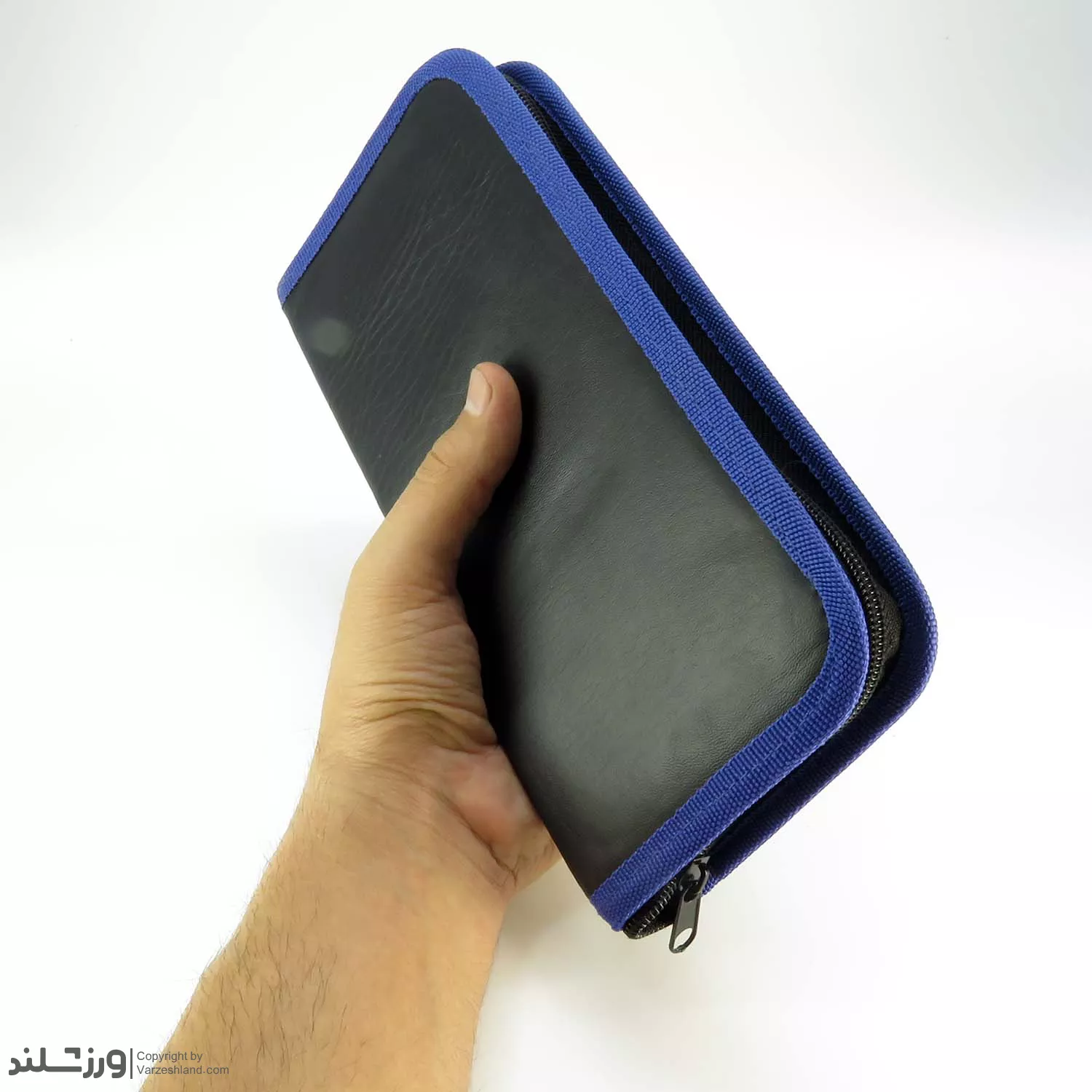 بدنه ی کیف از پارچه برزنتی مقاوم با دوخت محکم ساخته شده که در برابر ضربه، رطوبت و سایش مقاوم است. این کیف آچار به صورت زیپی باز و بسته میشود و داخل آن به کمک کش های نگهدارنده، هر ابزار در جای مخصوص خود قرار می گیرد تا هنگام حمل یا باز کردن درب، هیچ ابزاری از جای خود خارج نشود. رنگ مشکی داخلی و لبههای آبی، جلوهای حرفهای و شکیل به این کیف داده است.