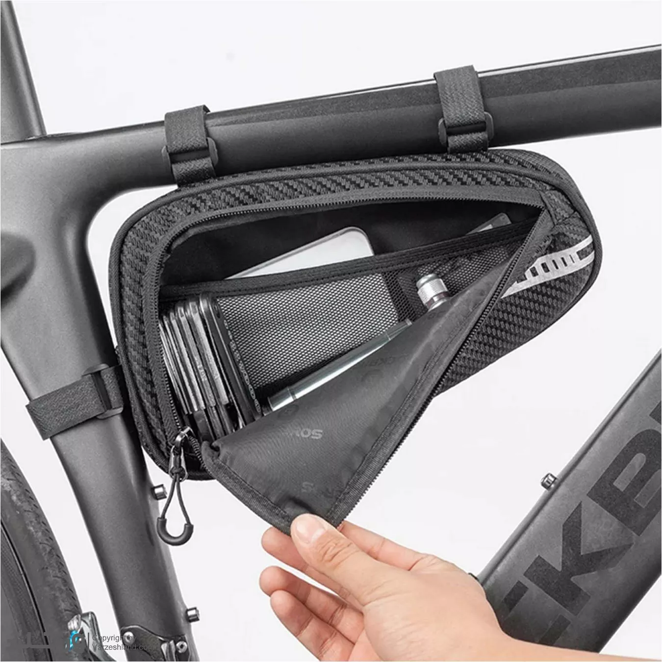کیف فریم ضدآب راک براس به کمک بندهای ولکرو مقاوم و قابل تنظیم بهراحتی روی فریم دوچرخه یا قسمت های مناسب موتور سیکلت نصب میشود و بدون نیاز به ابزار خاص، اتصال محکم و مطمئنی دارد.